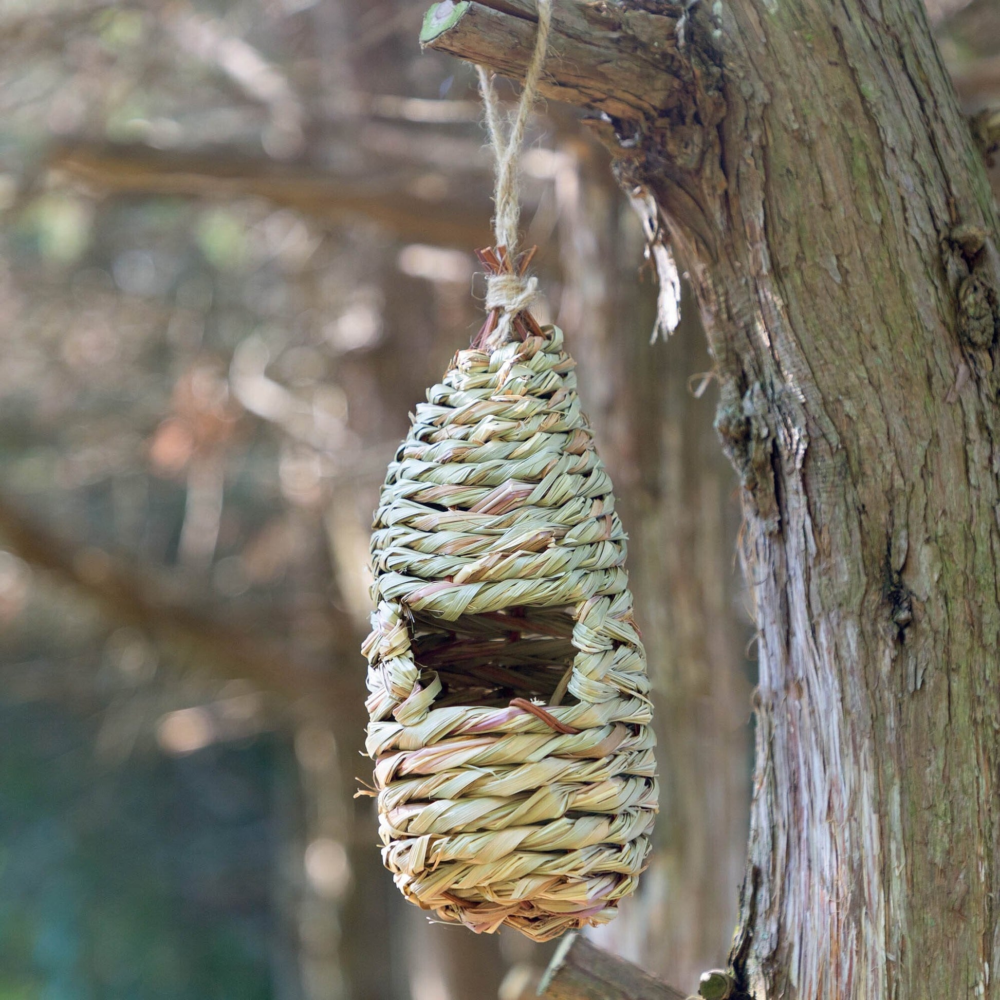 A small shelter gives shelter for a bird to stay safe. Made out of reed grass it is especially favored by non-migrating song-birds during the winter months. This roosting pocket provides natural ventilation and drainage, and is designed to blend into natural surroundings, while the rough exterior provides an easy entry and exit for the birds.
