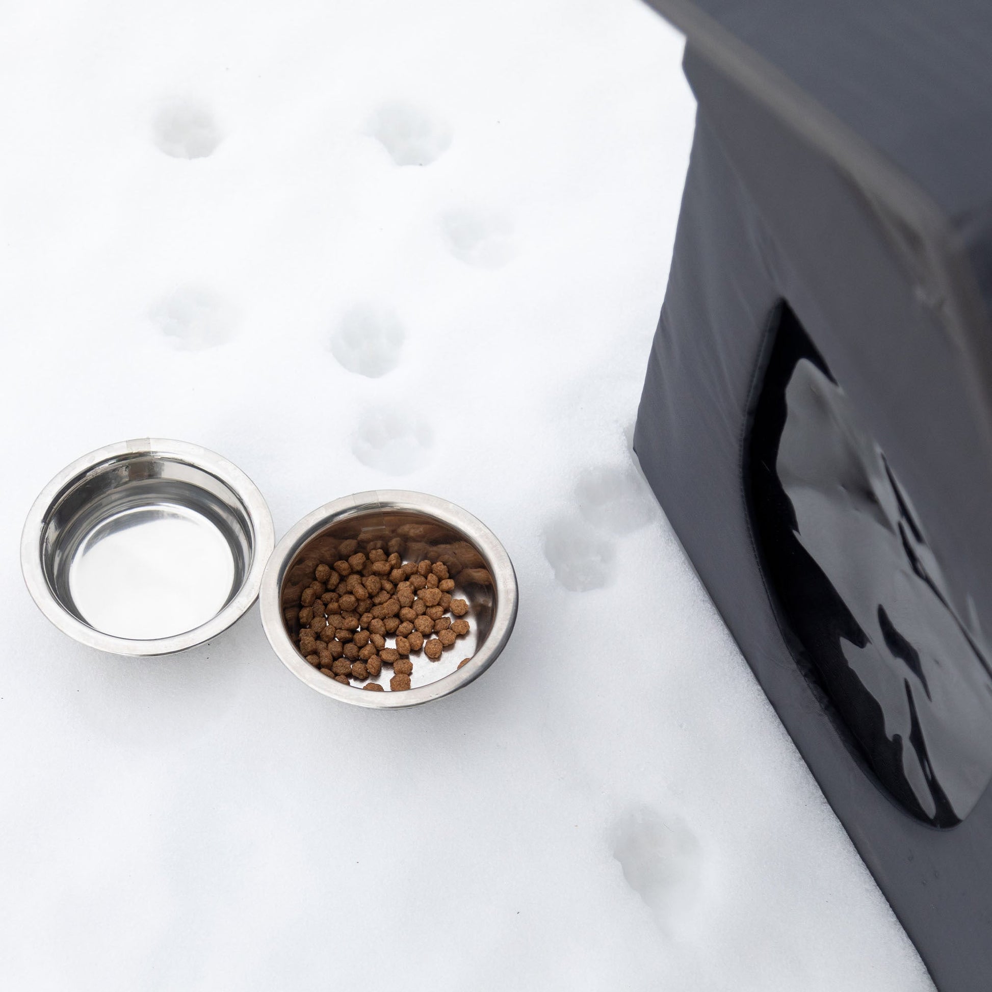 Send Comfort & Supplies by providing the cat community with a clean and suitable outdoor cat house, plus two cat food/water bowls.
