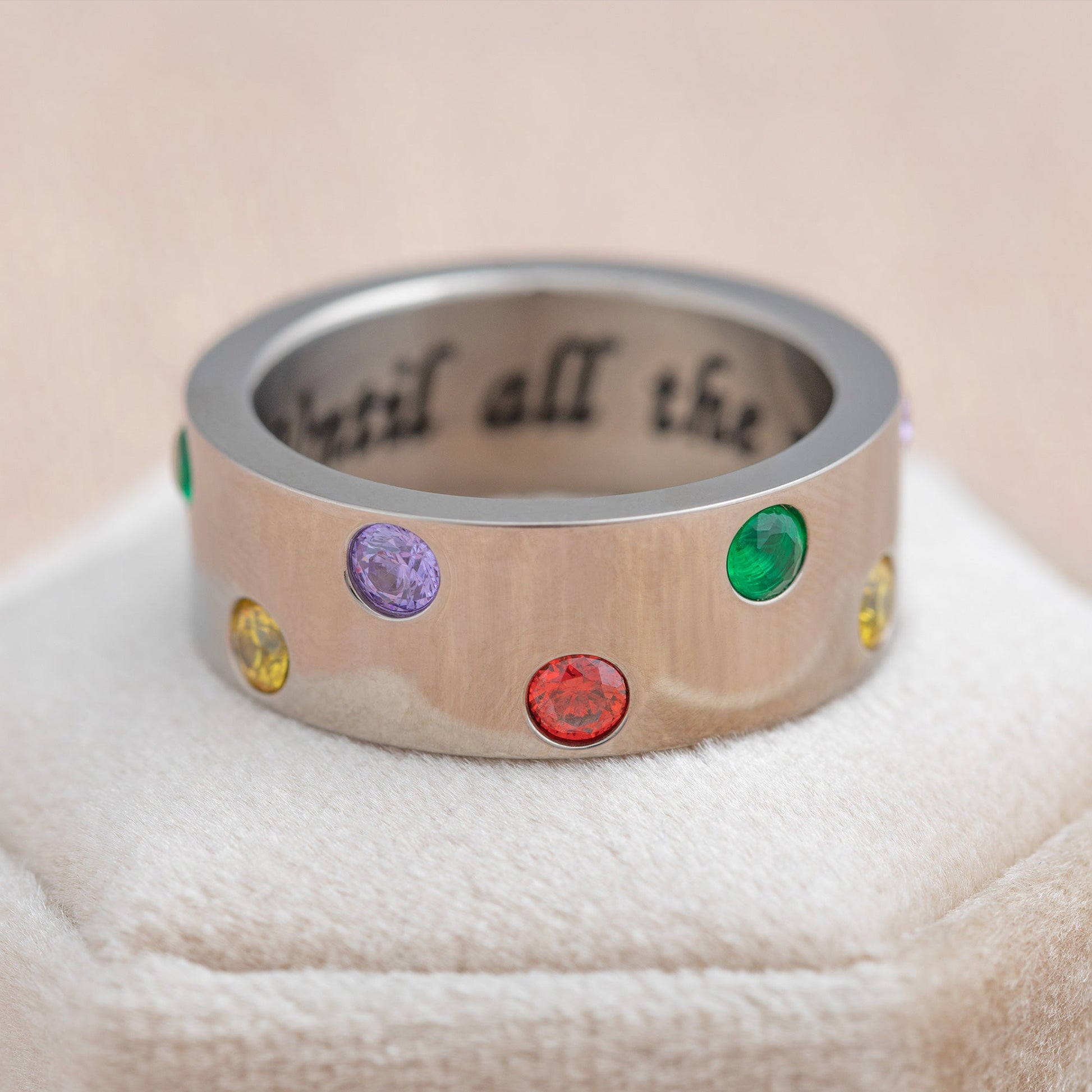 A piece here, a piece there...everyone on the spectrum makes an important contribution as the puzzle of autism falls into place. Graced with colorful crystals, this titanium ring bears the message "Until all the Pieces Fit" inside the band -- a promise that understanding is growing every day.