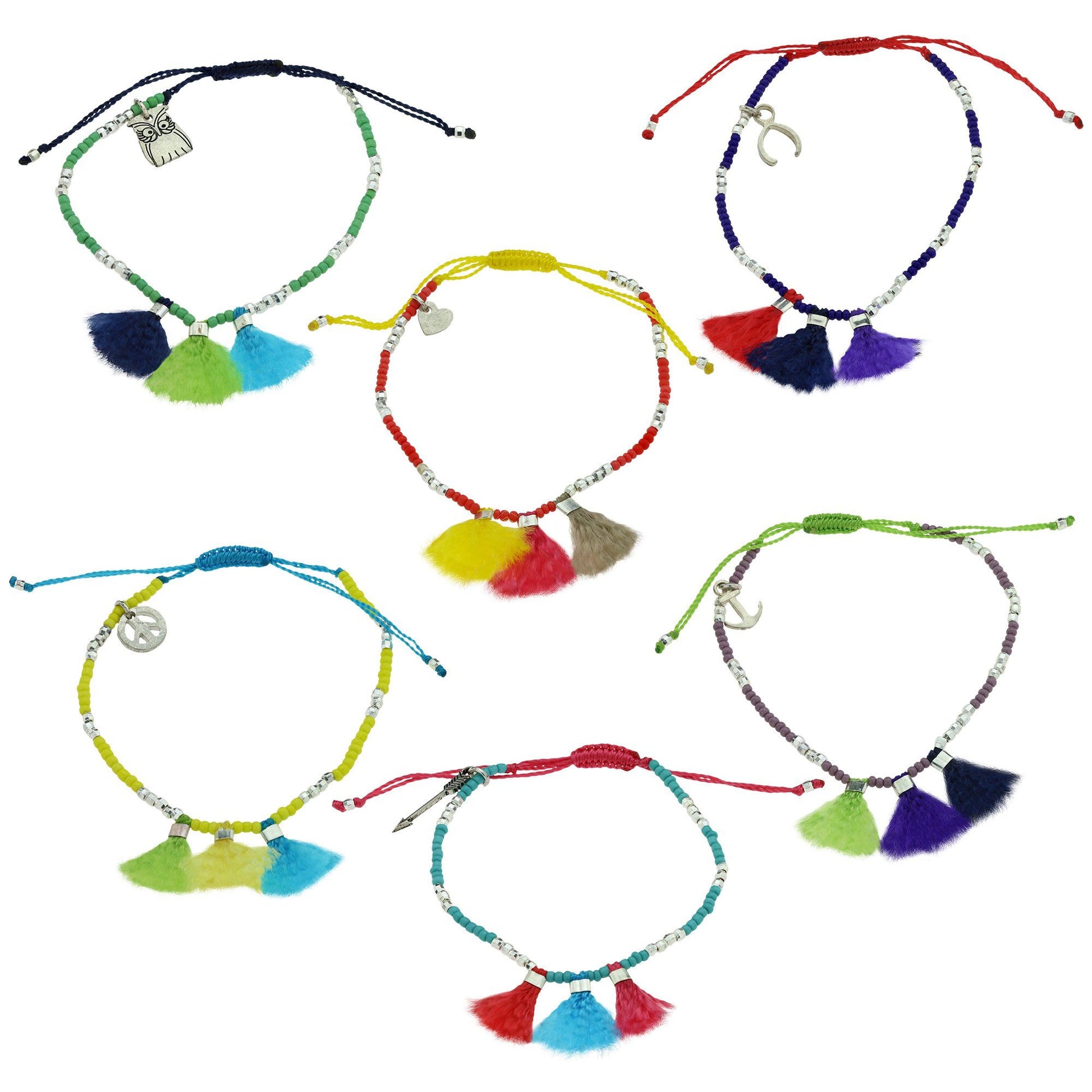 Each tassel bracelet has a tiny charm: an owl for wisdom; an arrow for bravery; a peace symbol for peace; an anchor for hope; a heart for love; and a wishbone for luck. These pair great with our Infinite Inspiration and Infinite Inspiration Statement bracelet collections.