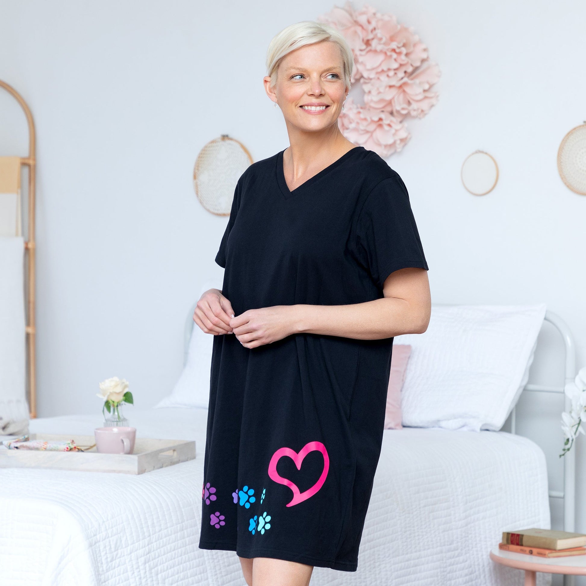 When it's time to turn in for the night, no-frills is the way you prefer. This cotton pullover nightgown has you covered, with its simple cut, v-neck, and easy care. Designed exclusively for The Animal Rescue Site, it's finished with a straight-forward image for the path to your heart: it's paved with paws!