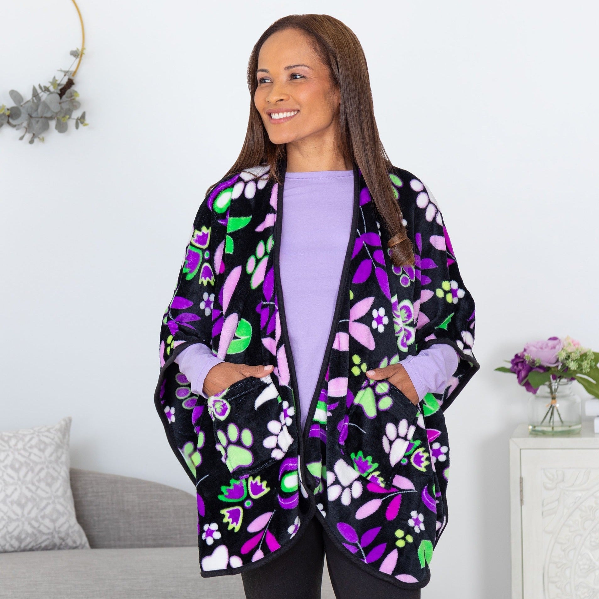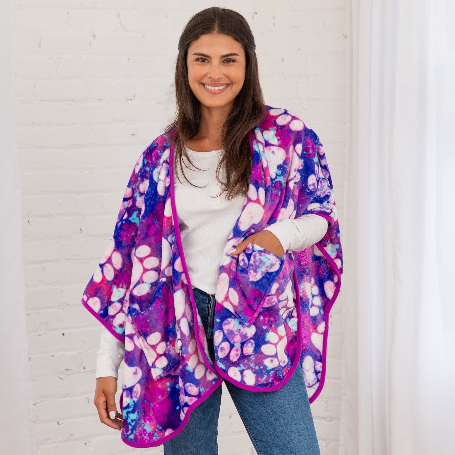 Made with a soft, lightweight fleece, this colorful wrap is effortlessly thrown over your shoulders for a cozy way to share your dedication to animal causes! Complete with two front pockets for warming up your own paws or carrying your personal items.