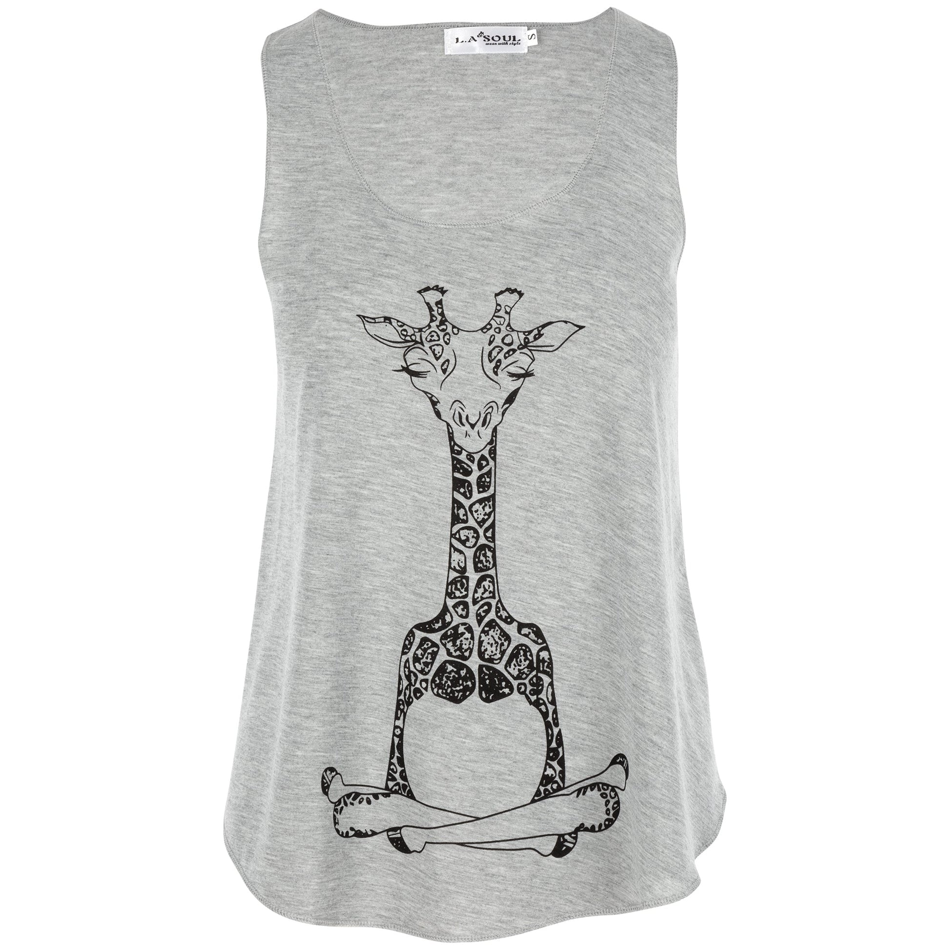 Meditate on this sweet, serene face! A calm, cool, cross-legged giraffe focuses on its mantra on the front of this soft, gray tank. Topped with serged hems all around and a comfortable, casual fit!
