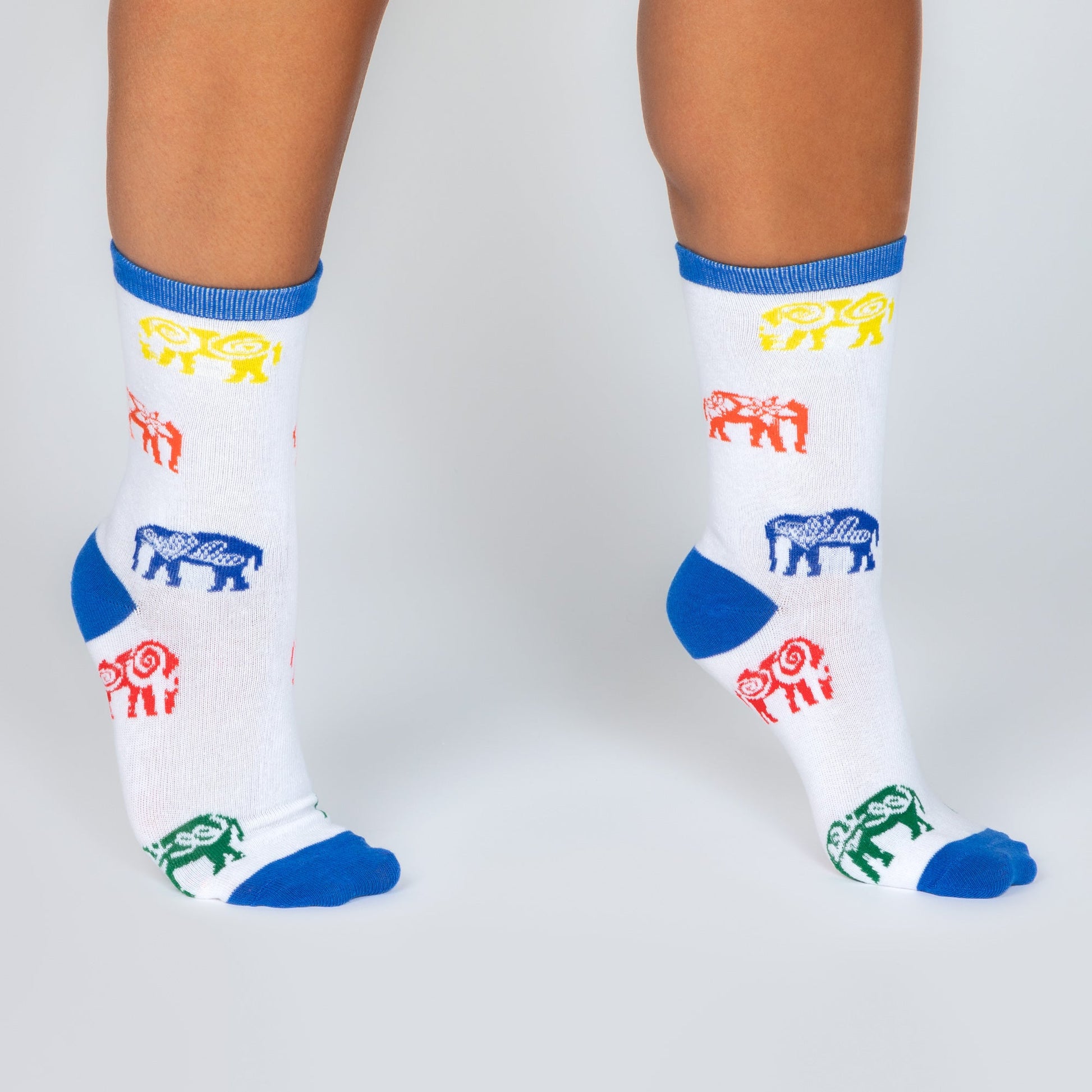 A delightful duo for elephant enthusiasts! With a pair of white and blue socks, or a pair of black ones to choose from -- this sweet pair of stretchy cotton blend socks is patterned in multicolor elephants, overflowing with playful patterns!