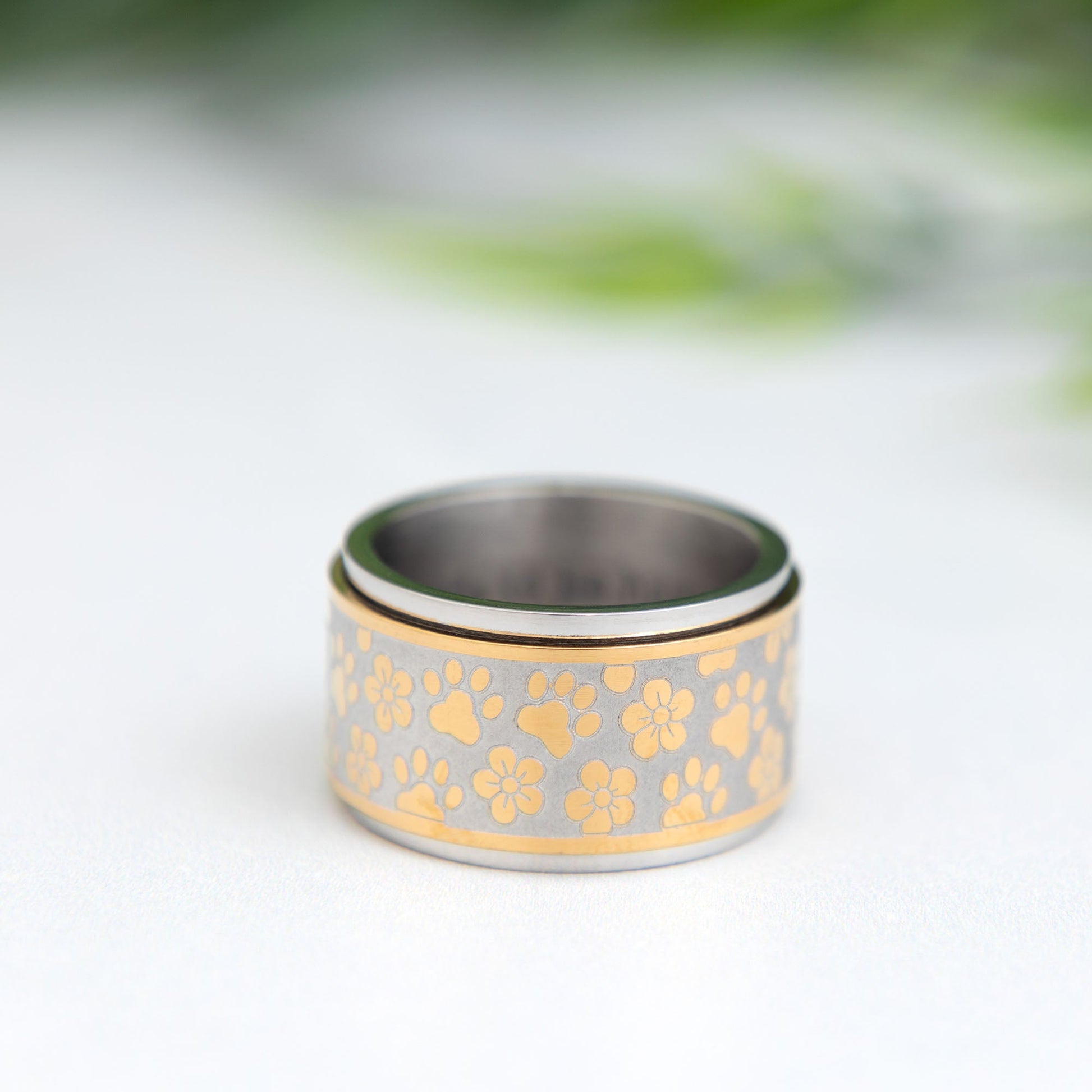 Gold-tone paws and flowers are patterned all around this stainless steel spinning ring. Perfect for keeping your fidgety hands busy, the outer ring spins smoothly around the inner ring, and the inside includes the heartfelt sentiment: "There are so many reasons to be happy... and my happiness has 4 paws ™ "
