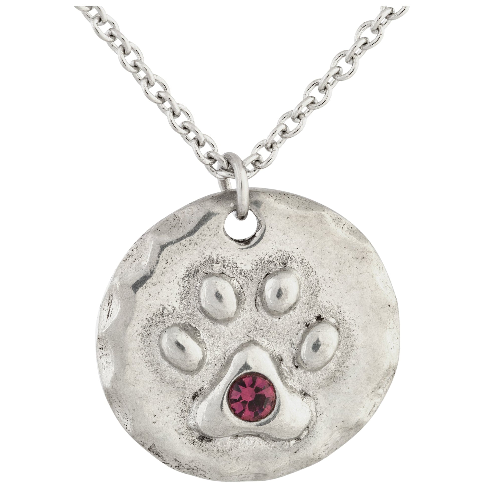 Sweet and heartfelt, this silver-tone pendant is a sparkling symbol of your love for your four-legged soulmate! Featuring a purple rhinestone embedded in a paw print on one side, and a sentiment on the opposite side that shares your connection to your pet.