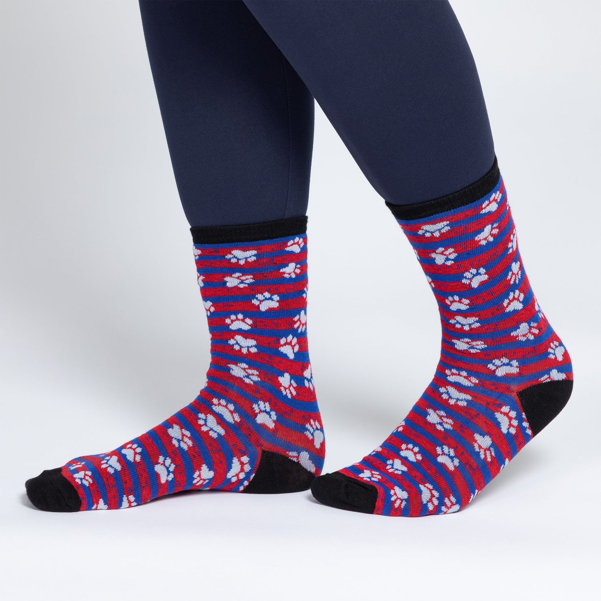 This sweet pair of red and blue striped socks features white paw prints throughout and a solid black top, heel, and toe, and made with a cotton blend with a little spandex for the coziest fit.