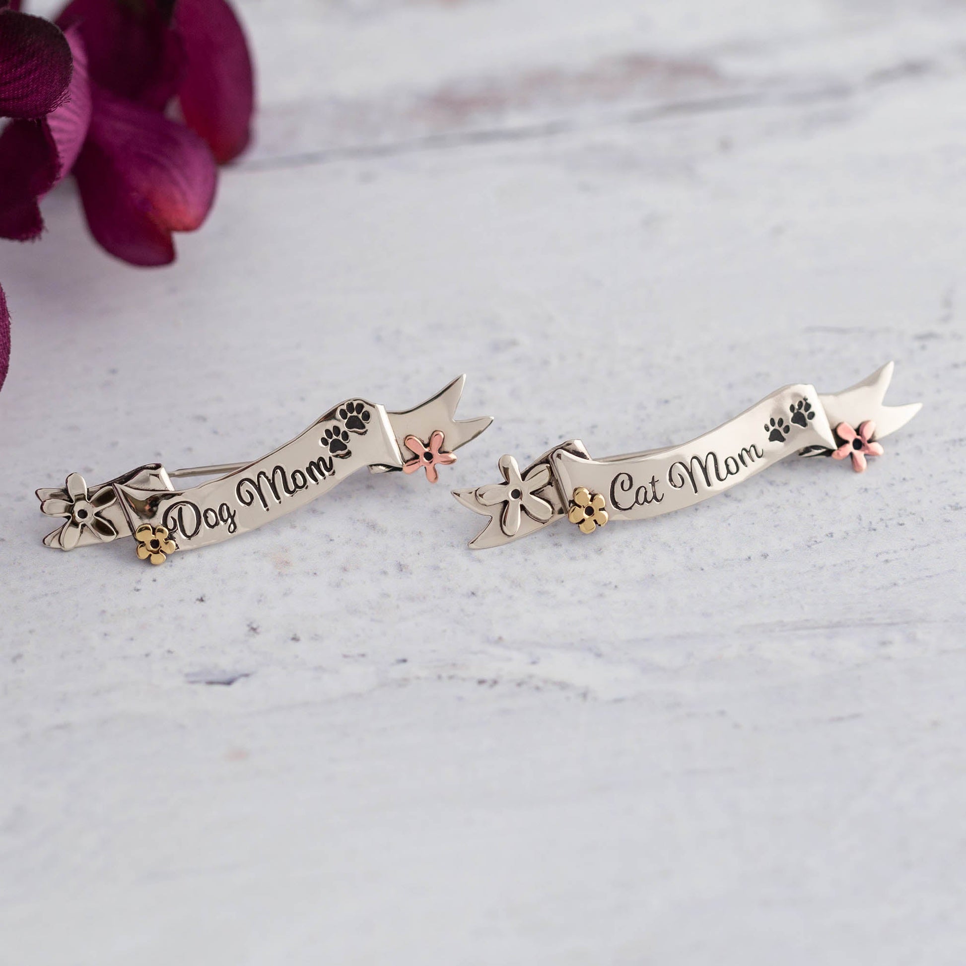 Flowers and paw prints decorate this darling sterling silver banner pin, engraved with your proud parent title! Given as a gift to the woman in your life that you know is the most caring cat mom or doting dog mom, this brilliant mixed metal pin says it all. Handmade by artisans for a beautiful, one-of-a-kind piece.