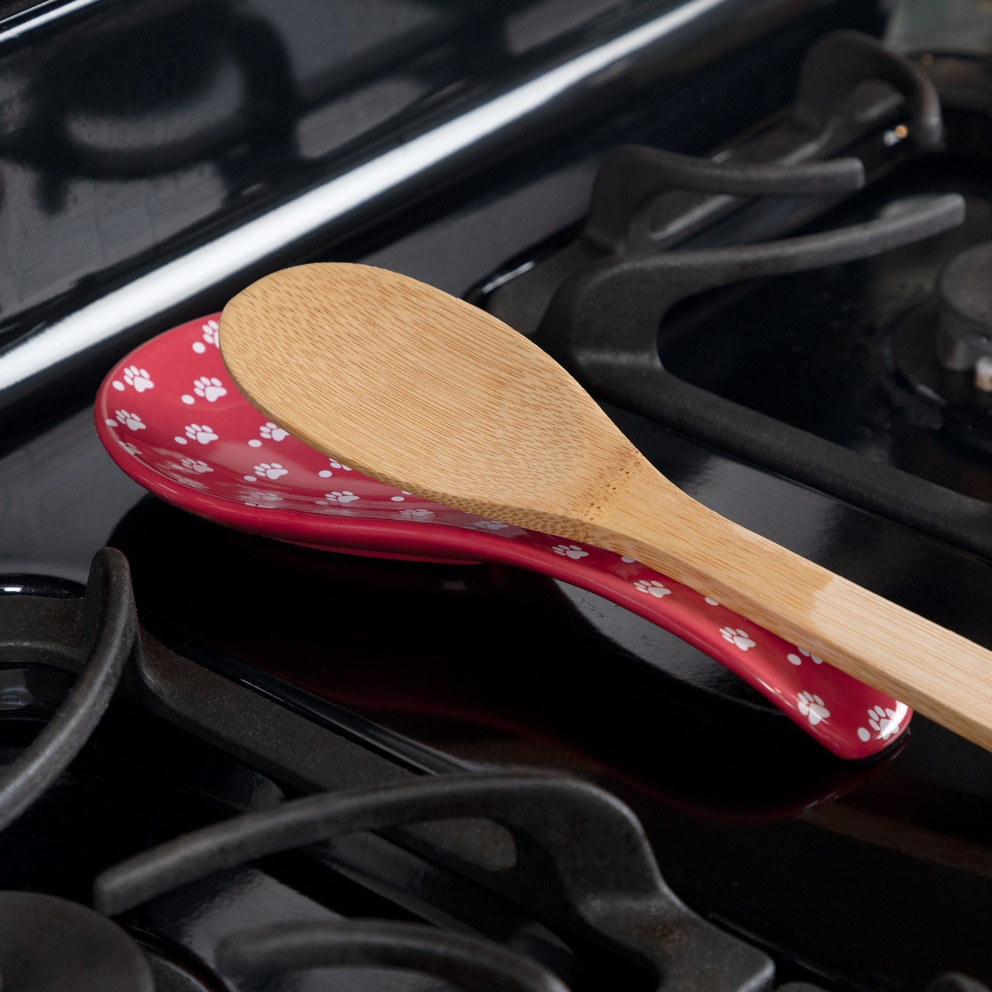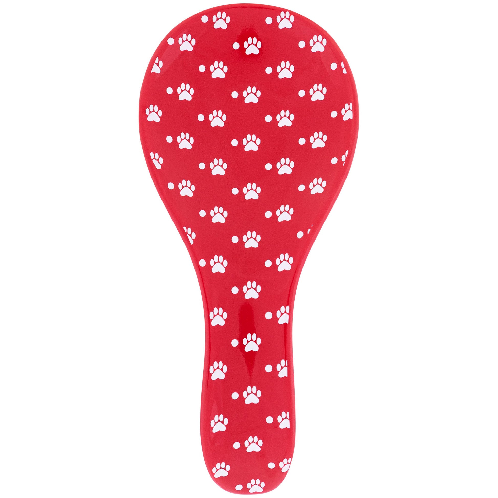 Resting on your stove top or any kitchen surface, this ceramic spoon rest is a must-have for your home! Patterned in a sweet red or blue with white polka-dot paws, this easy to clean spoon rest keeps your cooking utensils at-the-ready and on a clean surface between uses, and protects your stovetop and counter from drips and spills.