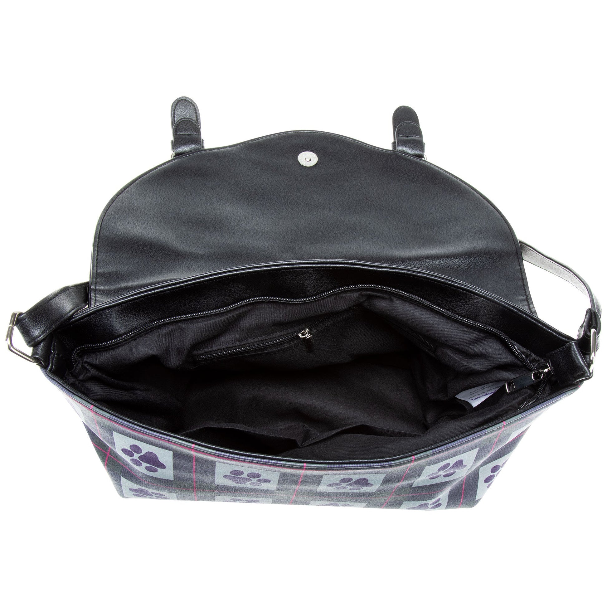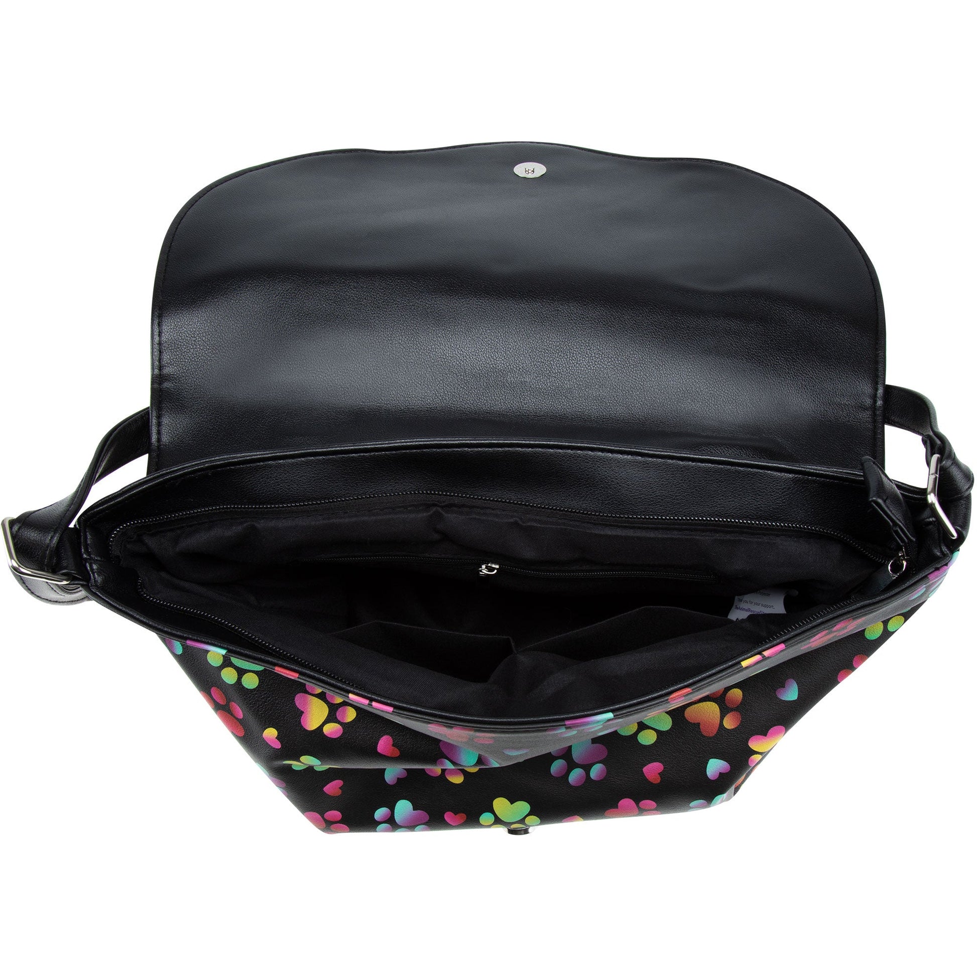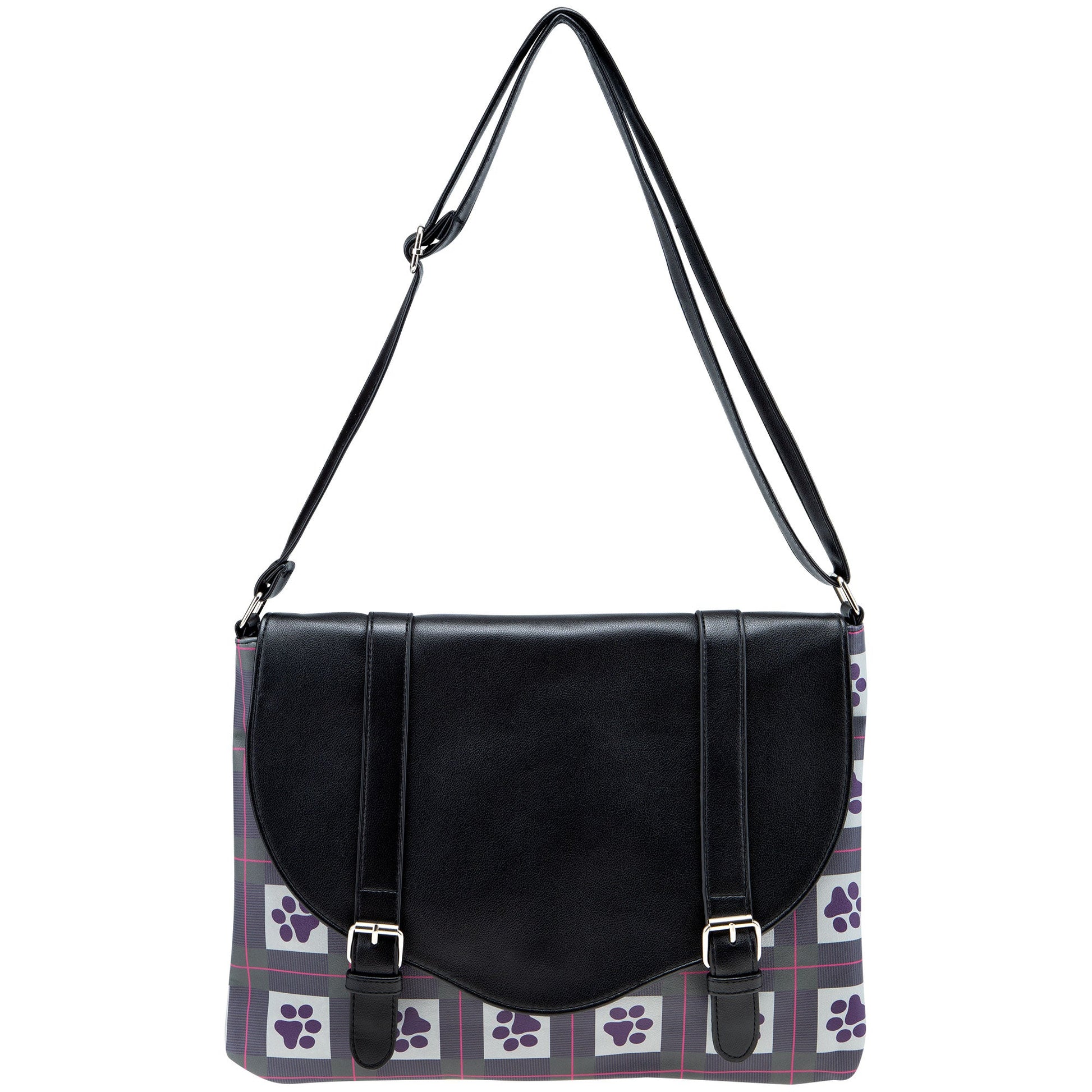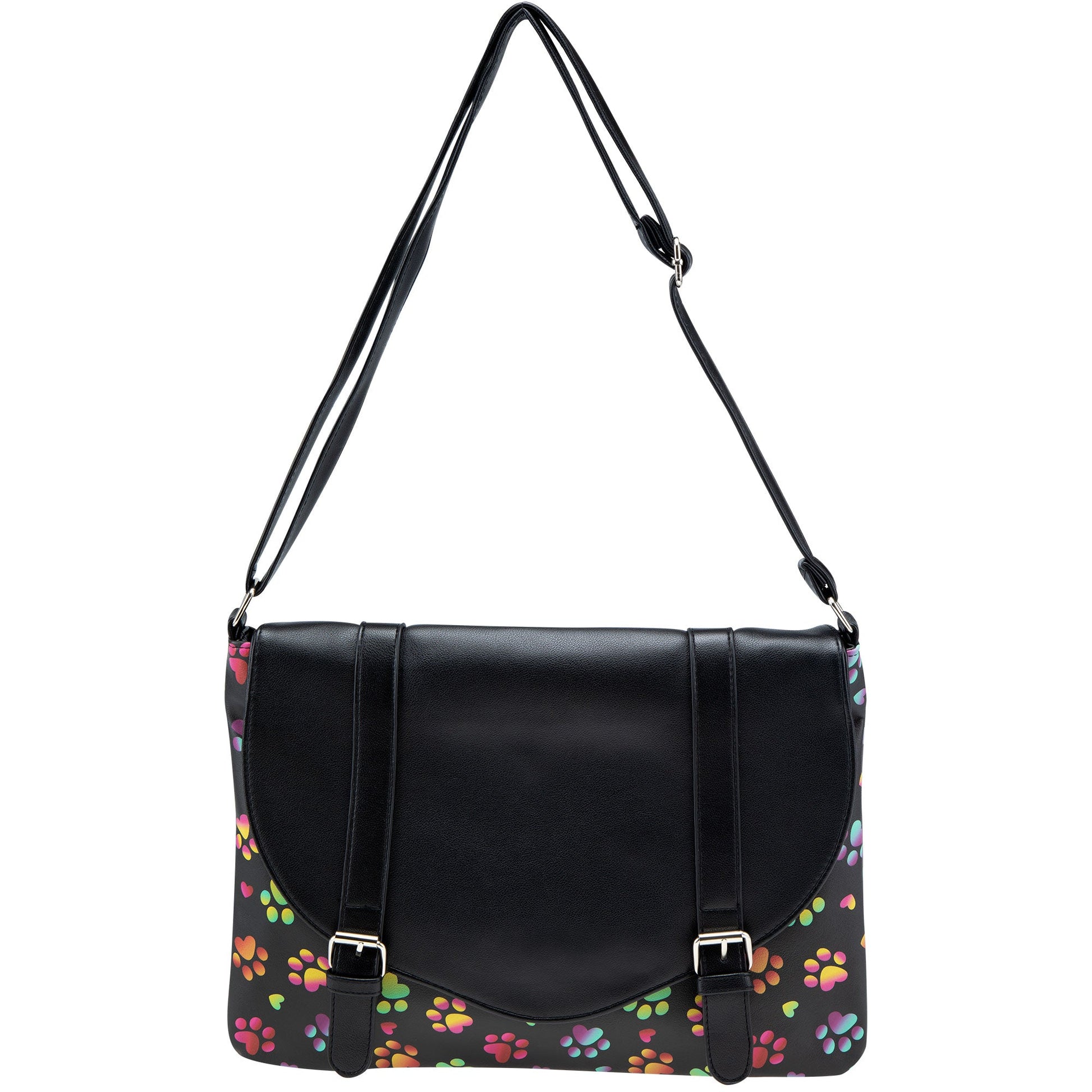 Patterned with ombre paws and hearts or a plaid print with paws, this colorful faux leather purse features a simple black front flap with two decorative buckles that complete your look. Made with an assortment of interior and exterior pockets for maximum organization, and an adjustable shoulder strap so you can adjust to your perfect length.