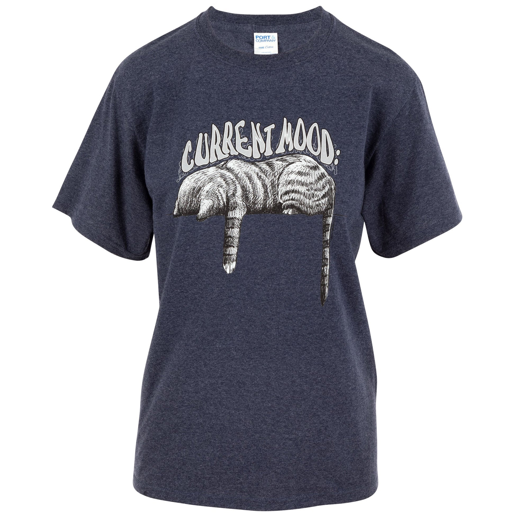 Your current mood is best depicted on this unisex tee. Depicting a sleeping cat with its face down and hanging paw and tail droop under the phrase which reads "current mood." This heathered crew neck tee is a playful representation of your inner attitude.