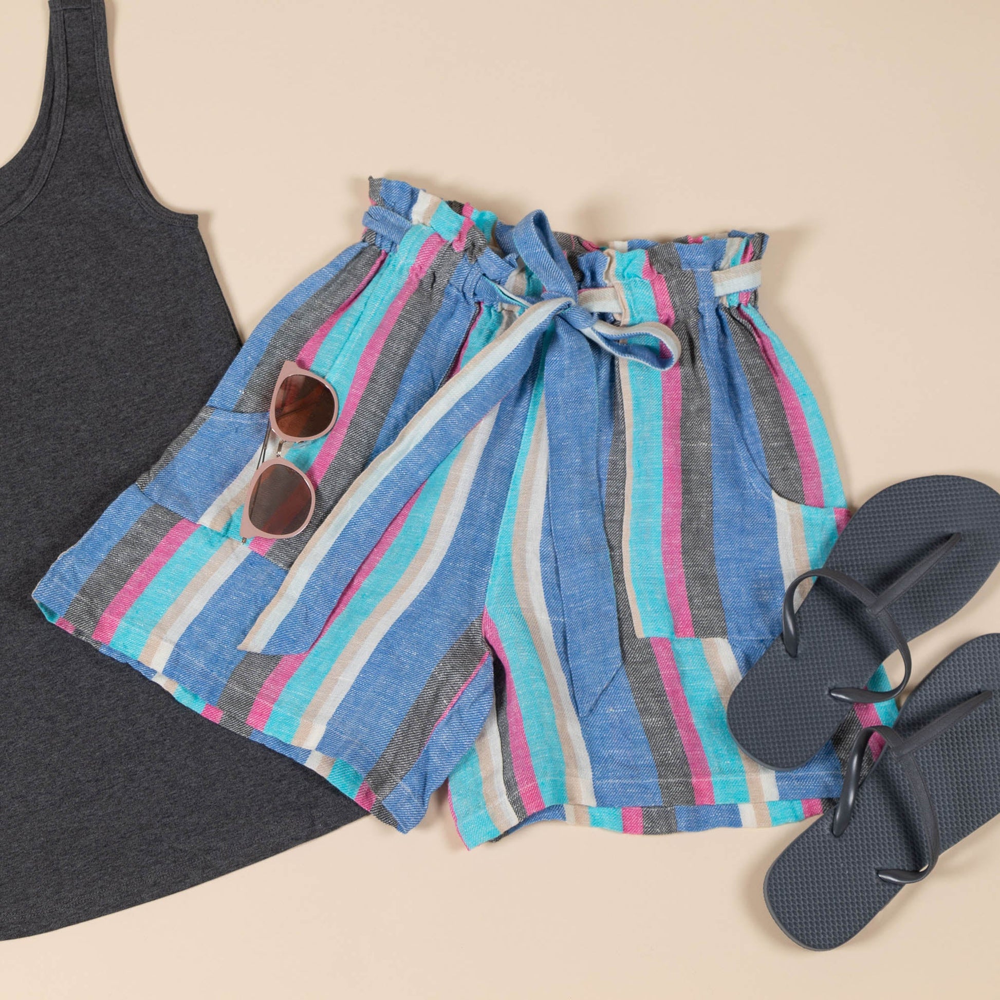 Stripes of color make this soft linen pair of shorts a colorful addition to your wardrobe! Featuring an elastic waist with a charming tie belt that creates a perfect fit, and two sizable front pockets. Lightweight and breezy, this handmade pair feels soft to the touch and they help support the artisans who made them.