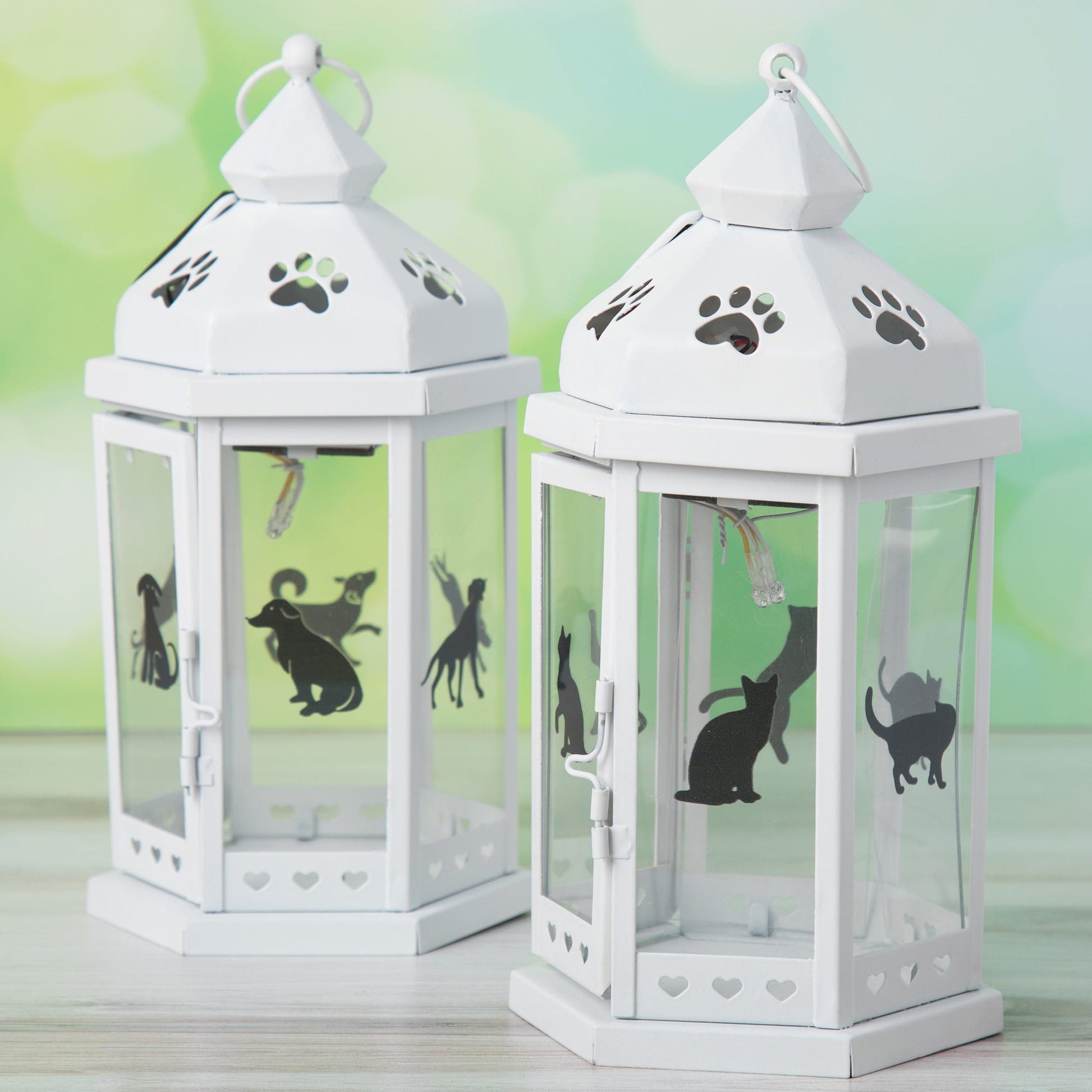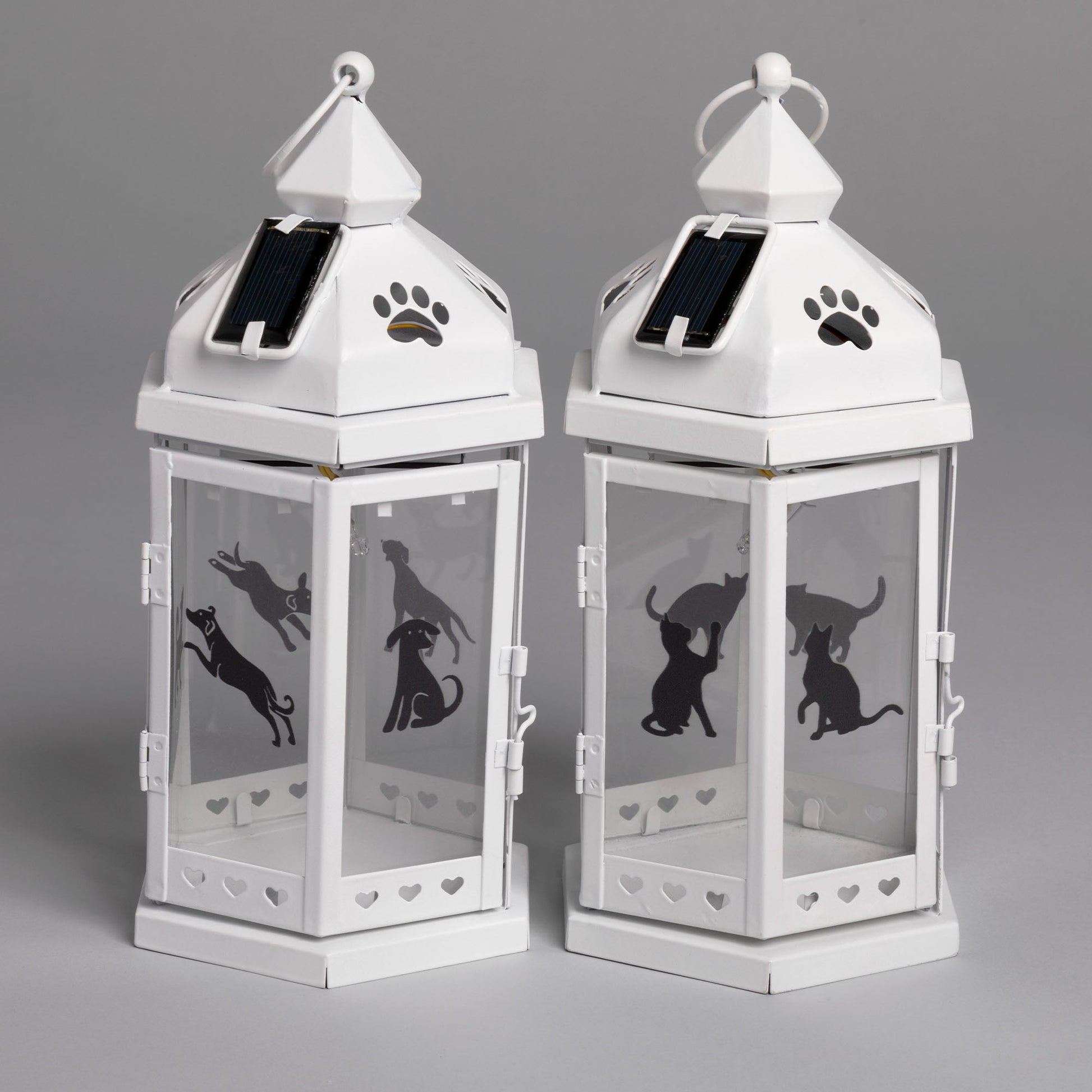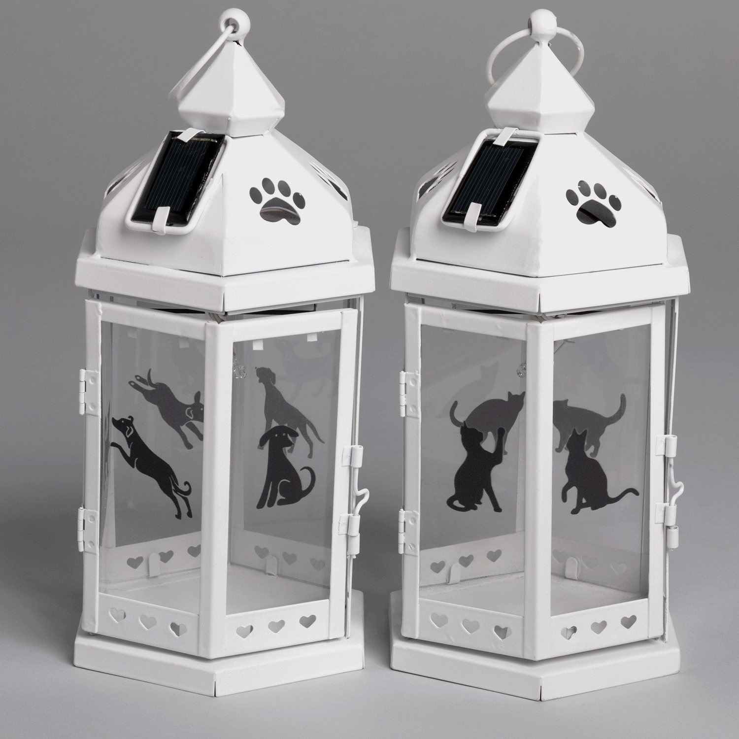 This soft white hanging solar lantern brightens any space with a warm sun-powered glow! Featuring plastic window panels with dog or cat silhouettes that surround the lantern on all sides, forming a shadow image onto surrounding surfaces when it is lit. Paw prints are cutout all along the top, while small decorative hearts are cutout from the bottom trim for a truly heartwarming piece of outdoor decor!
