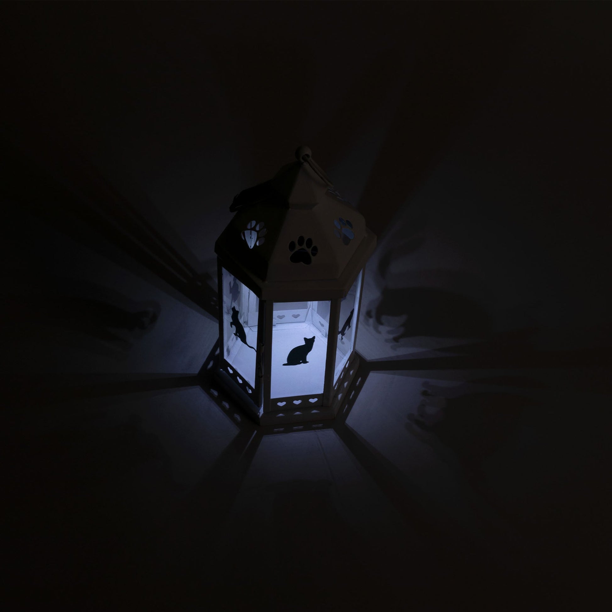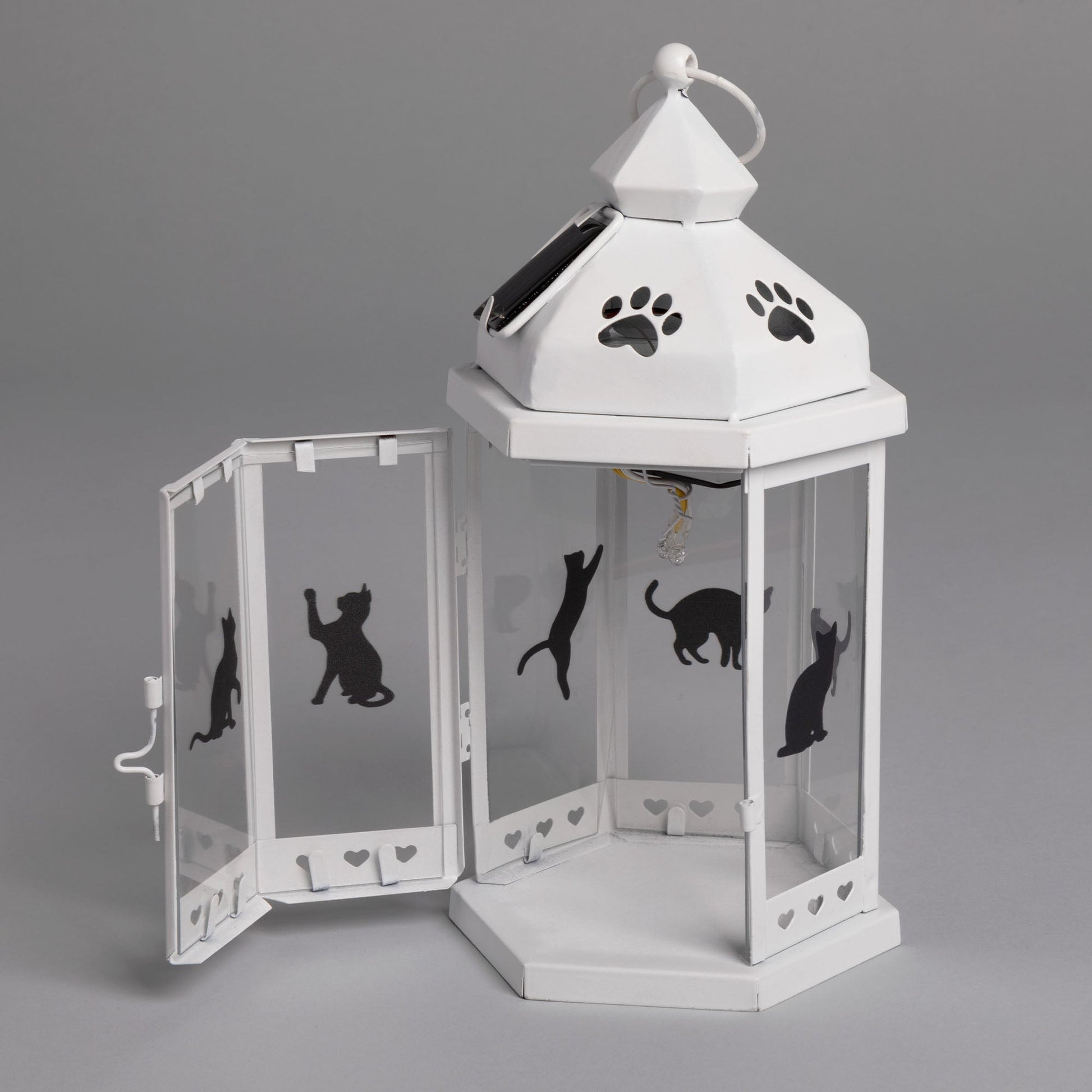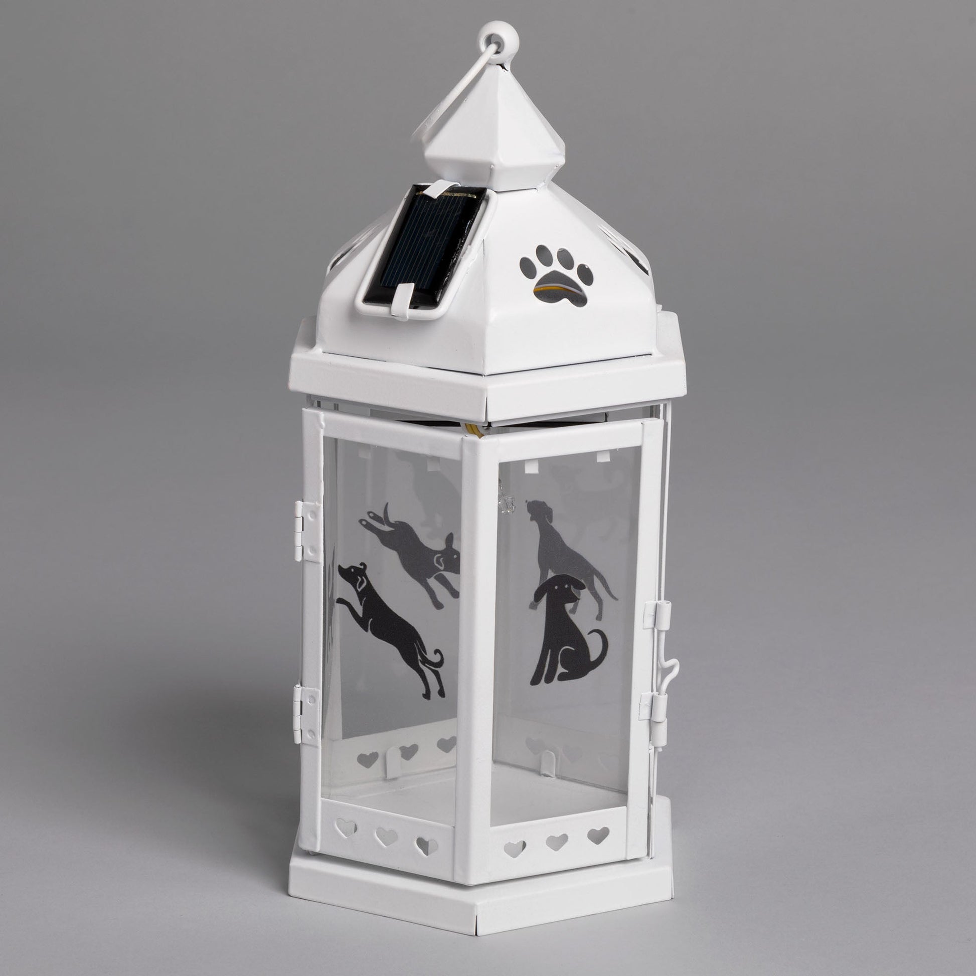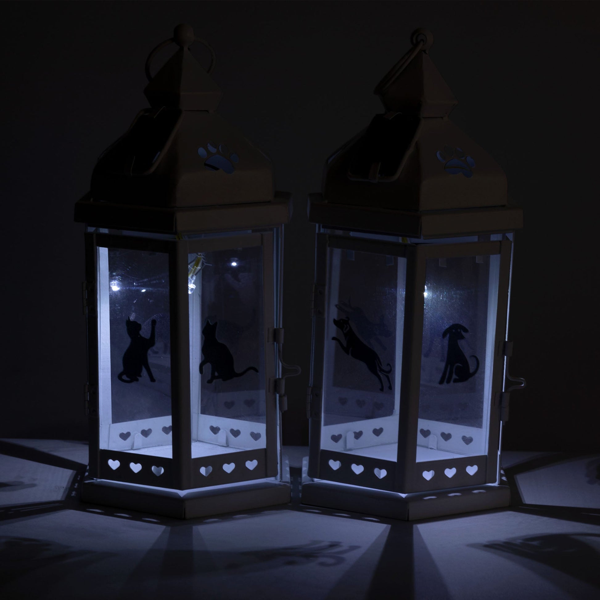 This soft white hanging solar lantern brightens any space with a warm sun-powered glow! Featuring plastic window panels with dog or cat silhouettes that surround the lantern on all sides, forming a shadow image onto surrounding surfaces when it is lit. Paw prints are cutout all along the top, while small decorative hearts are cutout from the bottom trim for a truly heartwarming piece of outdoor decor!