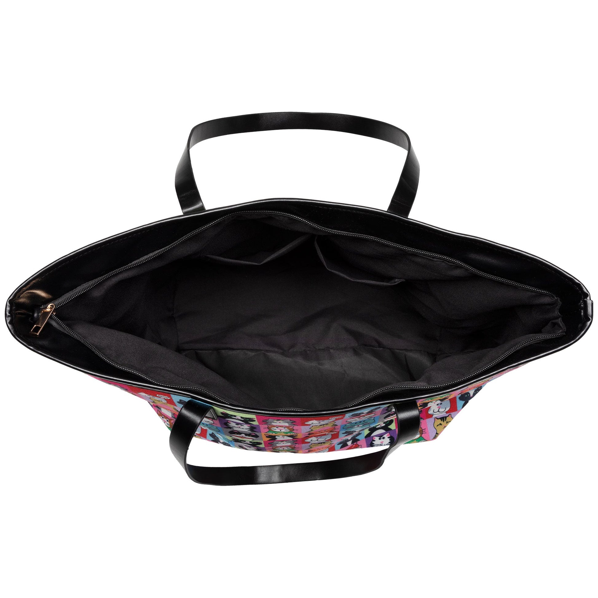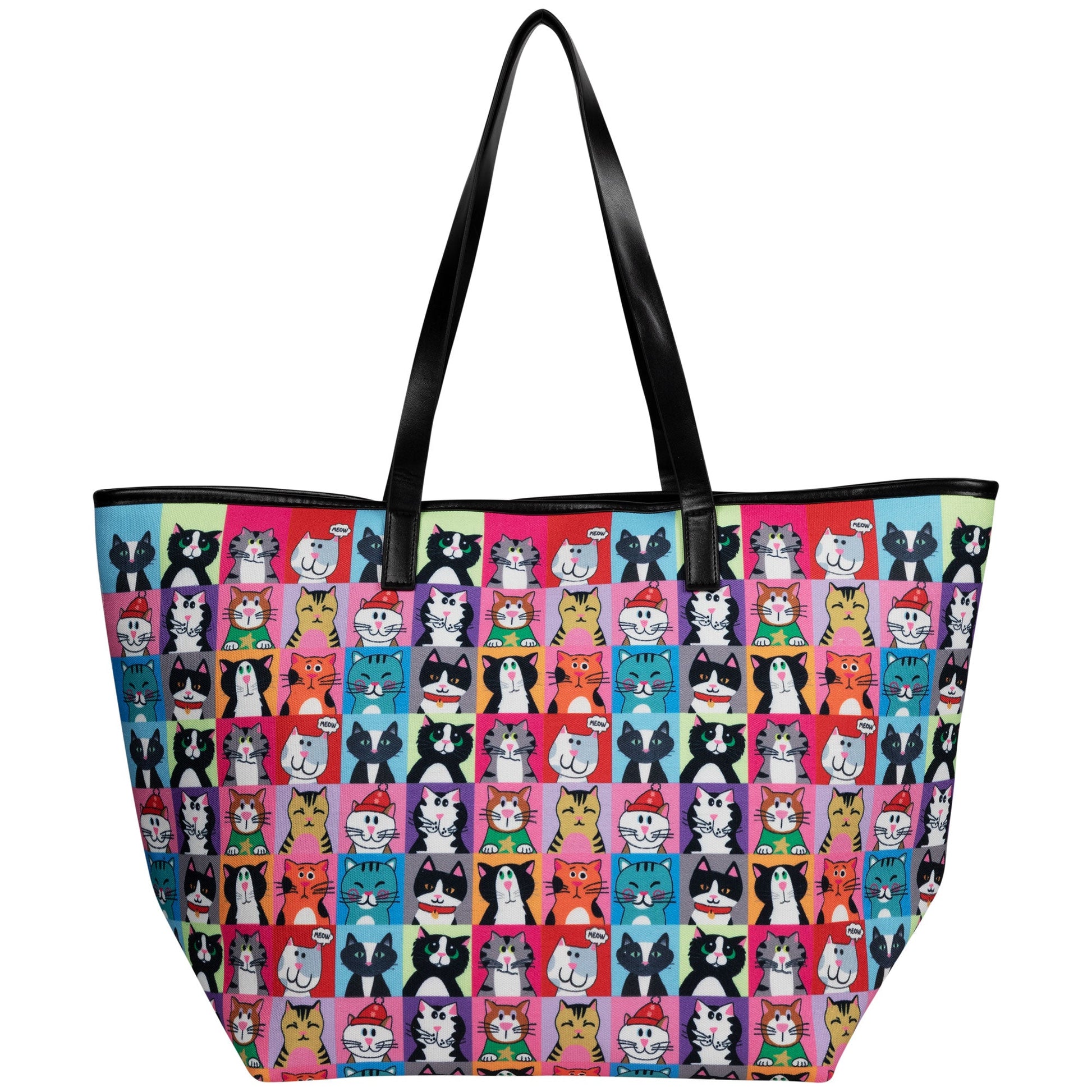 The everyday usability of canvas meets the colorful custom Pet Portrait design in this sweet carry-all! Patterned with a colorful grid of cats, this sizable bag is made with durable canvas and topped with the elevated touch of faux leather handles and trim. Complete with a zipper closure on the top, a zipper pocket inside, as well as two open pockets inside -- keeping your phone or cards easily accessible.