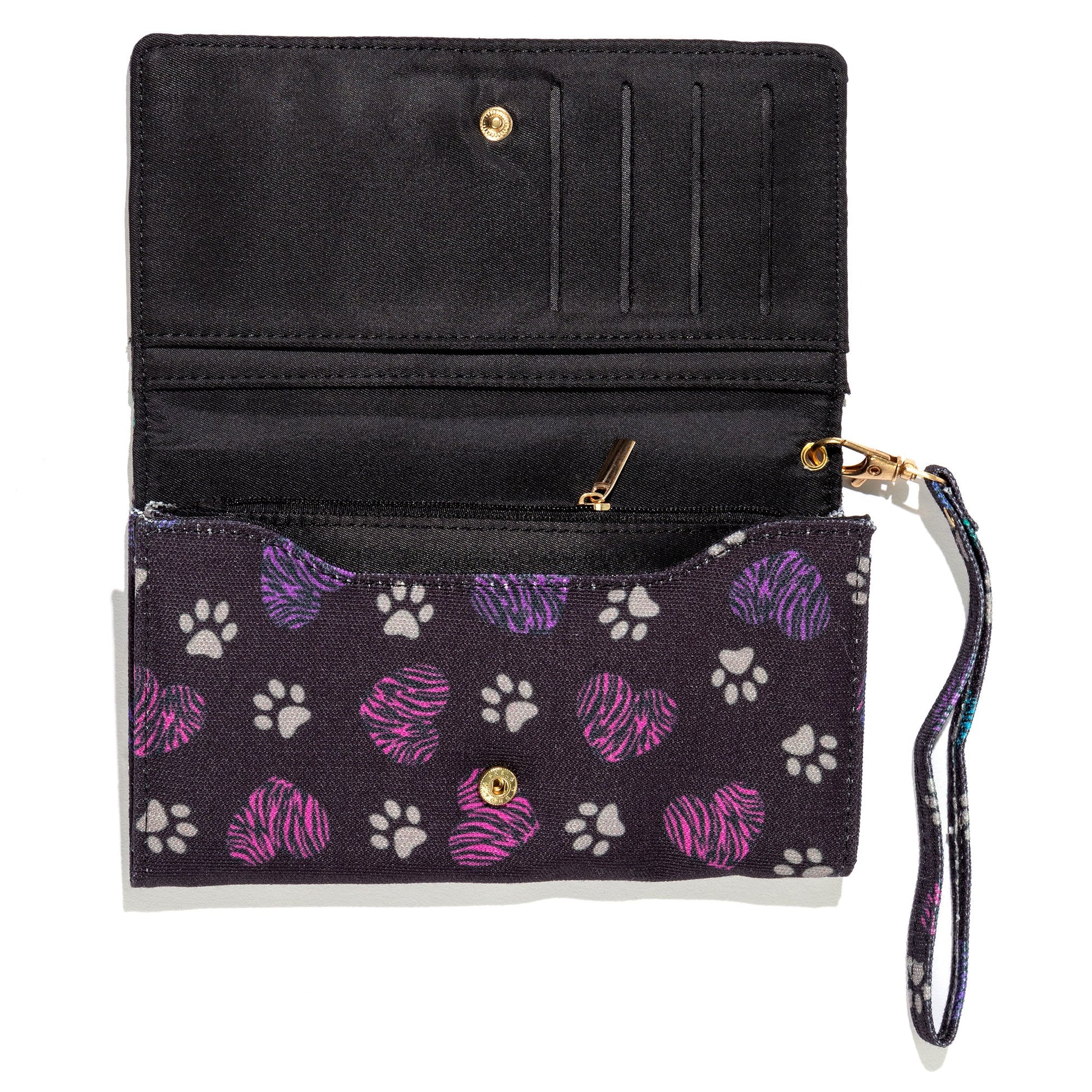 The perfect wristlet for carrying your everyday essentials with a side of animal advocacy! Made with a sturdy canvas outer, this wristlet wallet zips closed to keep your items secure, and features card and cash slots, with a zipper pouch, and a pretty paw-print pattern.