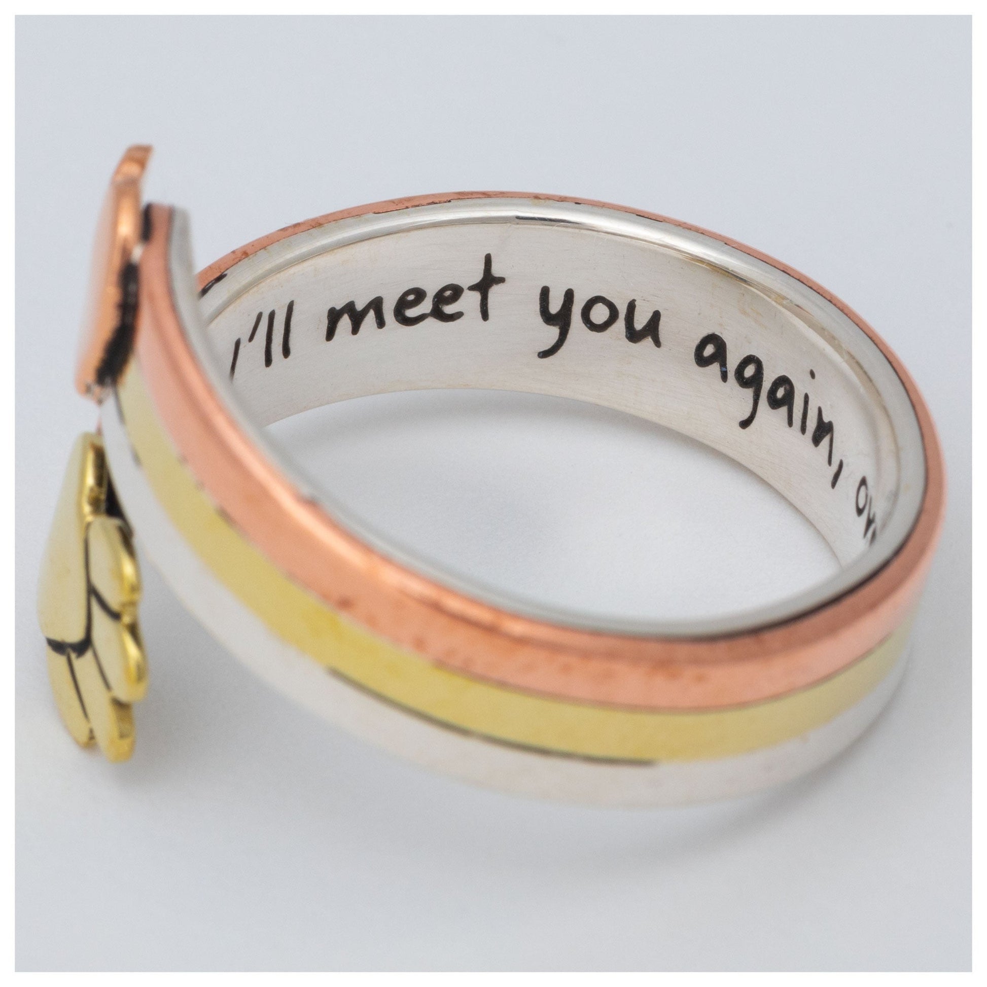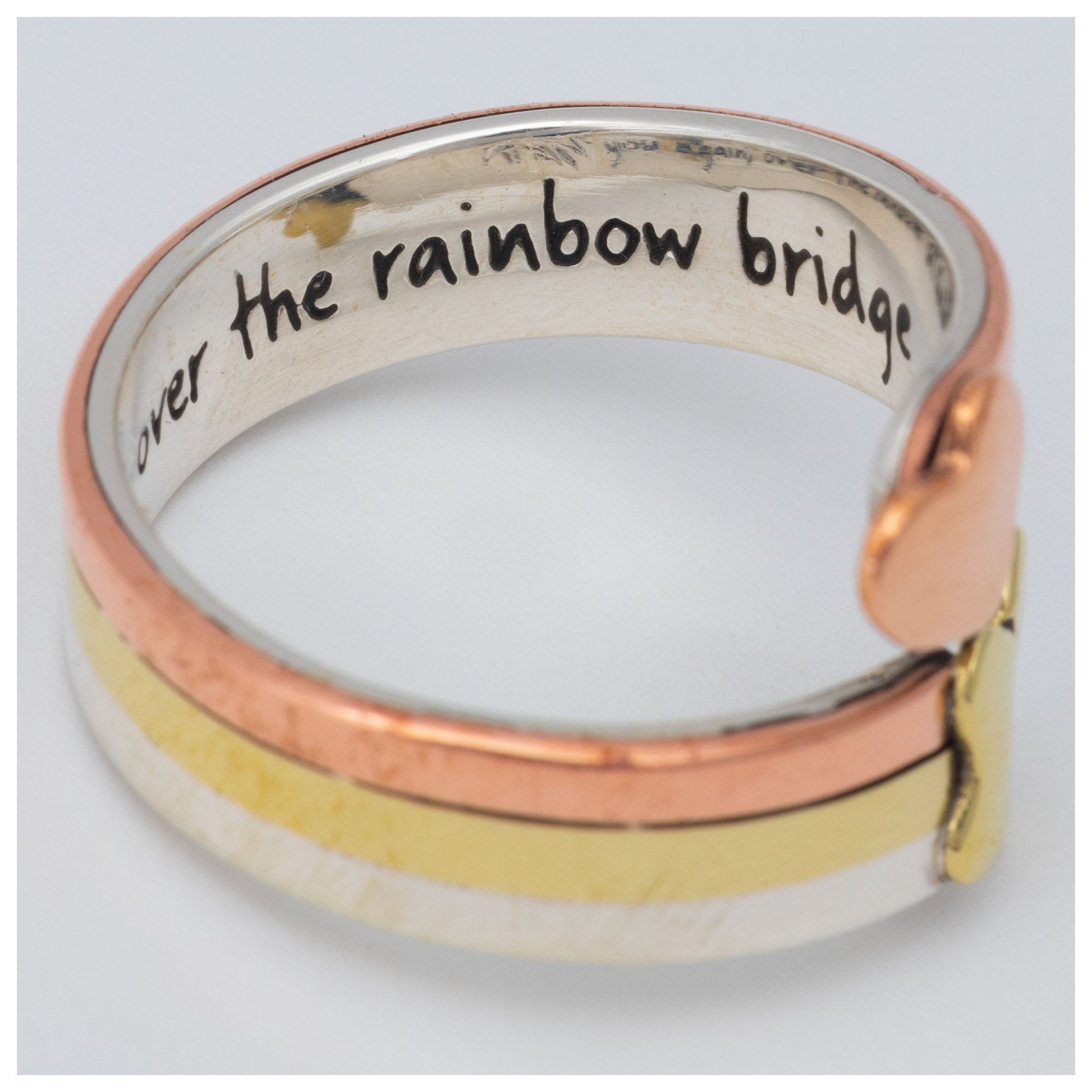 Gazing at your beautiful mixed metal ring featuring sterling silver, copper, and brass, you honor your beloved four-legged friend that has crossed the rainbow bridge. With a small paw on one end, and a heart on the other, this small but powerful accessory enables you to carry their loving spirit with you wherever you go.