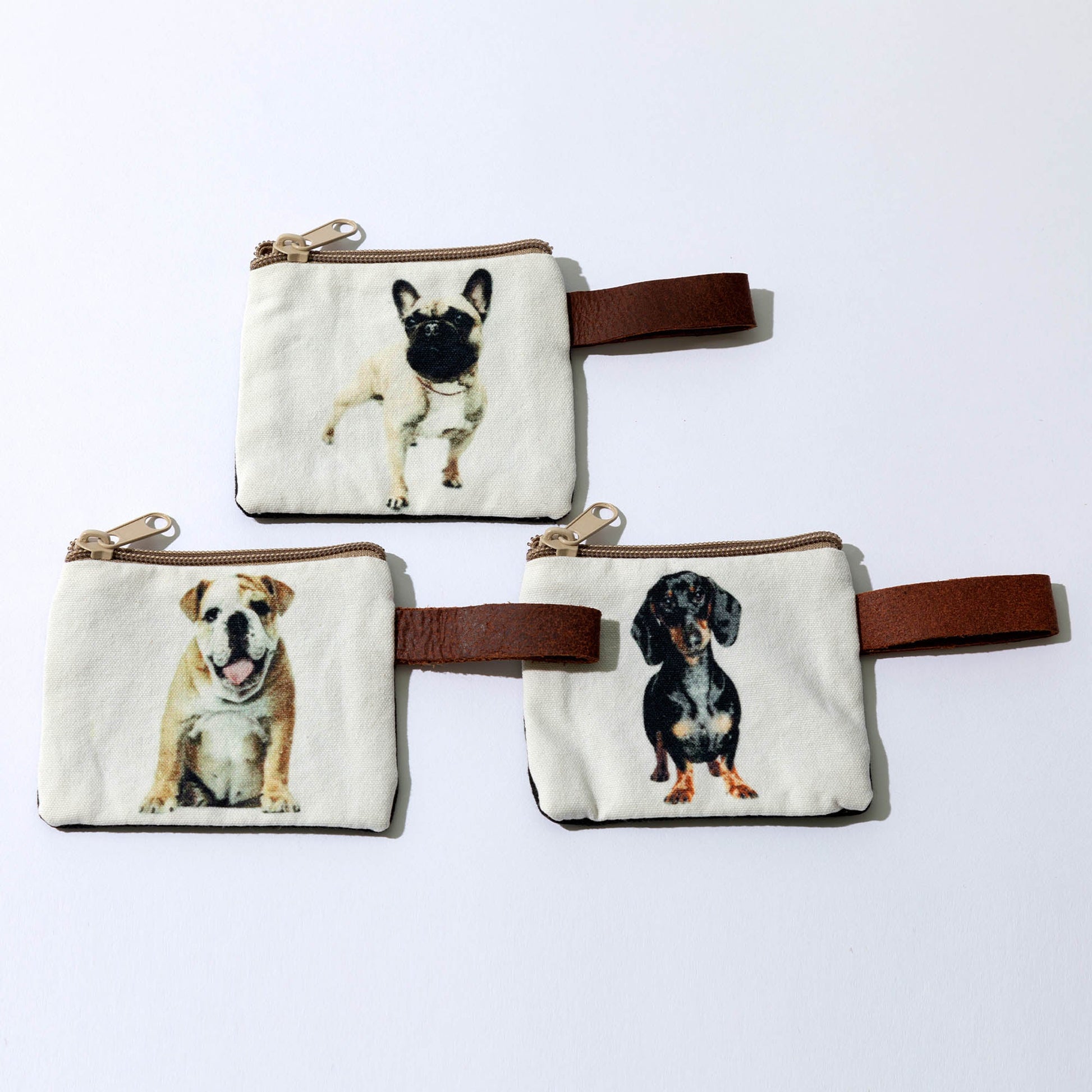 Even as you leave your furry friend at home, you carry your dog fanaticism with you wherever you go! Patterned on the front of each canvas coin purse is a small puppy, topped with a recycled leather strap, making it easy to grab out of your tote or purse.