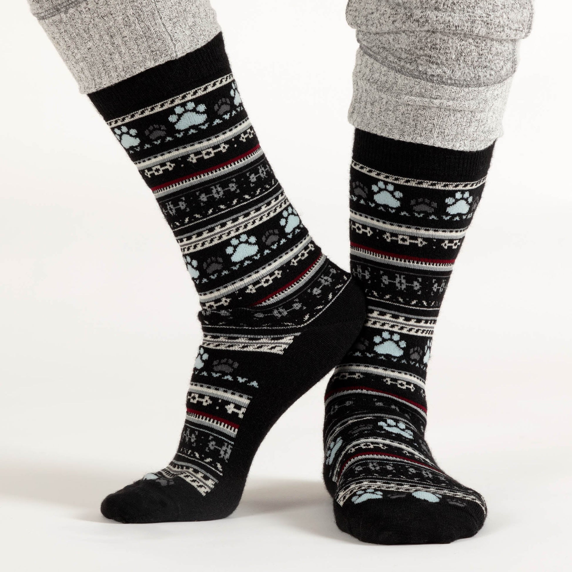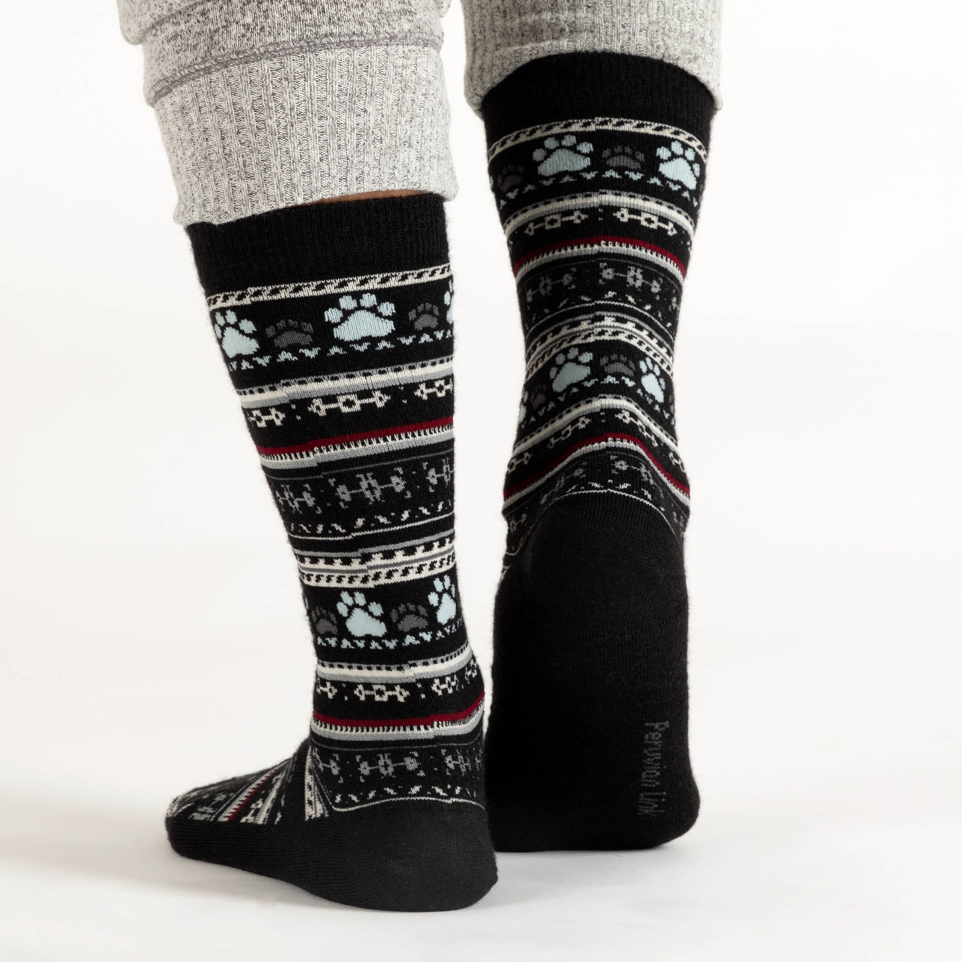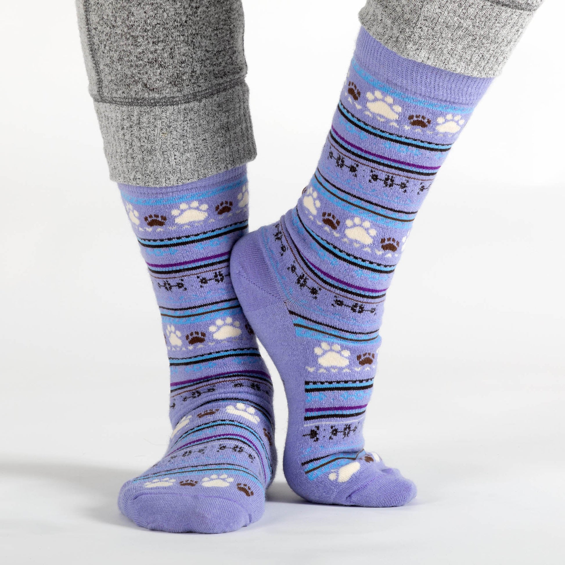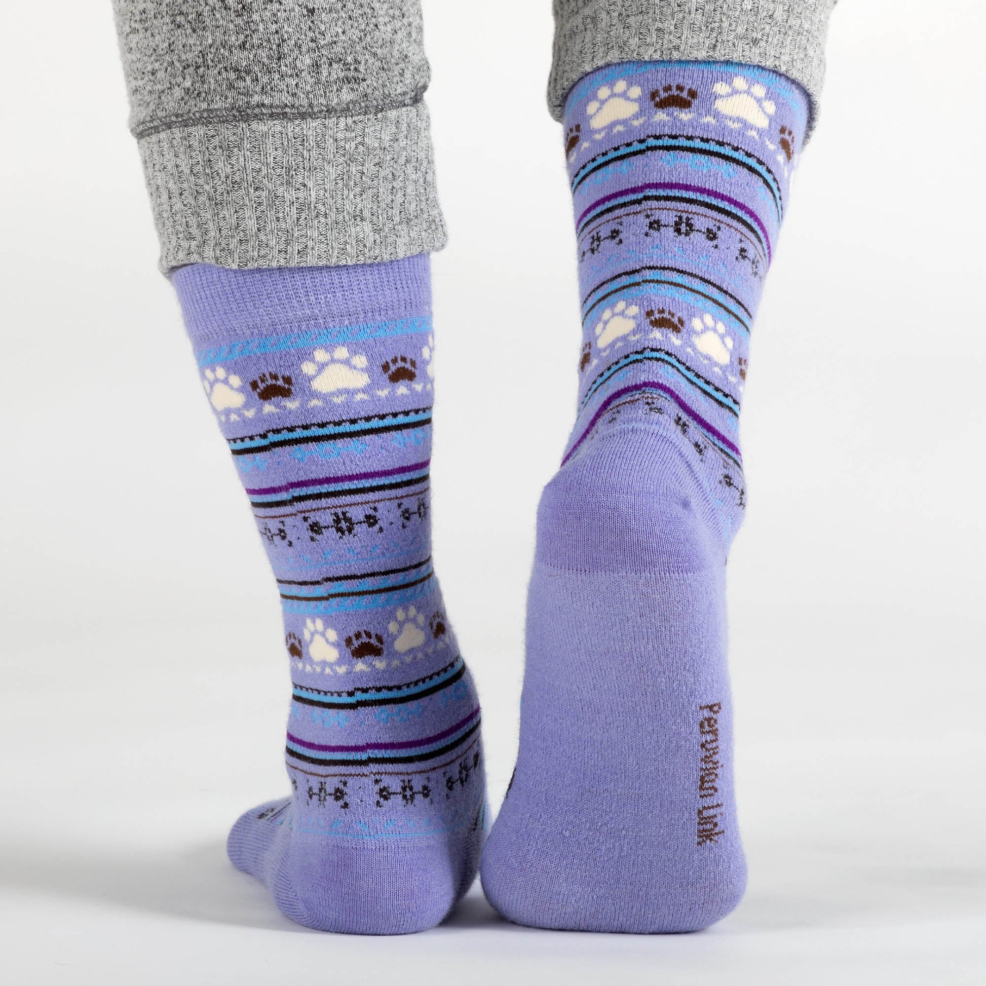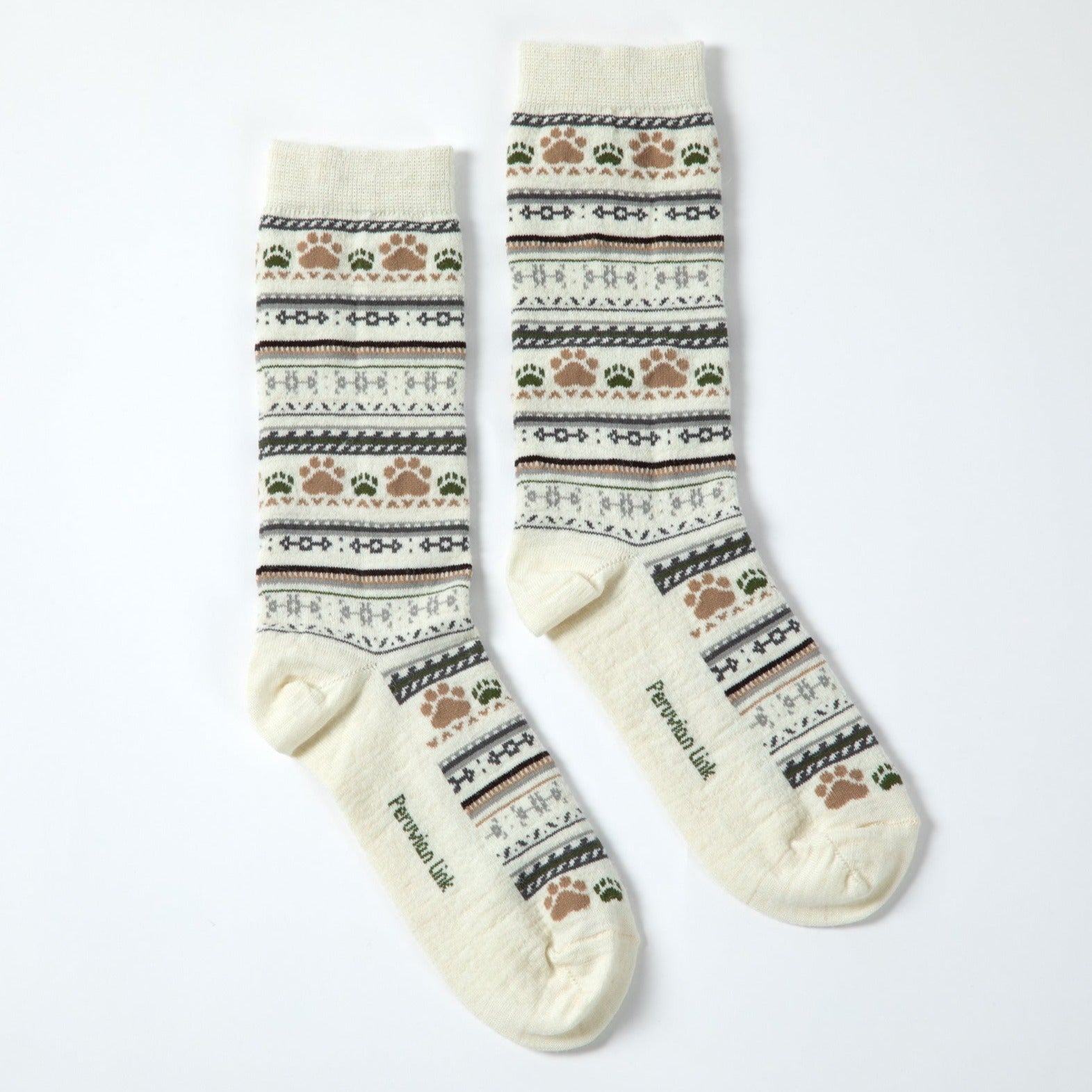 Bright colors are knitted in a striped pattern, spotted with paw prints in this incredibly soft and stretchy pair of socks. Woven with alpaca wool and aloe vera with jojoba oil for added softness. Plus, alpaca doesn't contain lanolin like sheep's wool, so it's hypoallergenic and doesn't have the common itchy wool feel!