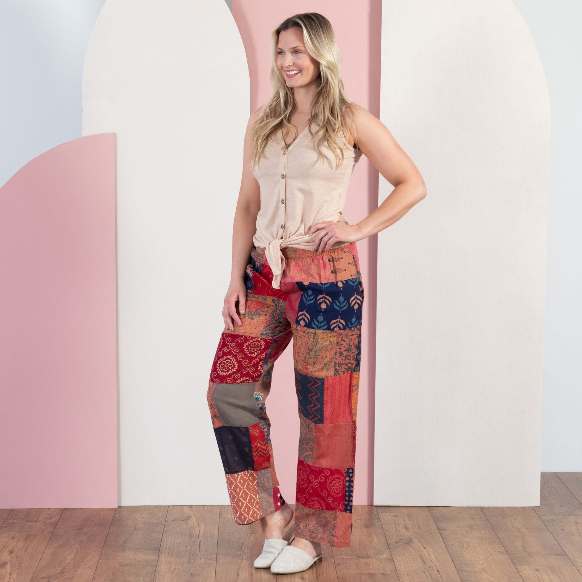 Giving a new life to gorgeous cotton fabric, this richly colored pair of patchwork pants brings color and fair-trade craftsmanship to your wardrobe! Made with coordinated pieces of fabric that make each and every pair unique, this relaxed piece is complete with elastic throughout the waist for a totally comfortable, flattering fit.