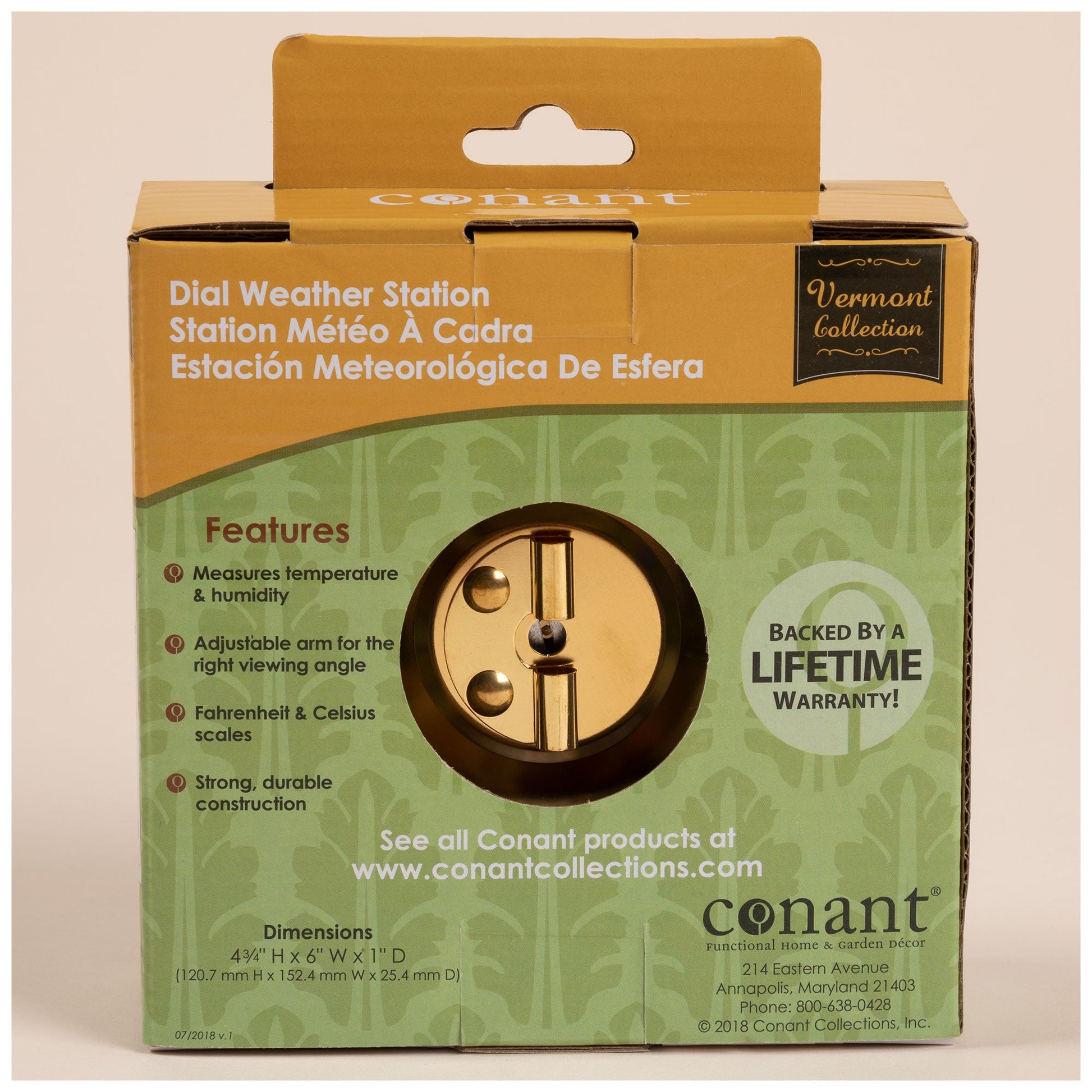 This brass weather station has a thermometer that measures temperature on both Fahrenheit and Celsius scales in an easy-to-read format. This useful weather station also has a hygrometer on the lower half of the dial which indicates percent of relative humidity. The 3.5 inch long swivel arm and mounting bracket are included with the brass weather station for simple installation. The swivel arm allows for convenient placement and viewing.