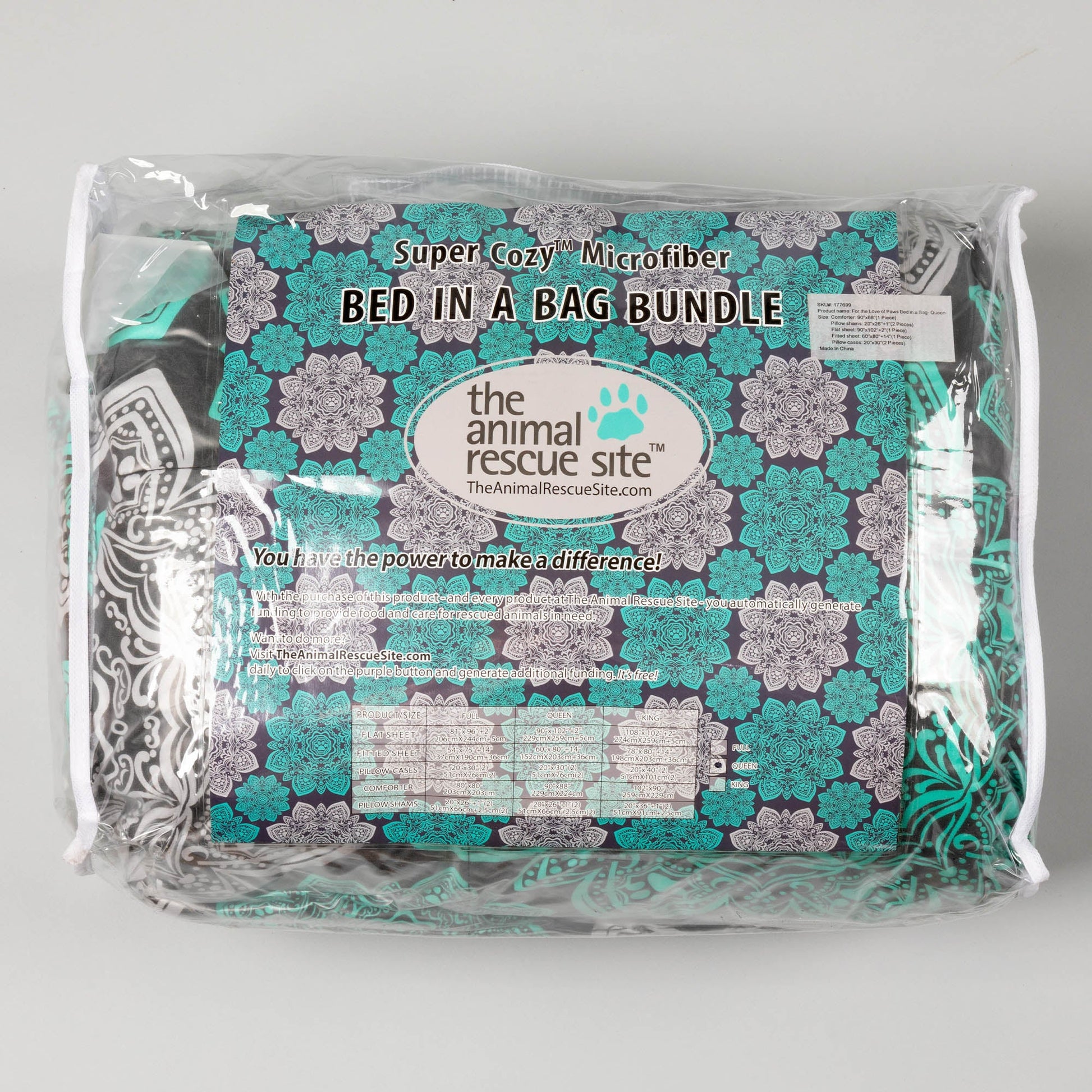 A medallion design featuring small, subtle paw prints throughout make this gray and teal comforter a charming addition to your bedding! The bed-in-a-bag features 1 colorfully printed quilt, 2 matching pillow shams, 1 fitted sheet, 1 flat sheet, and 2 pillow cases for an all-in-one, super soft microfiber bed set that will send you off into a dreamy slumber.