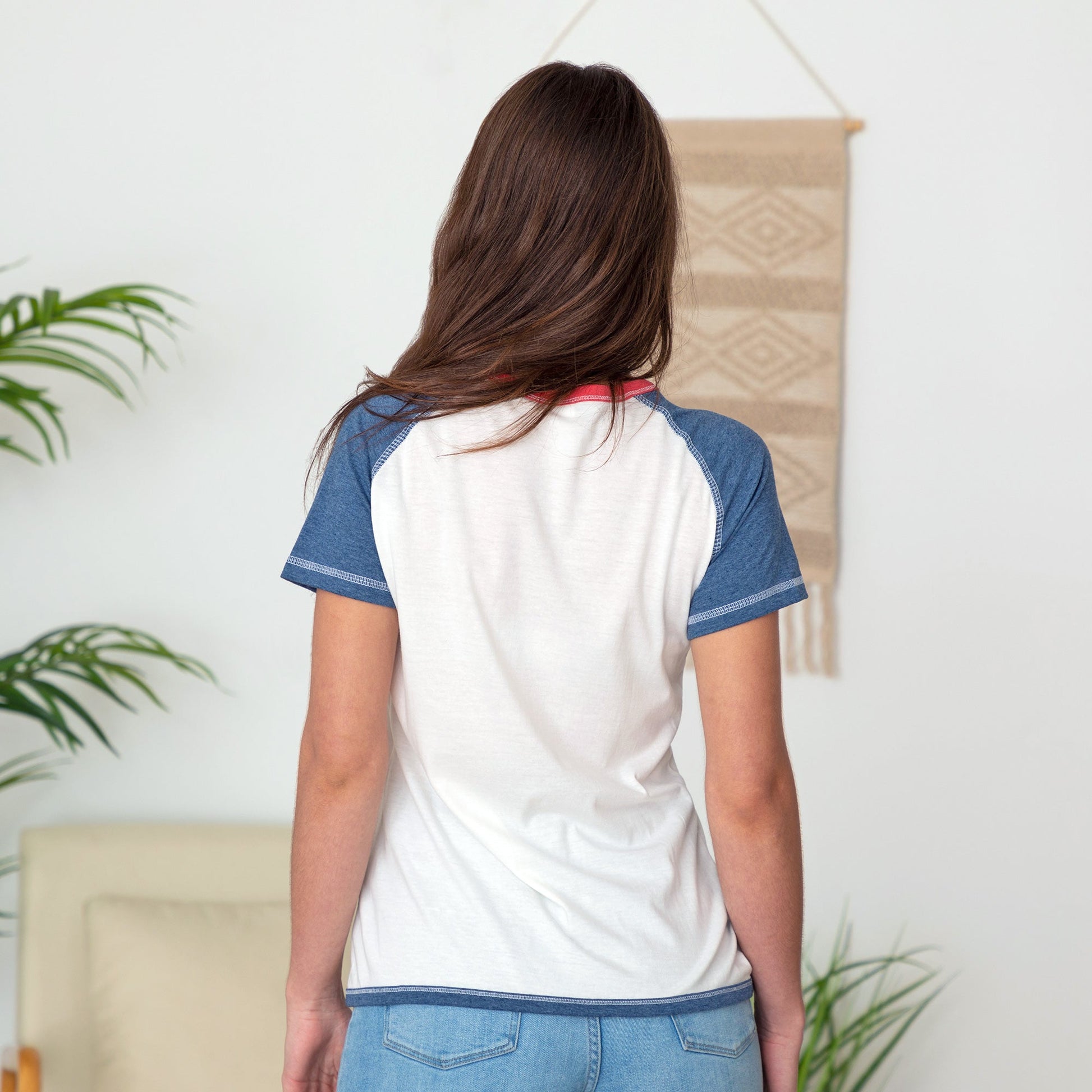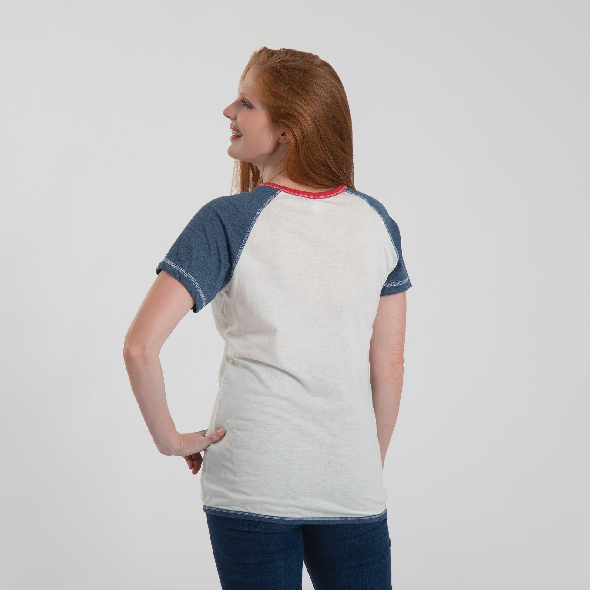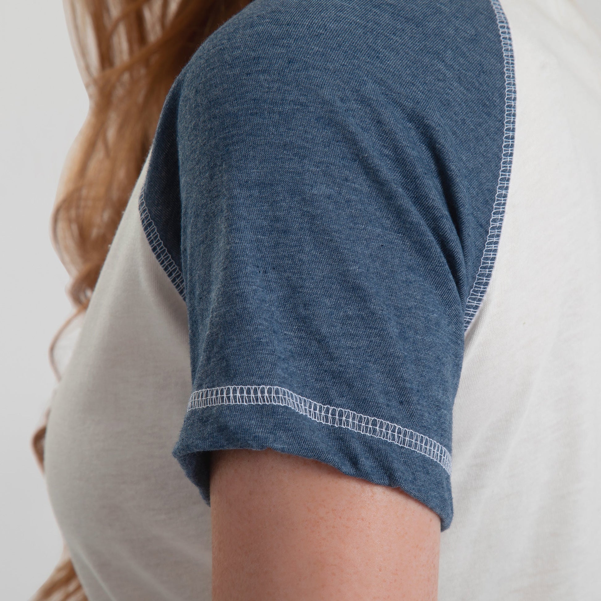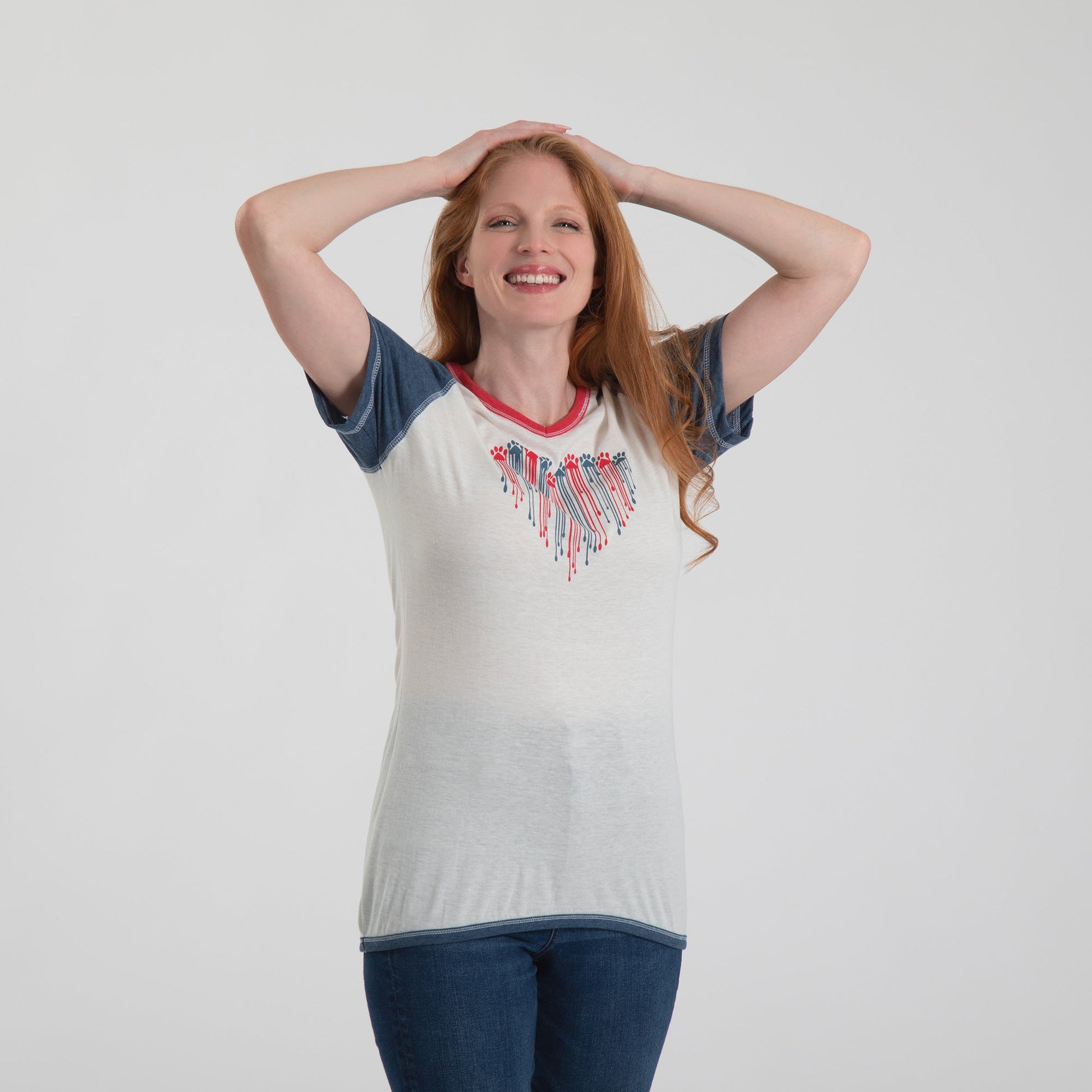 A classic collegiate style with a patriotic, animal-friendly design! This raglan tee features a contrasting color v-neck, with blue sleeves and matching blue hemline, complete with a paint drip style heart made of tiny paw prints. A sweet design on a comfortable, breathable cotton blend!