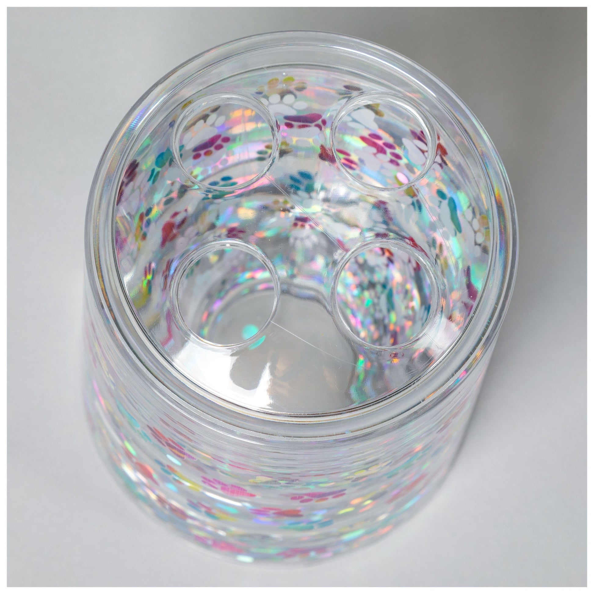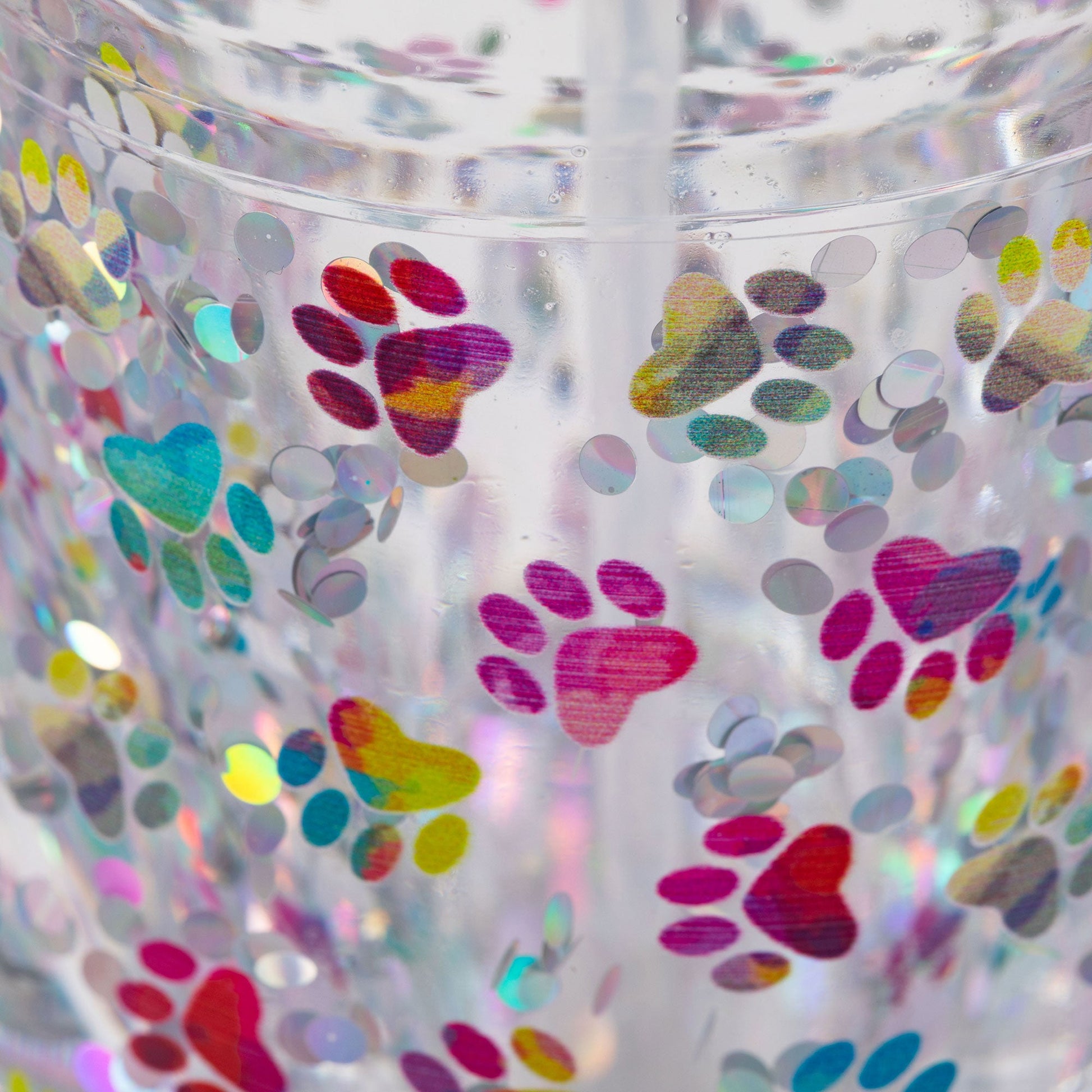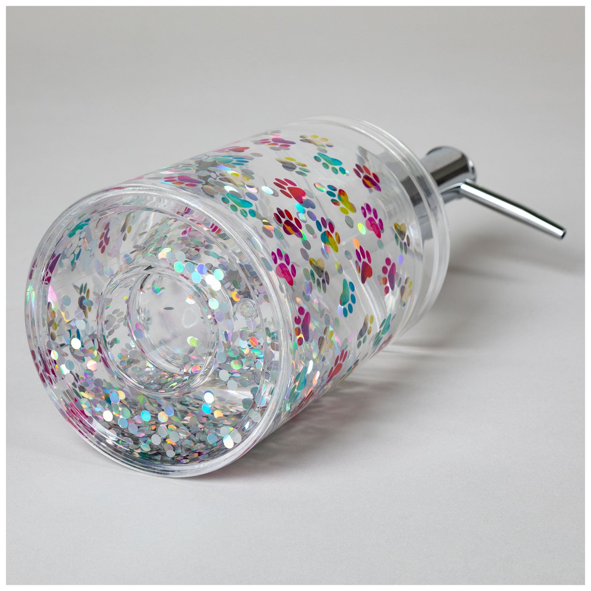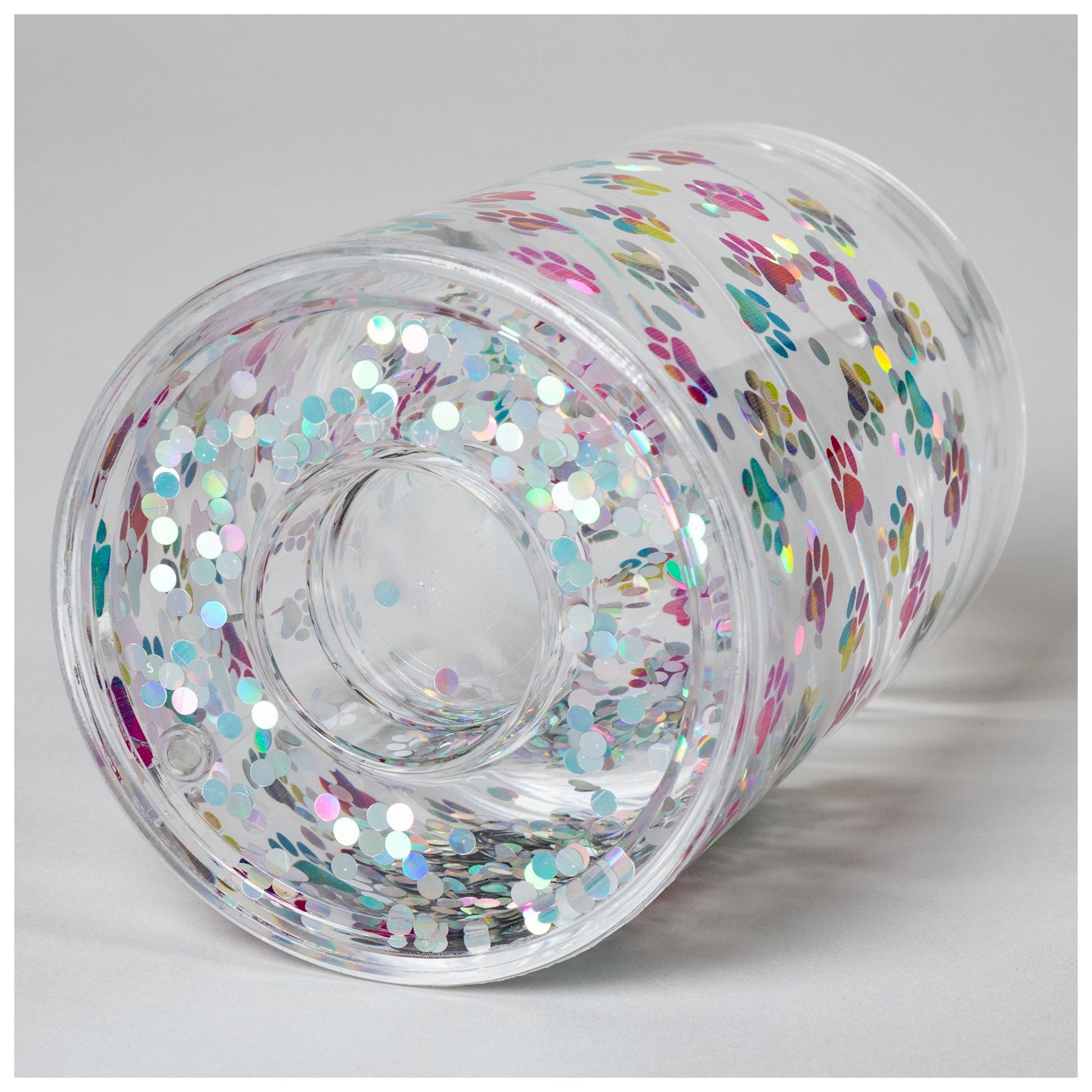 Add a little sparkle to your daily routine with this colorful bathroom duo! Rainbow paw prints parade along the outside of the soap dispenser and toothbrush holder, with small sparkling sequins suspended in the inner walls.