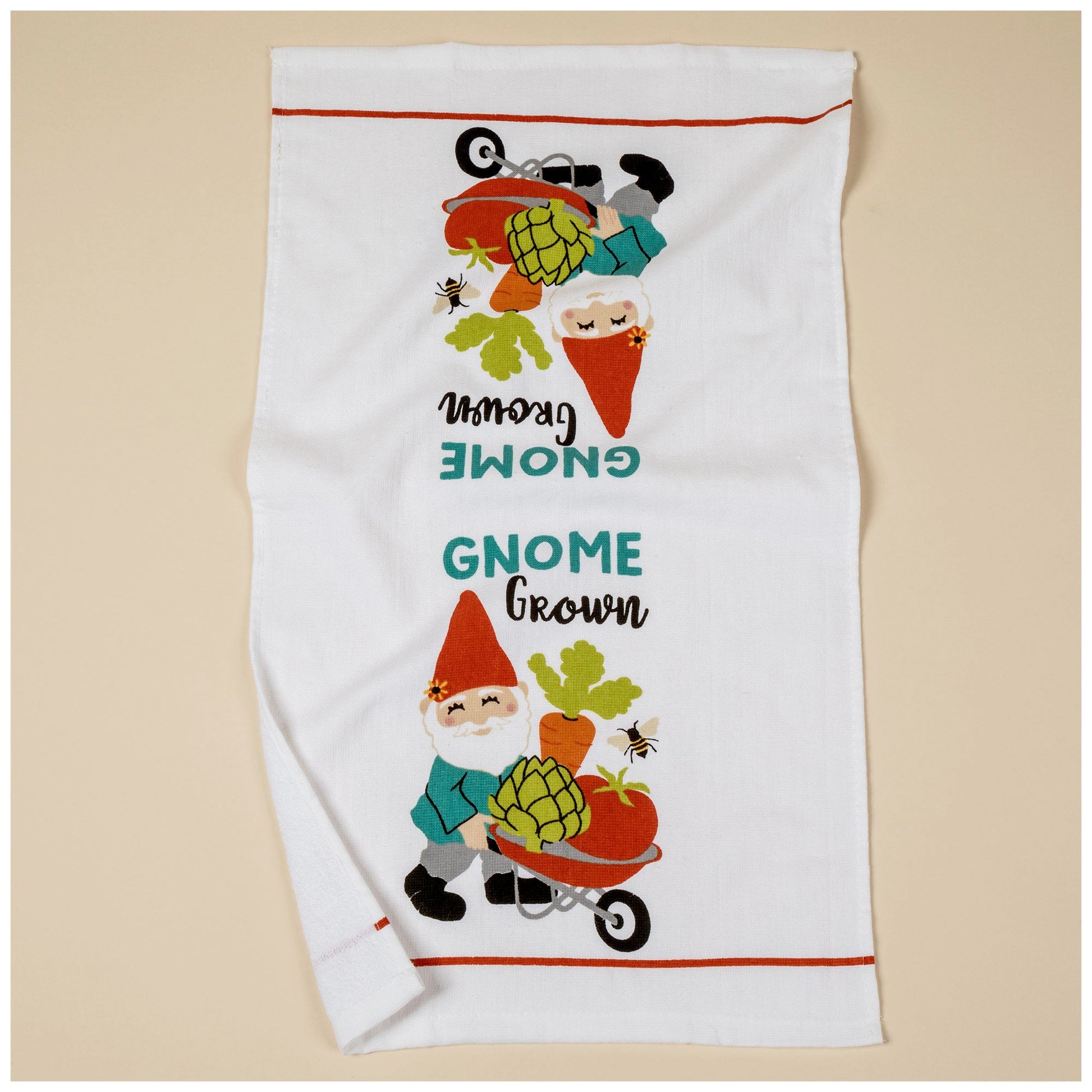 With a wheelbarrow full of garden vegetables and a a buzzing bee, this cute little gardener proudly wheels his harvest of veggies that are "Gnome Grown!" Drying dishes and wiping down counters are a whimsical daily endeavor with this soft, absorbent, 100% cotton towel.