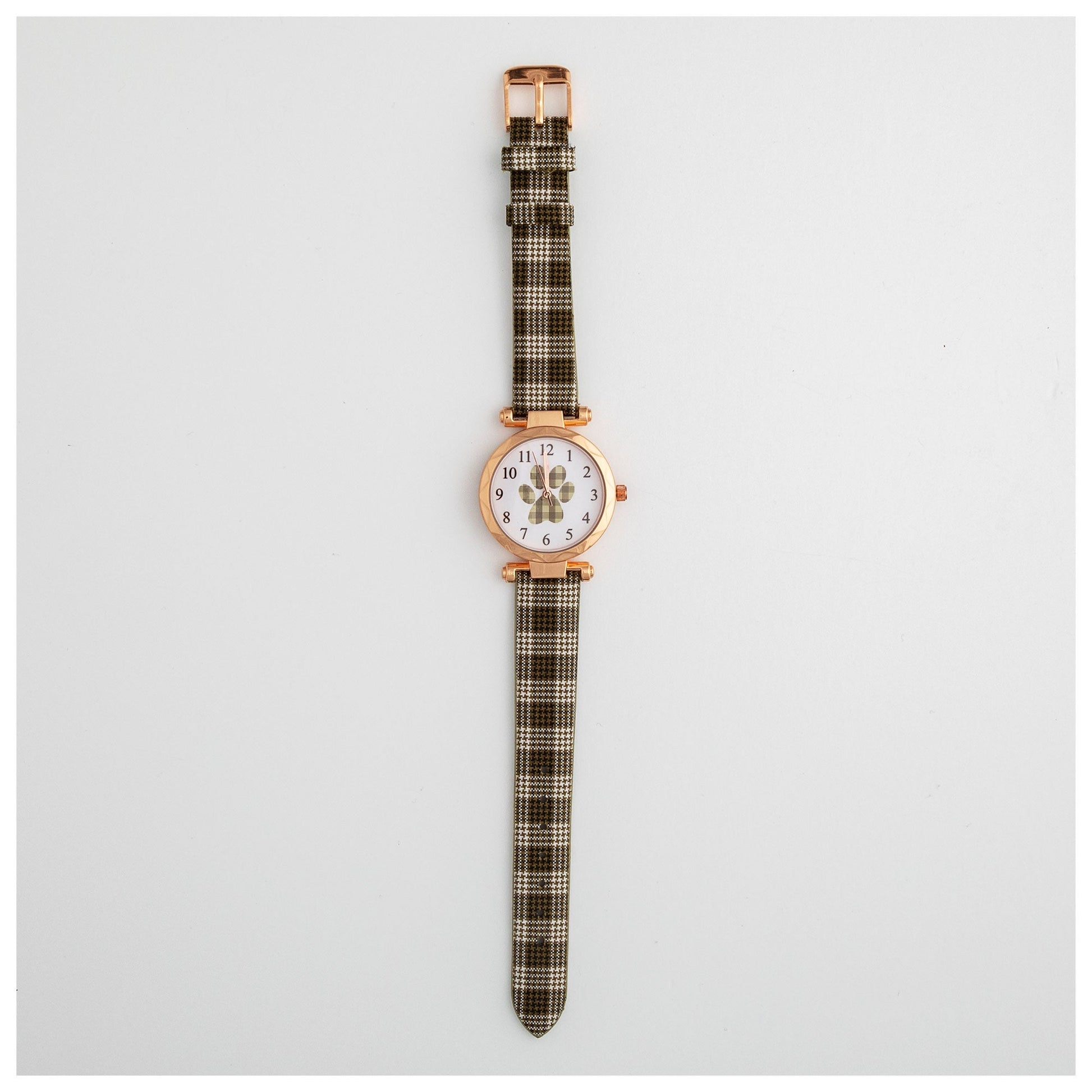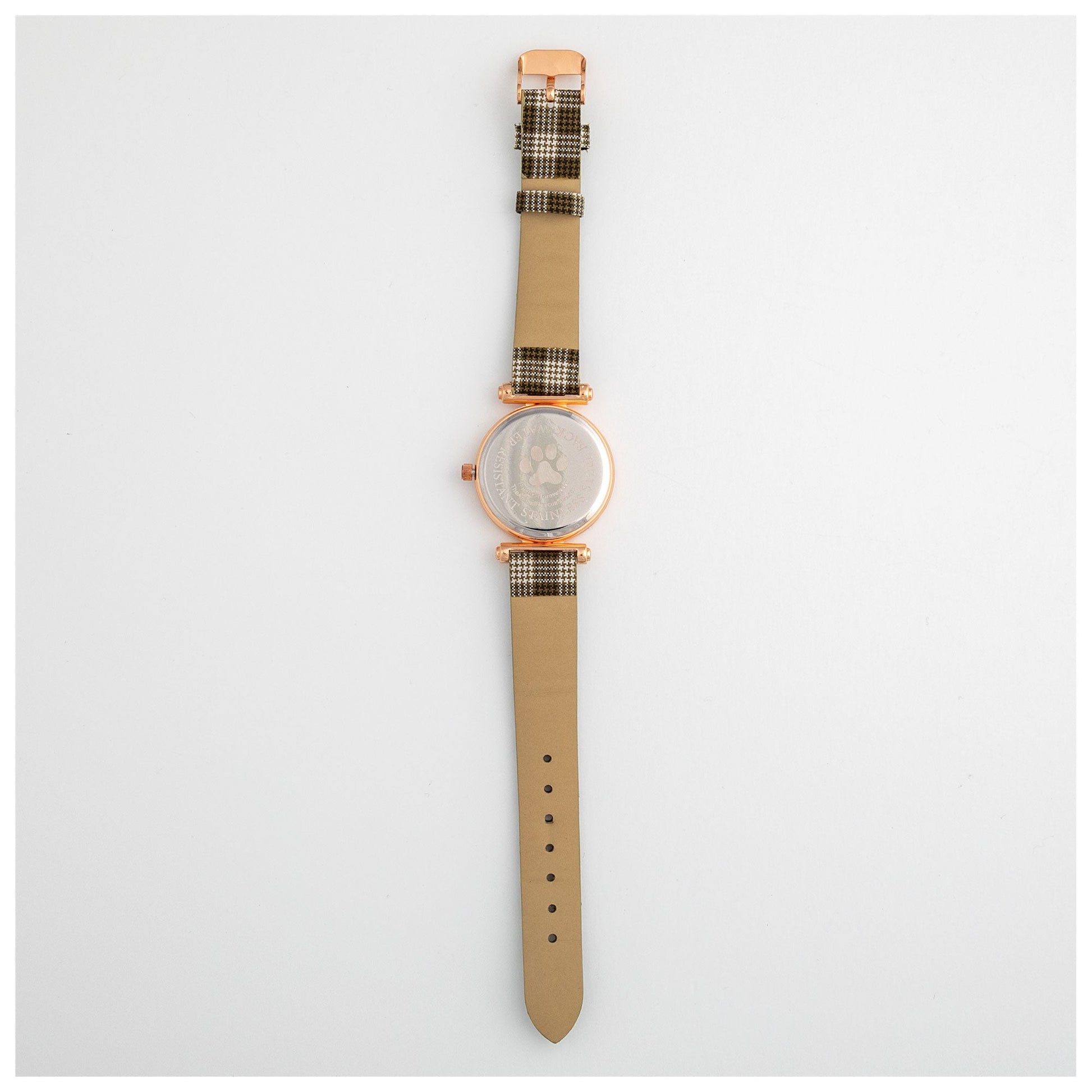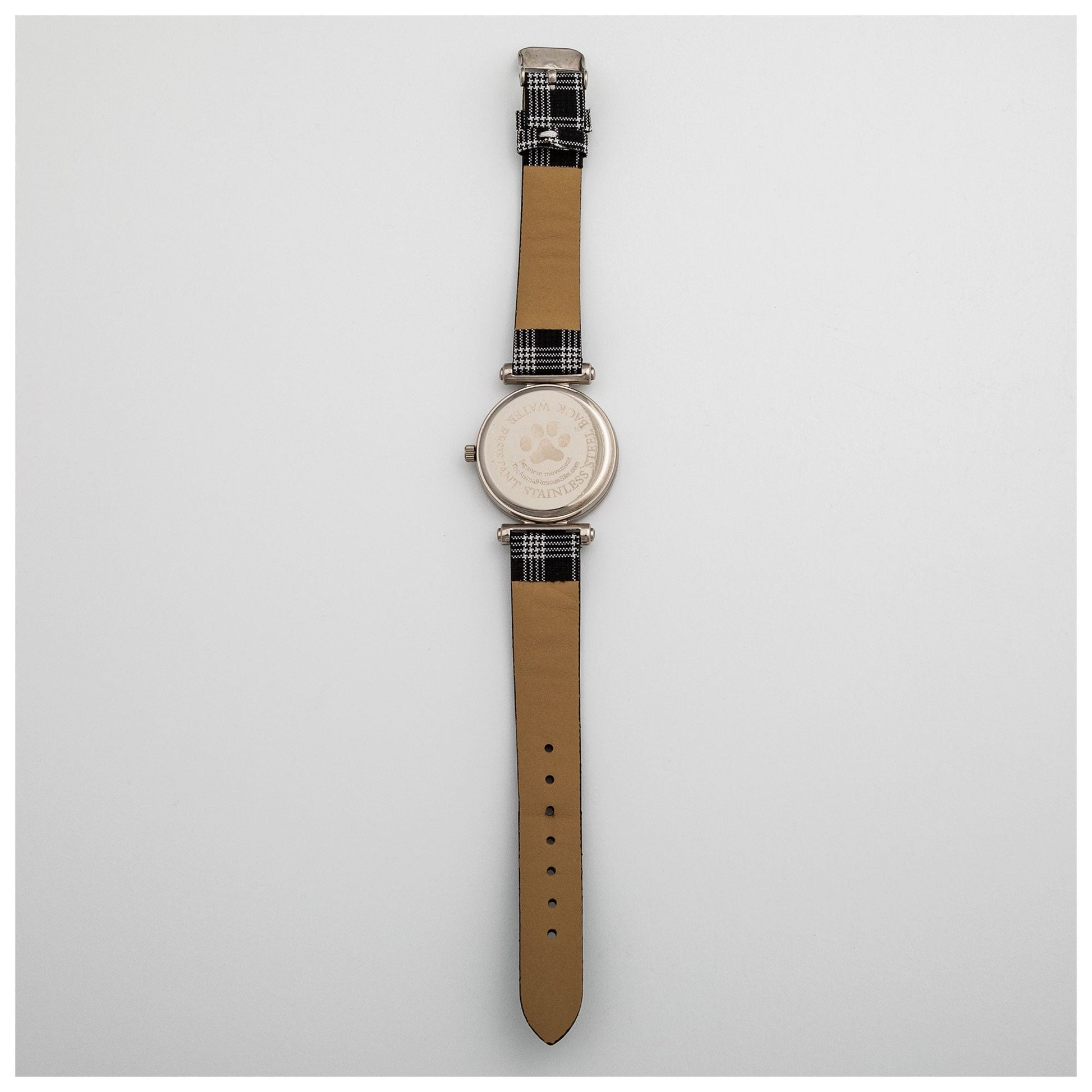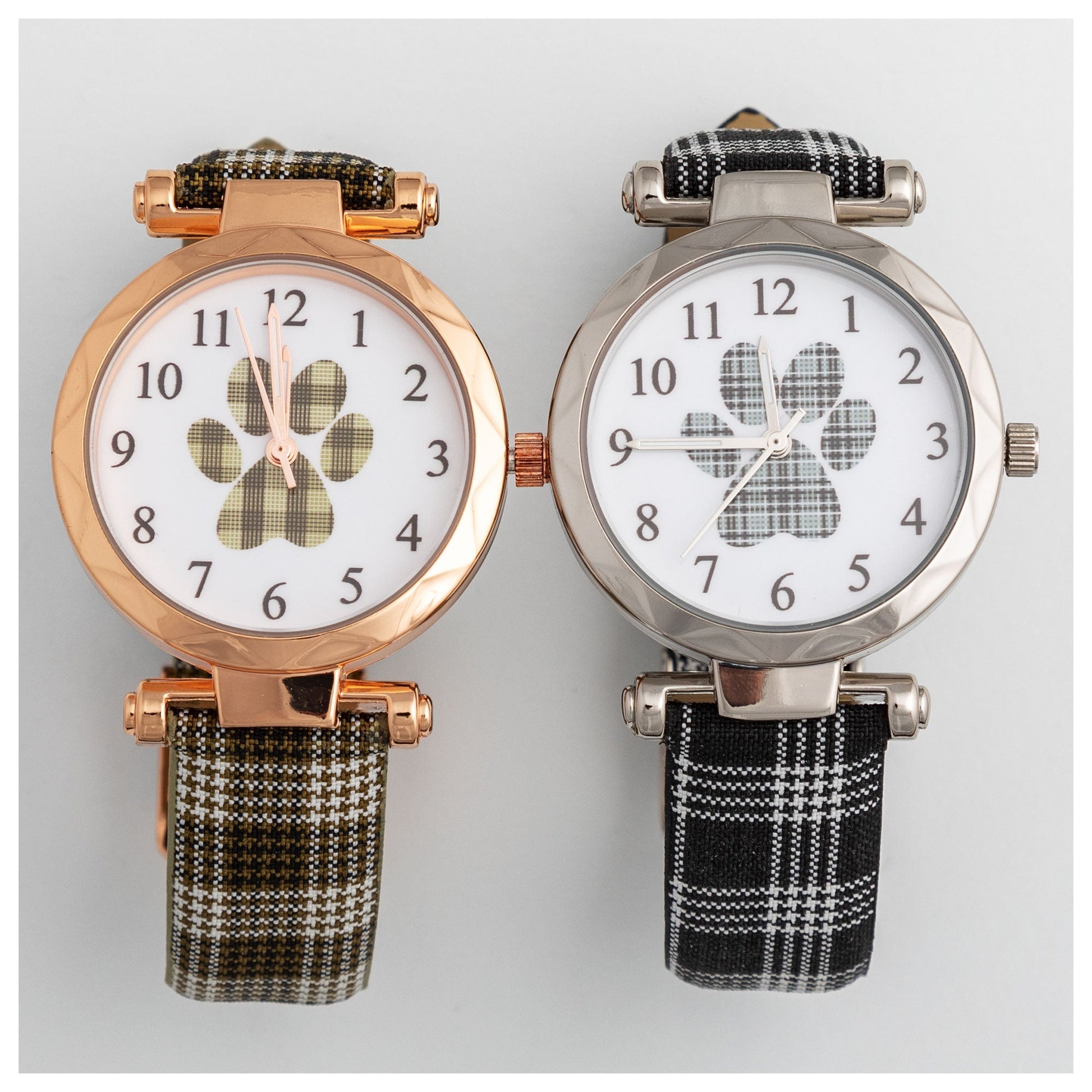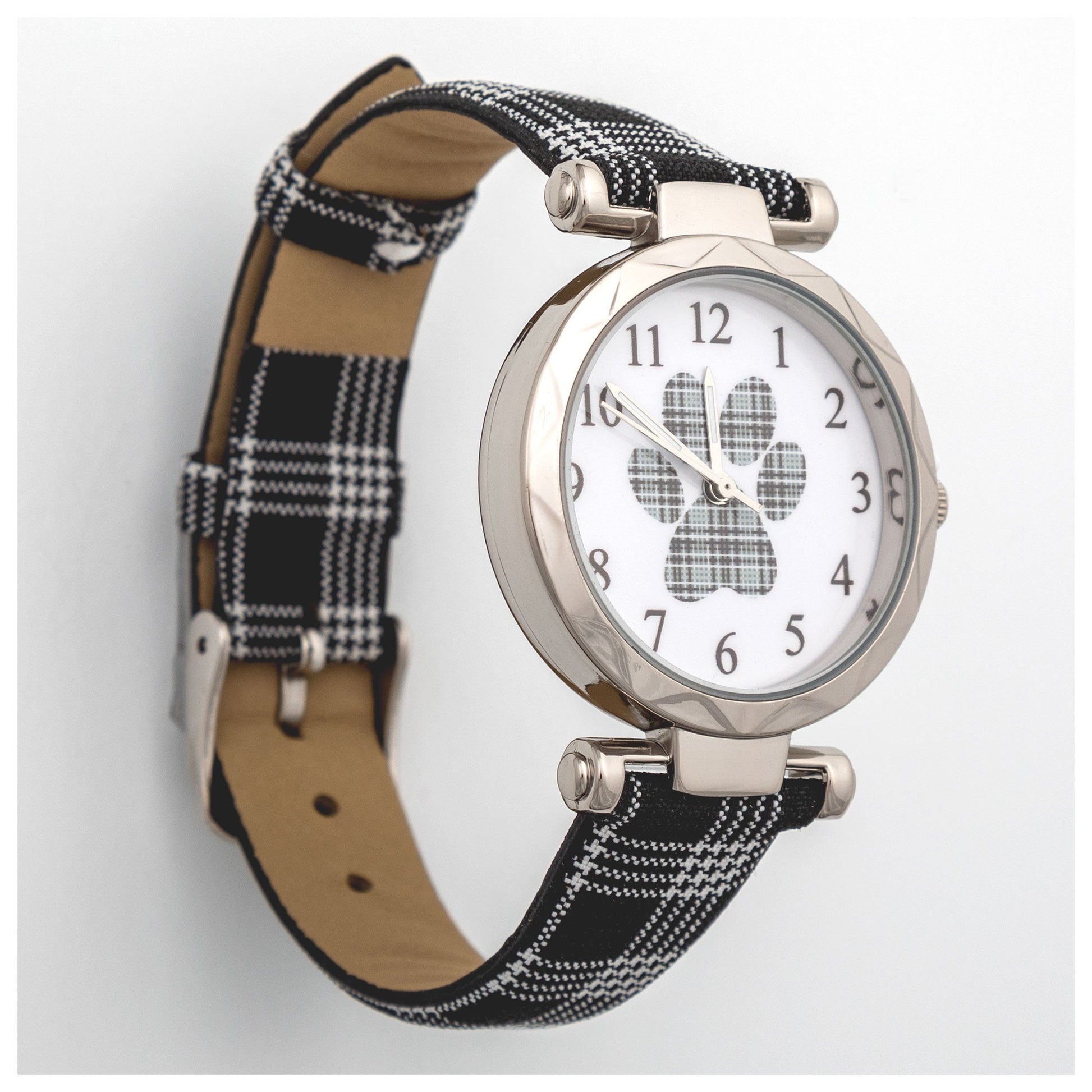 A classic plaid print wraps around the watchband and coordinates with paw print at the center of this charming wrist watch! Made with a stainless steel in silver or rose-gold tone, and complete with a water resistant face, this adjustable watch keeps you running on time, with a look that goes with everything.