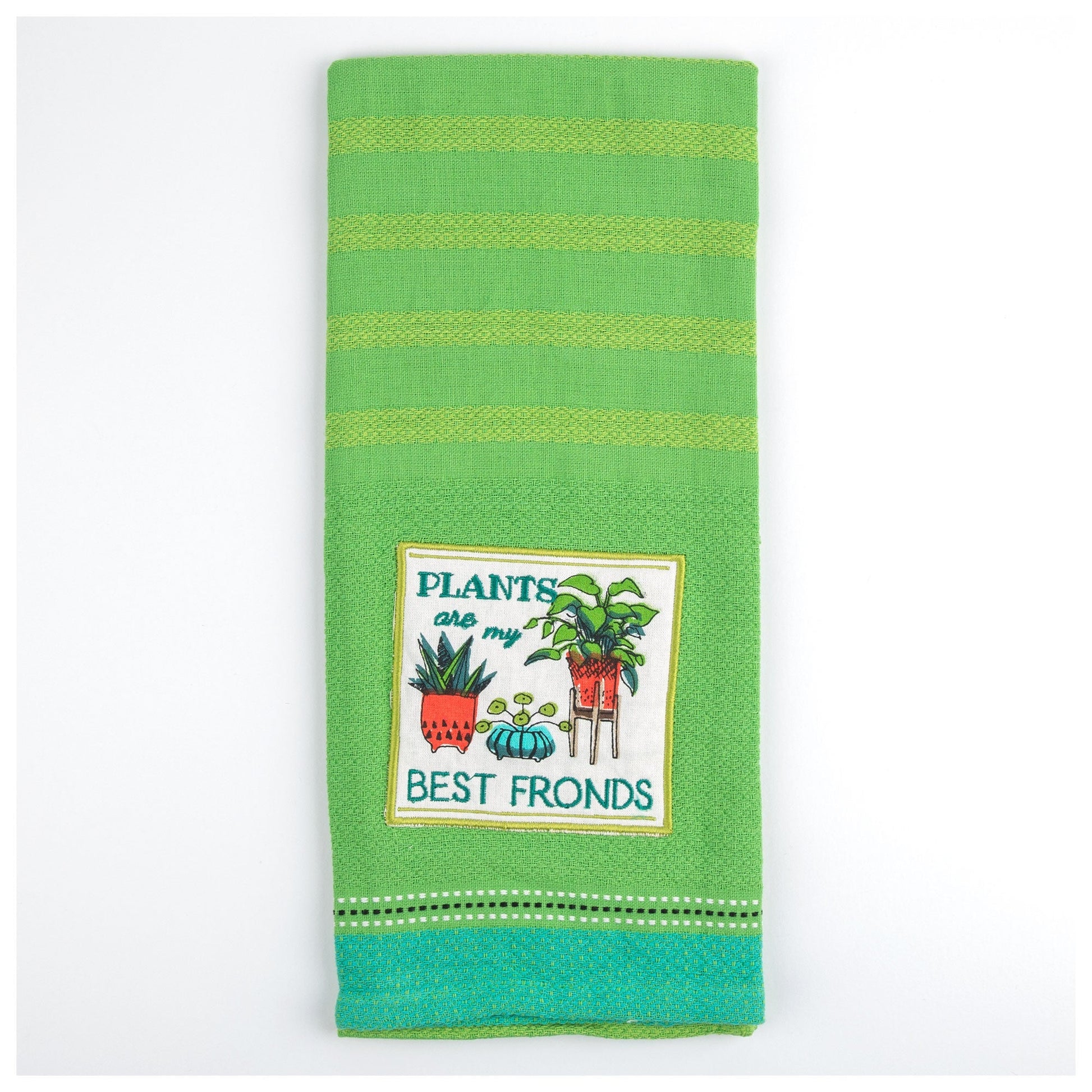 Gorgeously green with a plant-forward message, this playful 100% cotton kitchen towel is growing to be your new favorite kitchen item! Complete with a retro feel and a sturdy embroidered patch on the front that reads: "Plants are my best fronds."