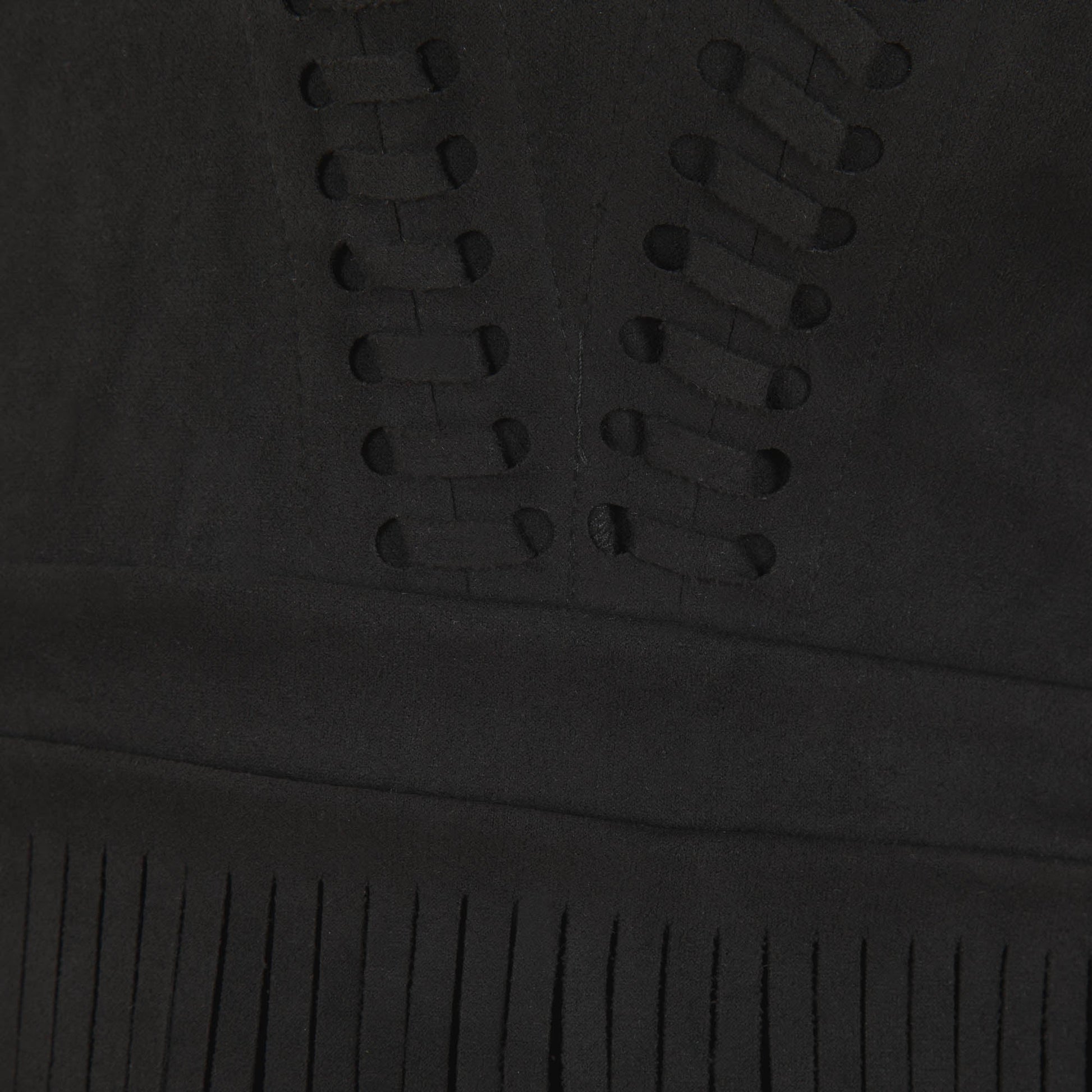 A statement and a staple piece all in one! Your new little black dress features a soft vegan suede with two layers of fringe that wraps all along the bottom half, with accented stitching along the bodice that adds to its one-of-a-kind style.