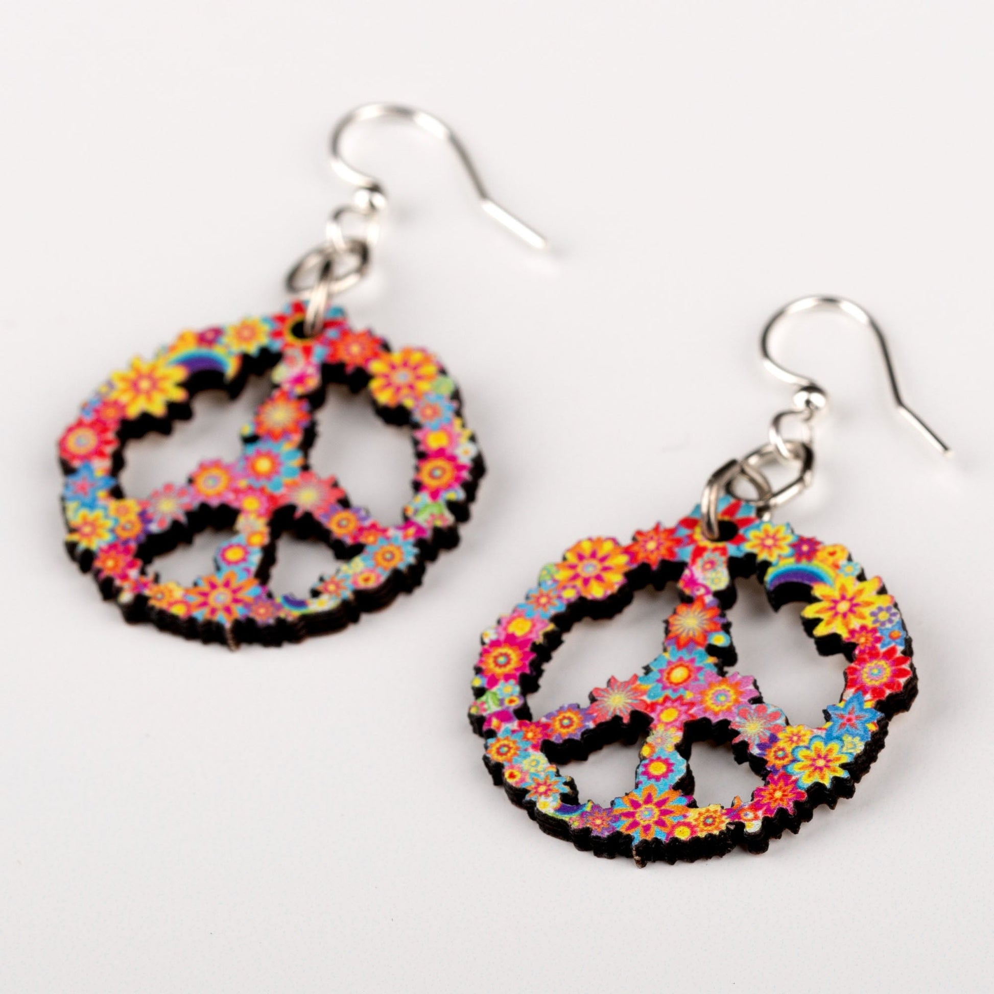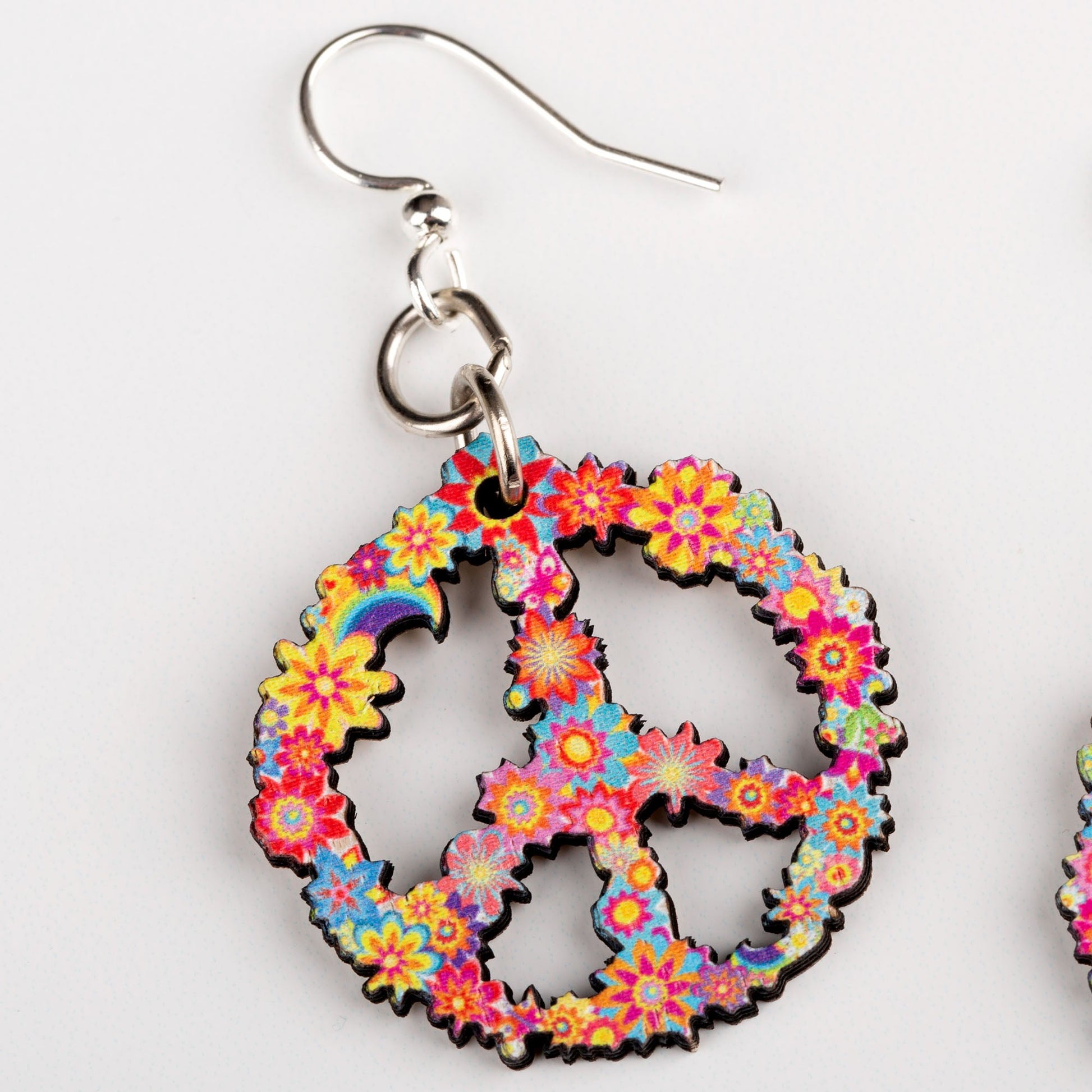 Bursts of blossoming flowers form a peace sign in this eco-friendly and impactful pair of earrings! Made with recycled materials and sustainably sourced wood, each colorful pair has a natural wood finish on the back and doubles as a wearable essential oil diffuser.