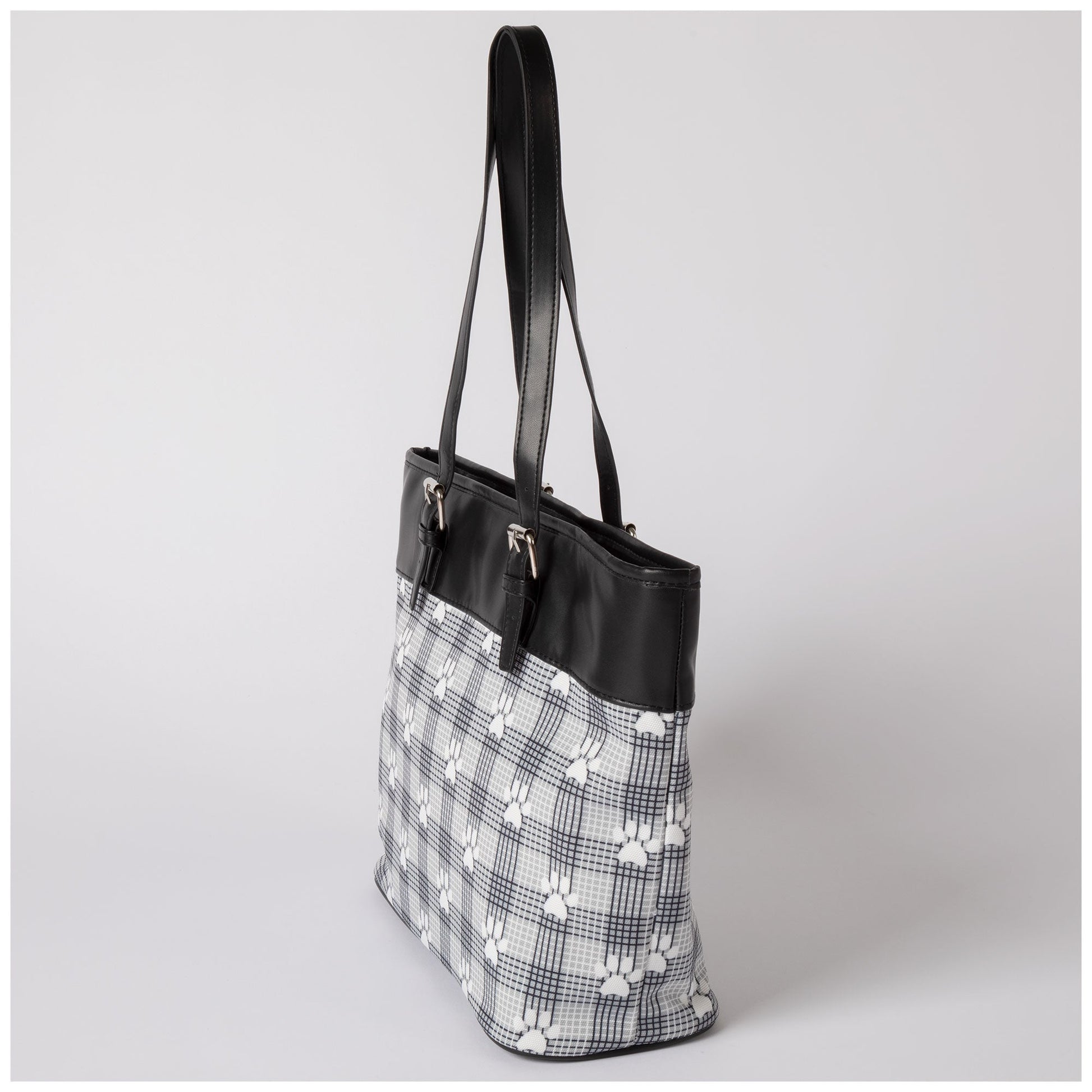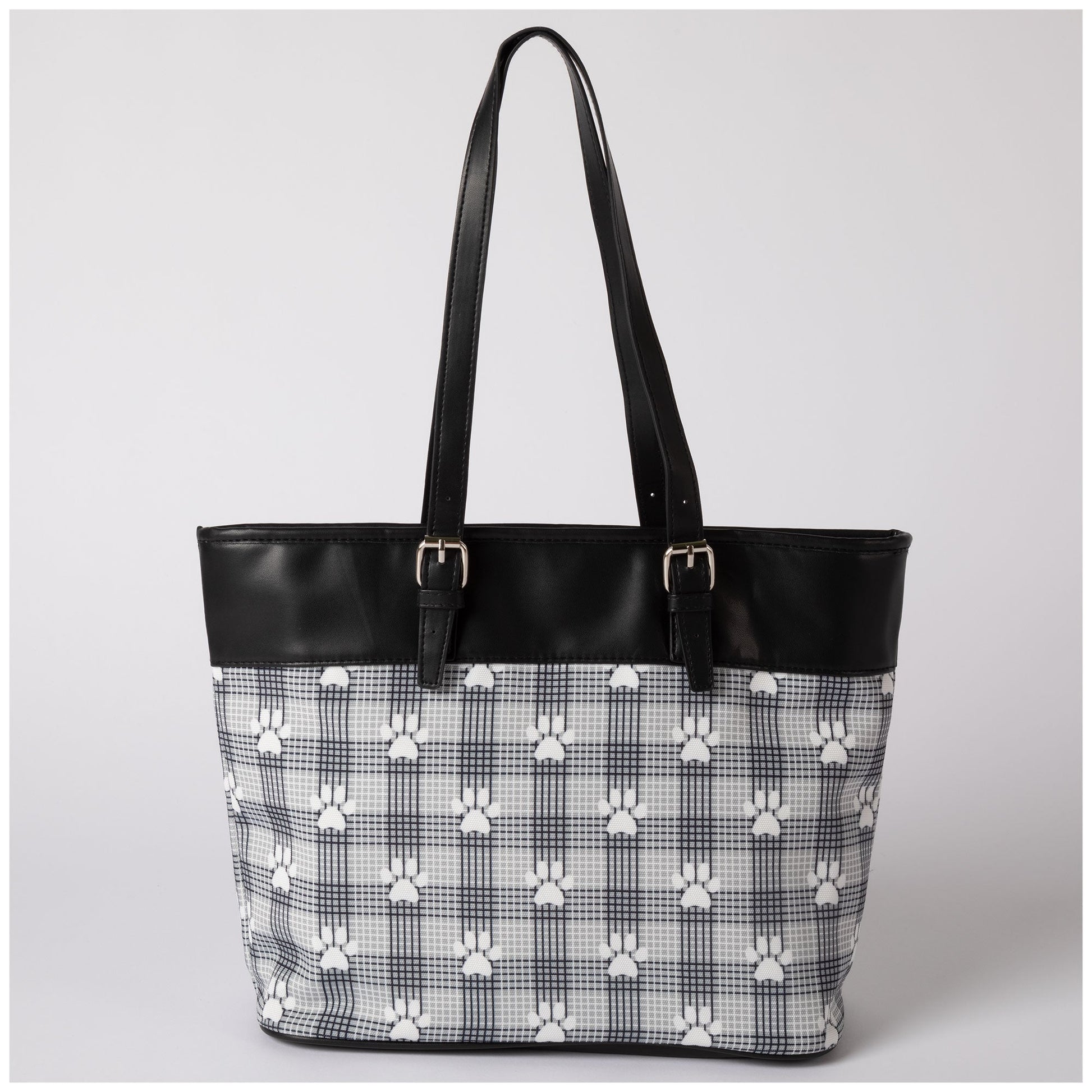 A classic plaid design gets an animal-friendly detail with small paw prints throughout in this versatile faux leather and canvas tote. Topped with gold-tone accents, this bag is the perfect carry-all for staying organized, prepared, and sending a message of your devotion to animal rescue causes!