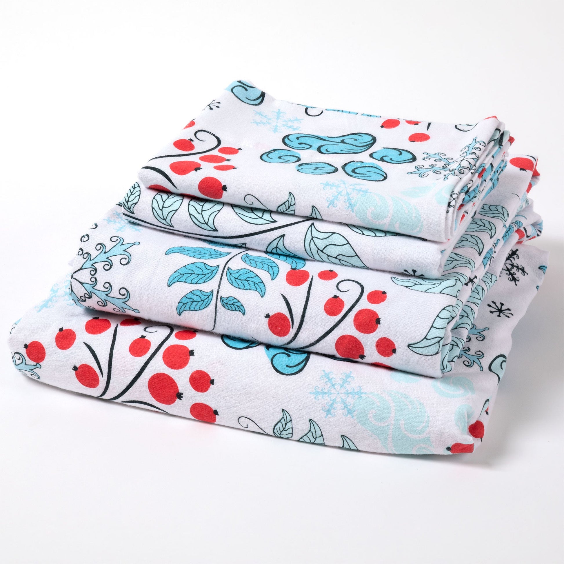 Cozy up in this 100% cotton flannel sheet set that makes you feel like you're snoozing in a winter wonderland! Snow-white sheets are patterned in icy blue leaves and swirly paw prints, snowflakes, and holly berries -- boasting your love of the most wonderful time of the year, and your dedication to animal rescue causes!