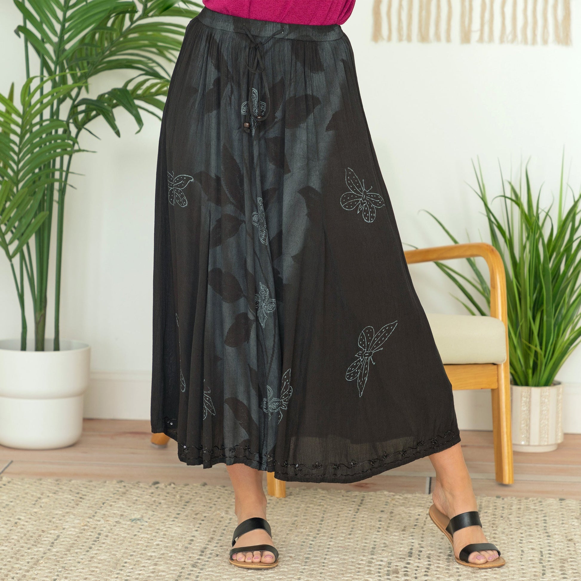 White butterflies flutter through the midnight hue of this long skirt. Made from lightweight rayon, this captivating piece can be paired with a cami or long sleeve top for a comfortable, fair-trade look!