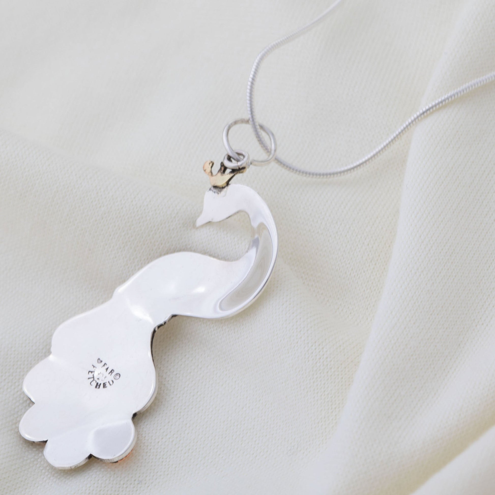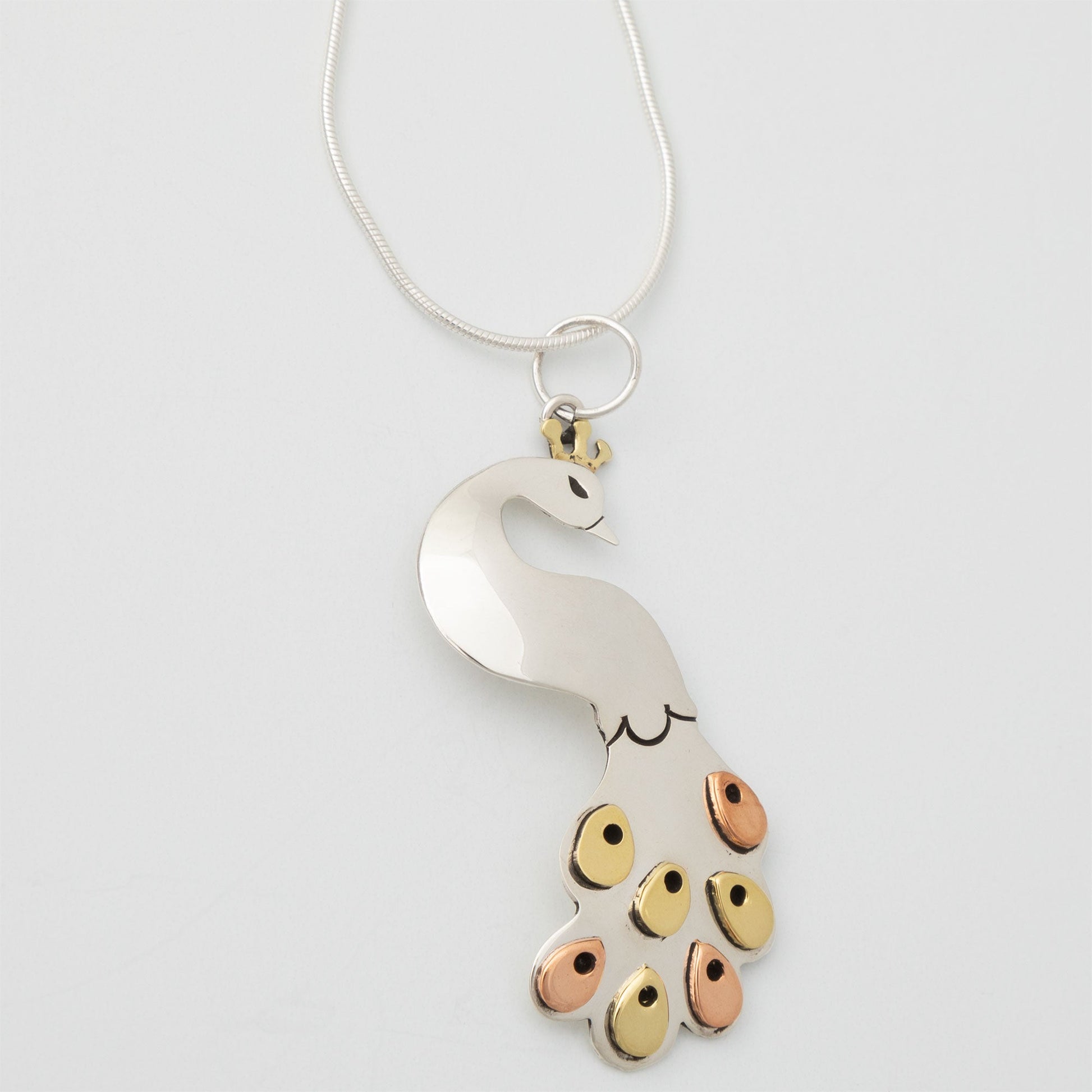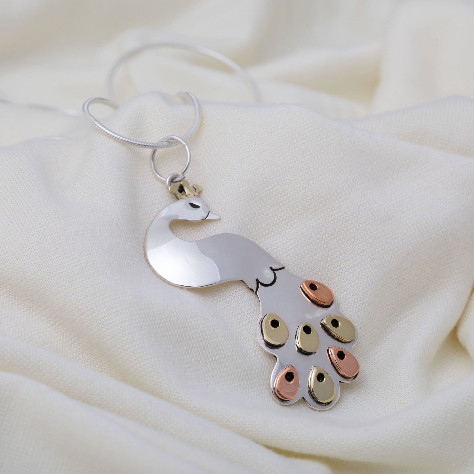 A sterling silver peacock is accented with brass and copper feathers in its cascading tail on this handcrafted pendant. Made by skilled artisans in Mexico, it features a trio of mixed metals that make it brilliant and one-of-a-kind.