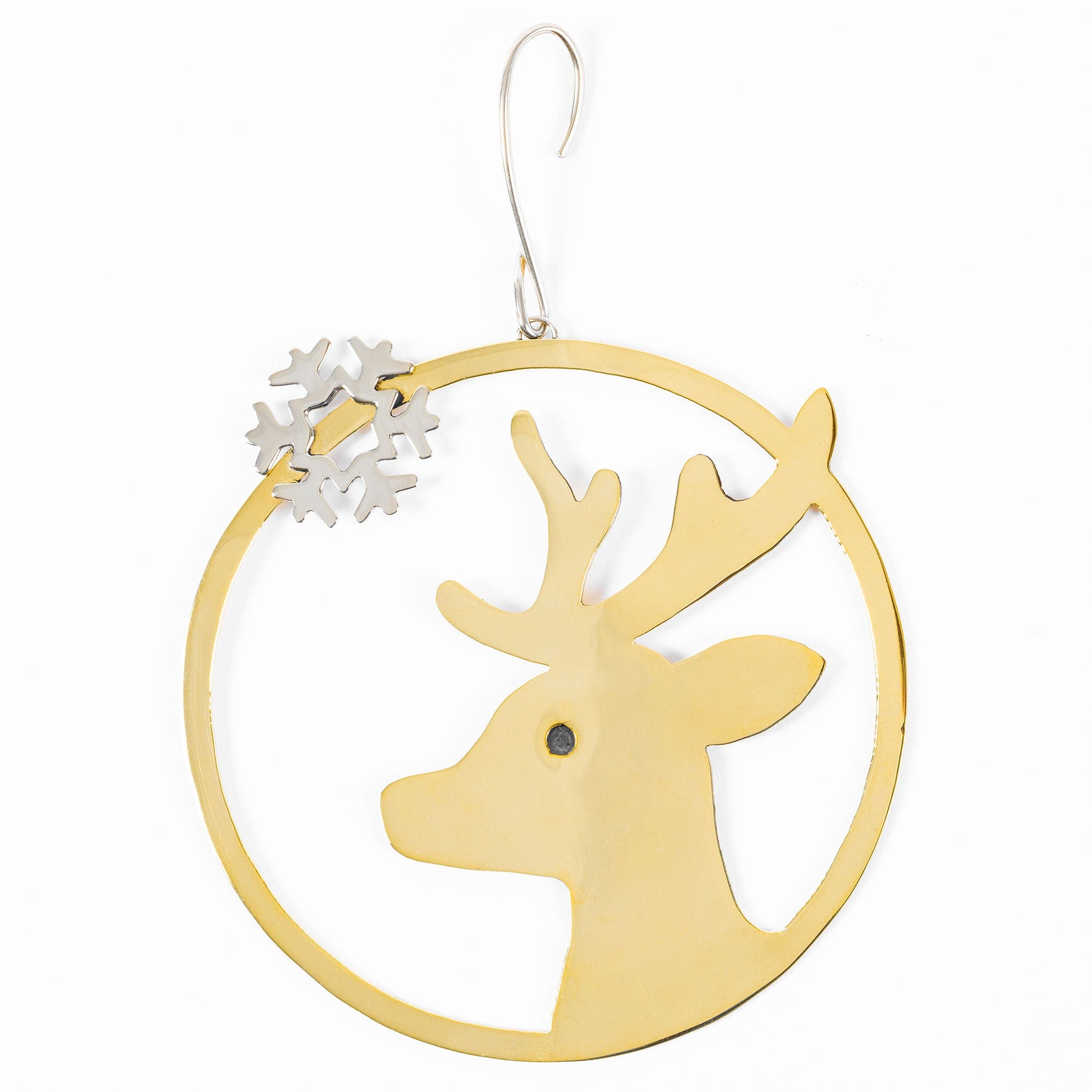 A brass ring with the silhouette of a deer is topped with an alpaca silver snowflake, a mixed metal ornament with Christmas cheer. Handcrafted by artisans for exceptional detail and fair-trade charm!