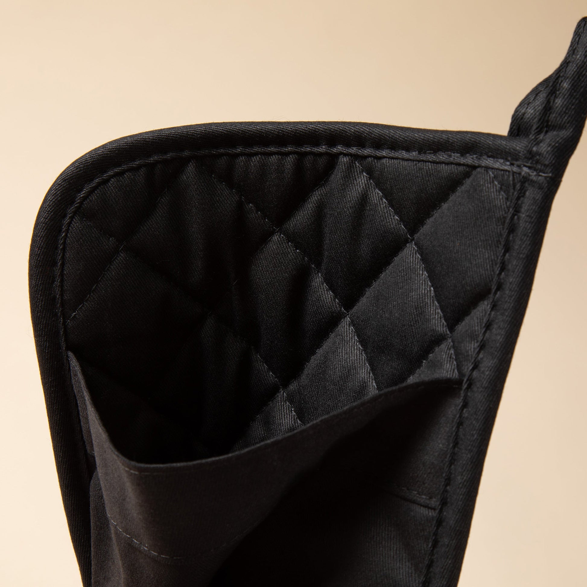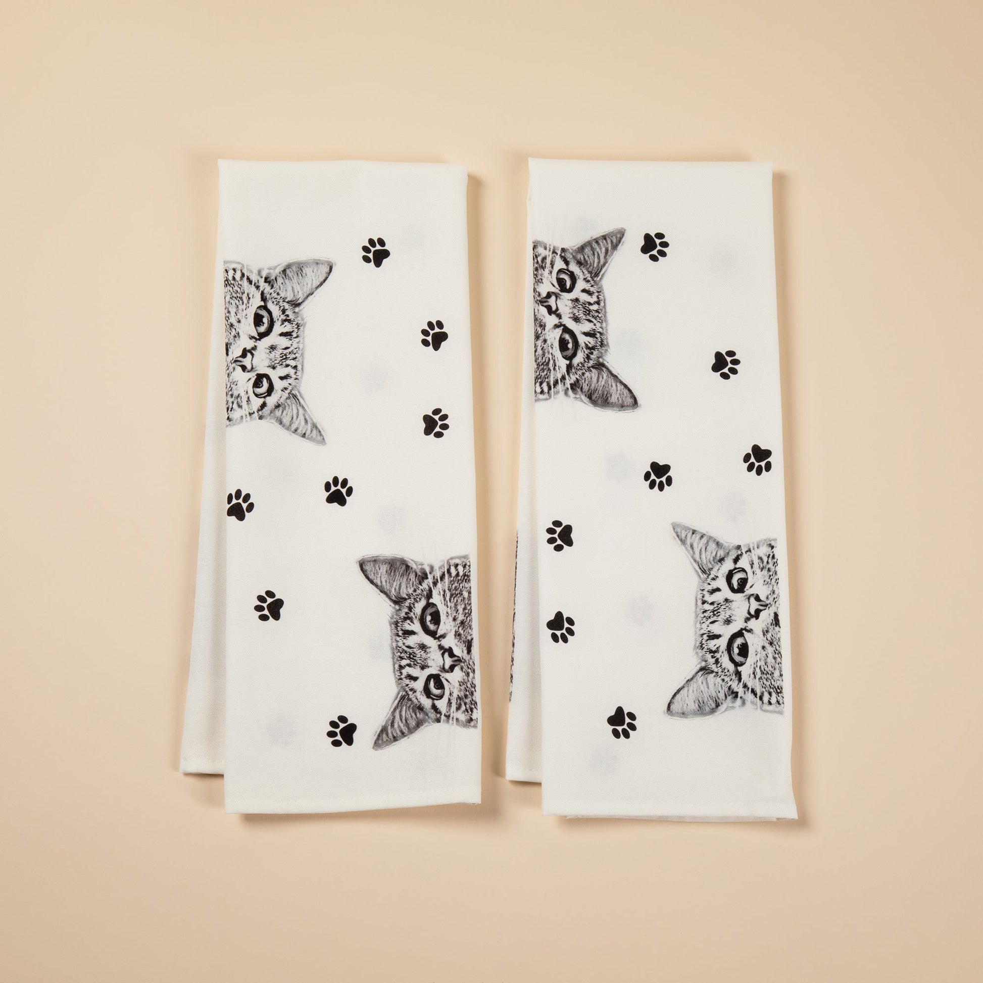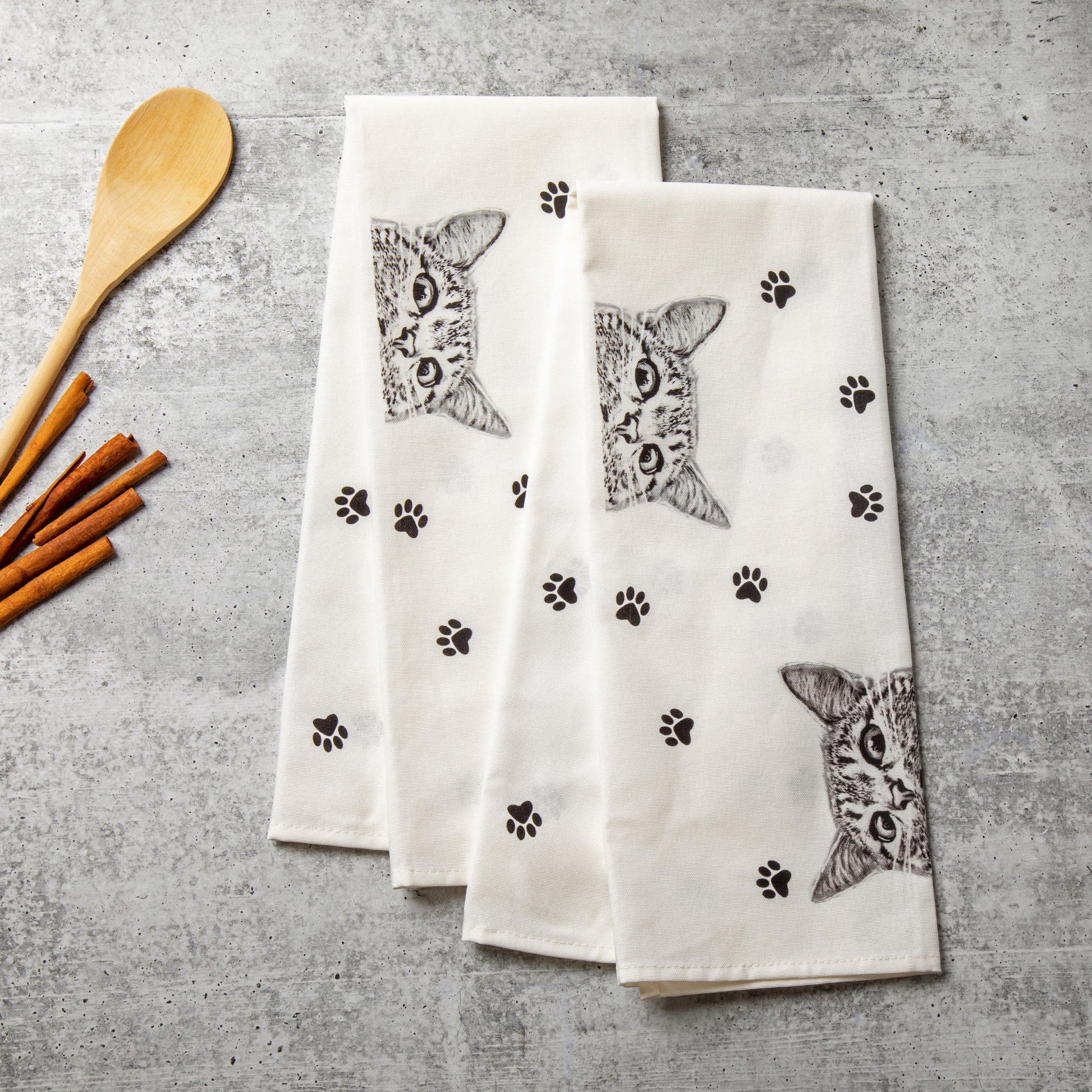 Adorably peeking out of the side of each set of two kitchen towels or pot holders are whiskered feline faces! Paw prints also pattern this black and white themed set, made with 100% cotton for a modern yet playful addition to your kitchen.
