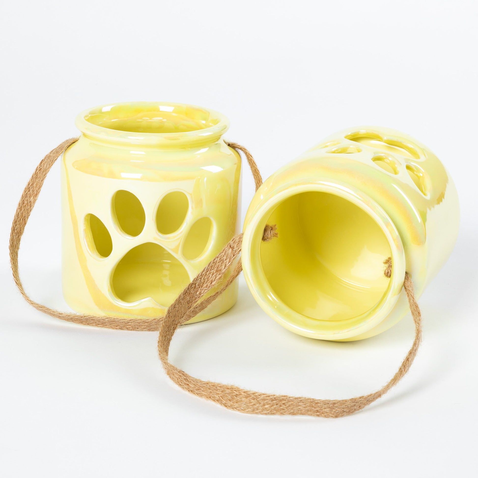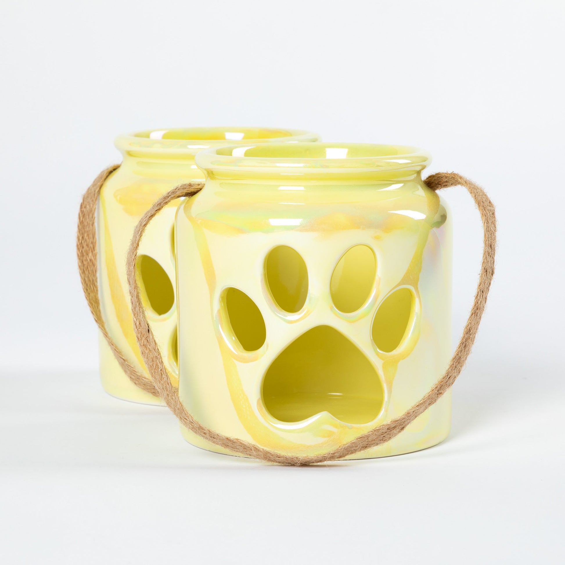 Create a serene paw printed ambiance with a colorful set of ceramic paw print candle holders -- perfect for indoor or outdoor use! With tiny votives or small pillar candles, each candle holder shines day or night with a beautiful pearlescent finish.