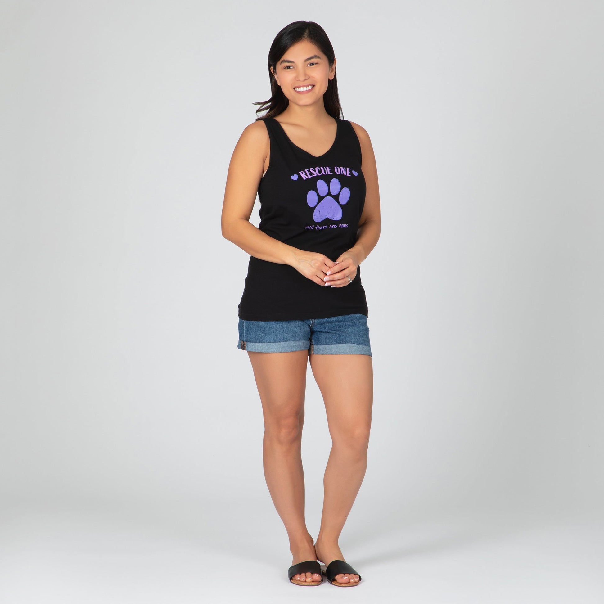 Support rescue pets with this thick strapped tank top that states the powerful message of "Rescue One Until There Are None". Made of a cotton and polyester blend this tank top is great for wearing on it's own or for layering.