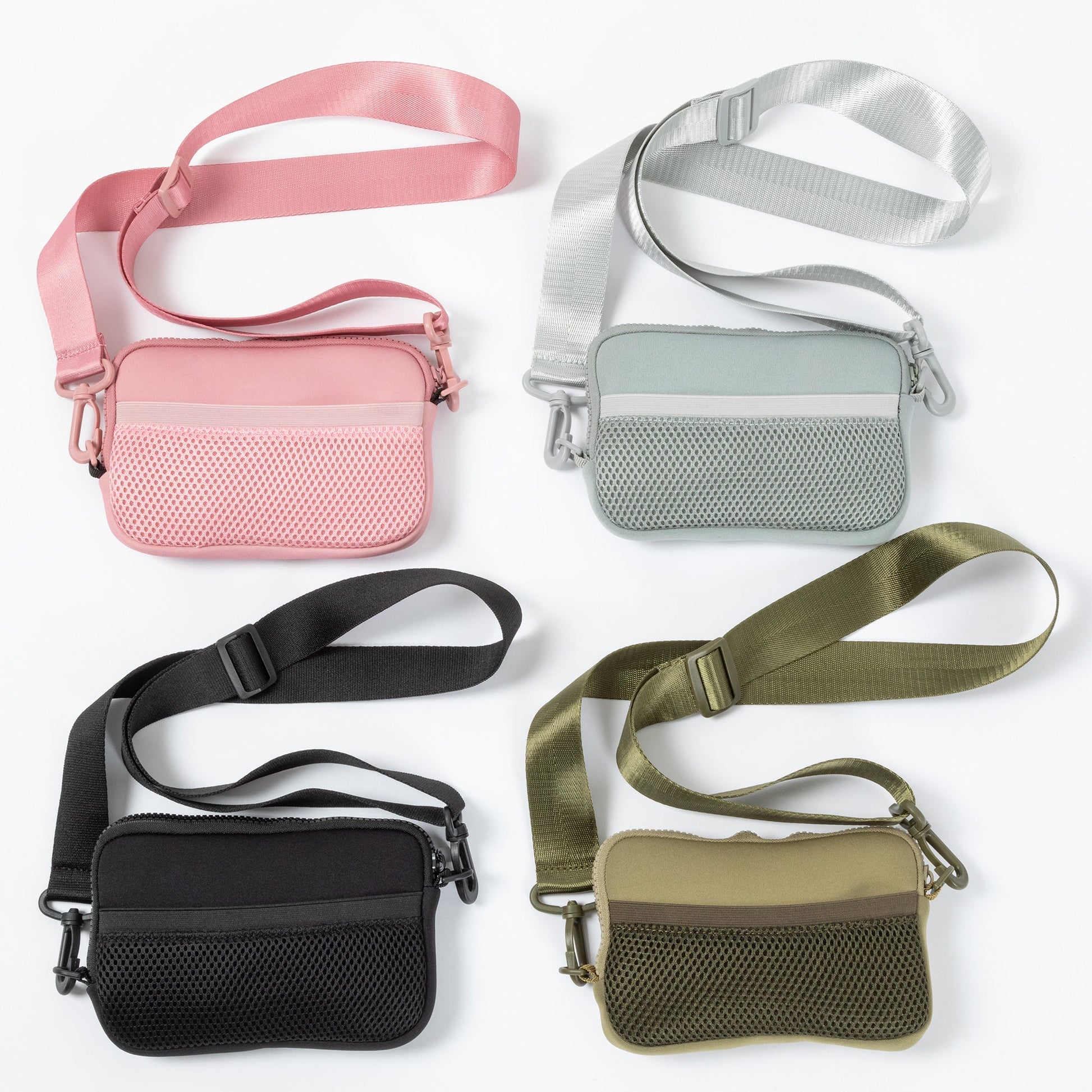 A minimalist's dream with a sporty look. Made with smooth, lightweight neoprene fabric, this crossbody bag features pockets inside and out, and an adjustable strap perfect for any length!