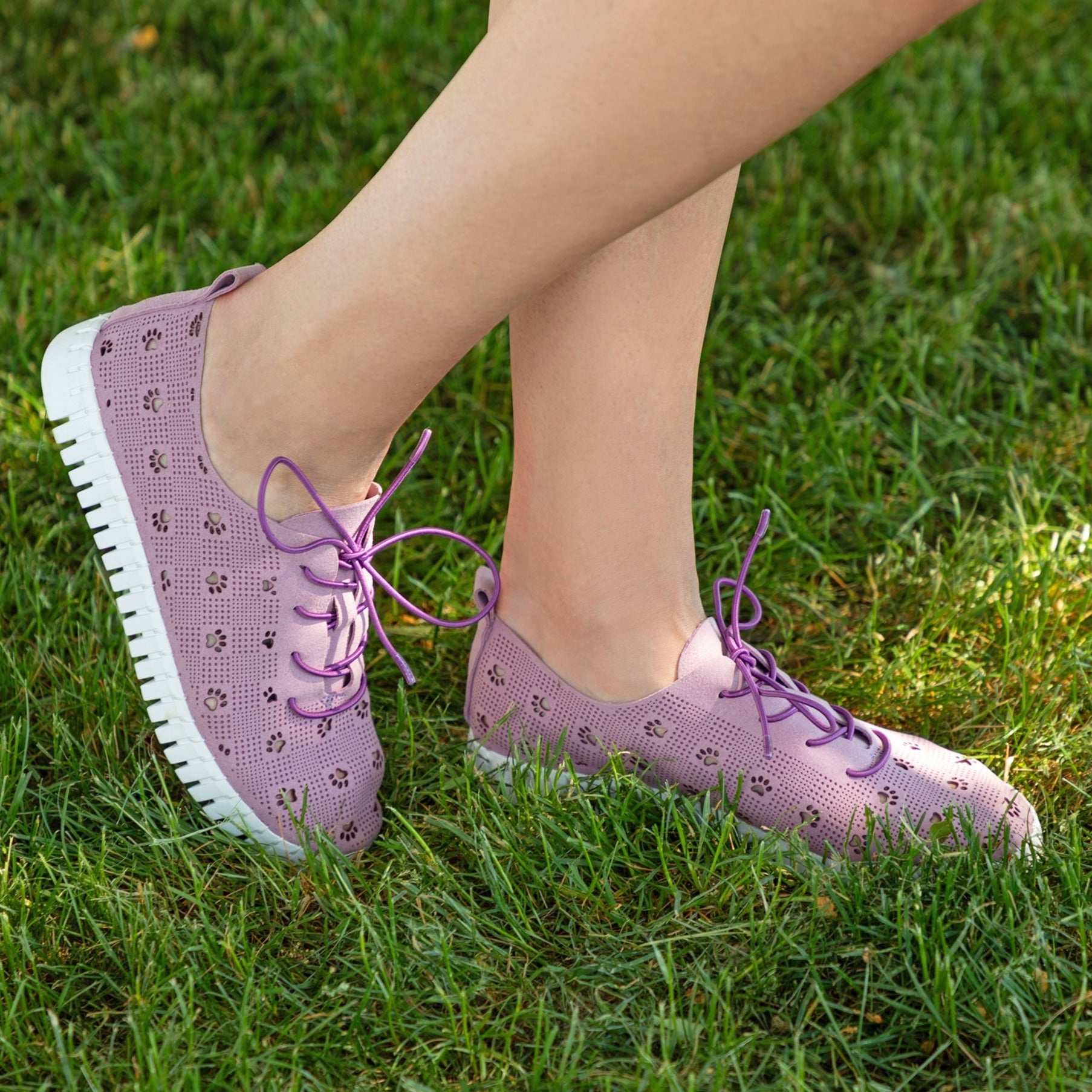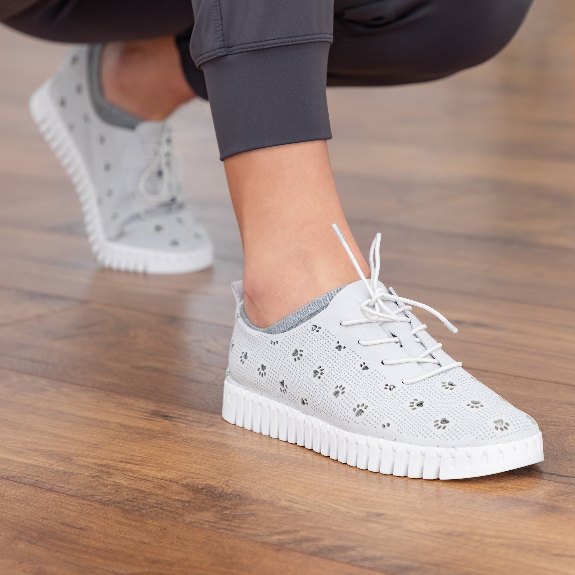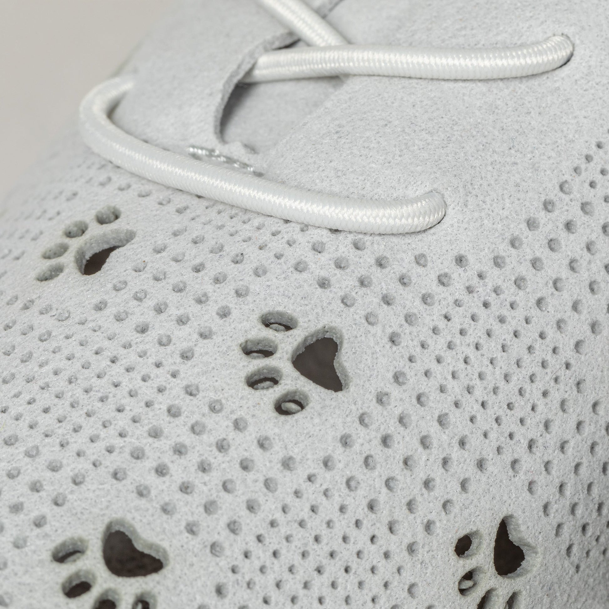 Patterned in cutout paw prints and a checker design on incredibly soft vegan leather, this casual pair of sneakers are your new everyday pair! Each pair features a gray or purple upper securely stitched to the clean white rubber outsole -- a brilliant blend of quality and animal advocacy.