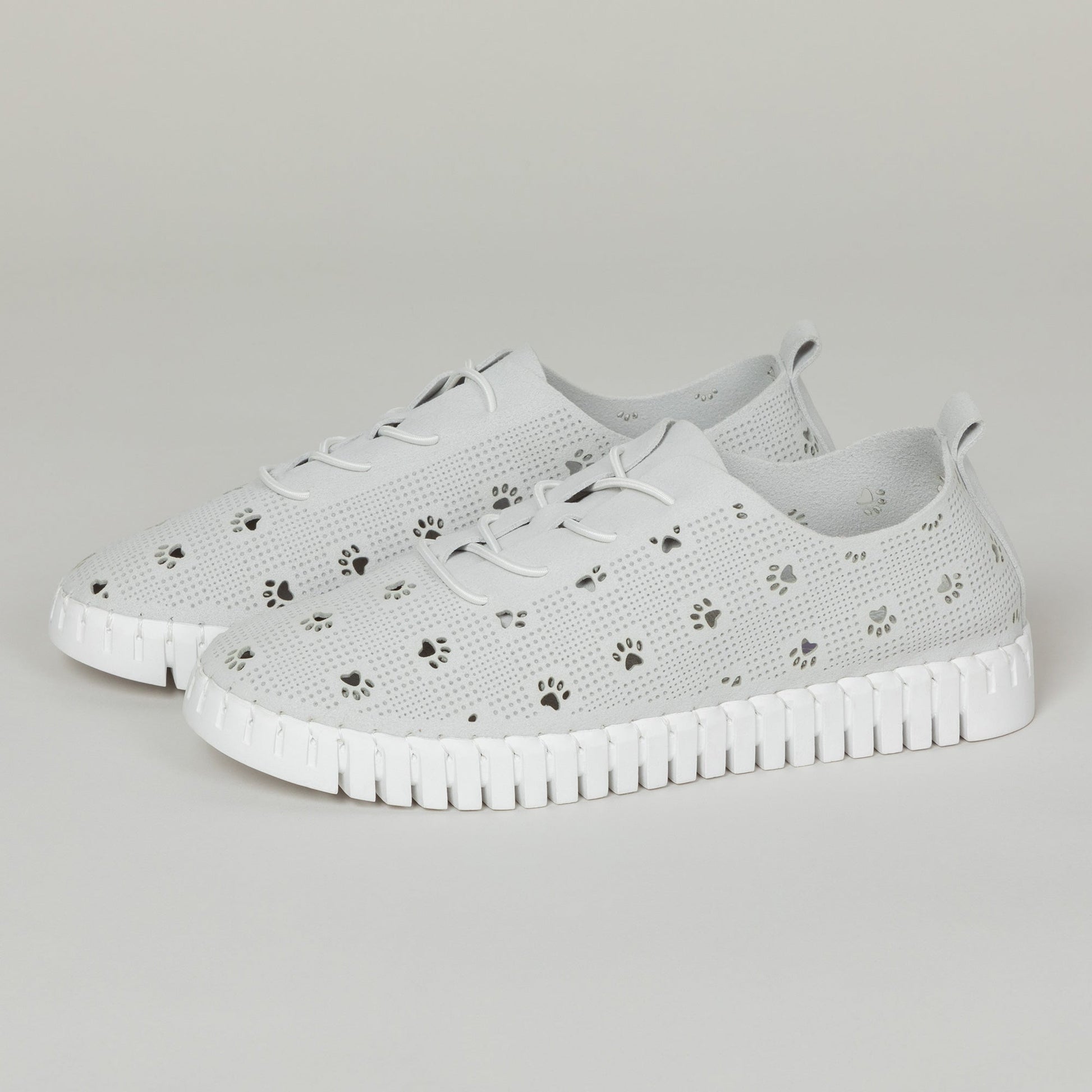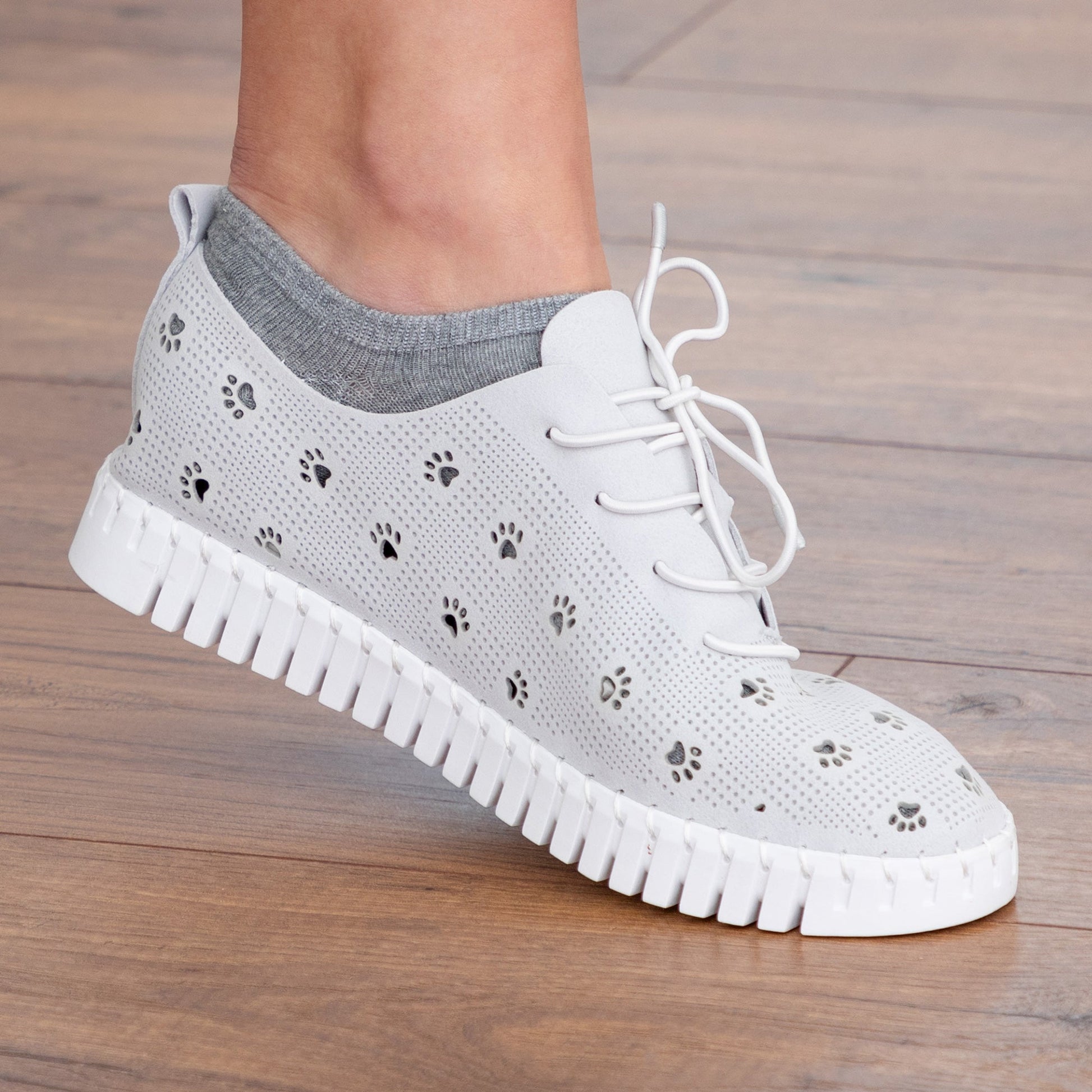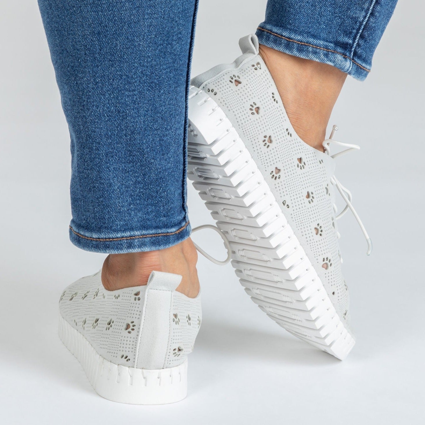 Patterned in cutout paw prints and a checker design on incredibly soft vegan leather, this casual pair of sneakers are your new everyday pair! Each pair features a gray or purple upper securely stitched to the clean white rubber outsole -- a brilliant blend of quality and animal advocacy.