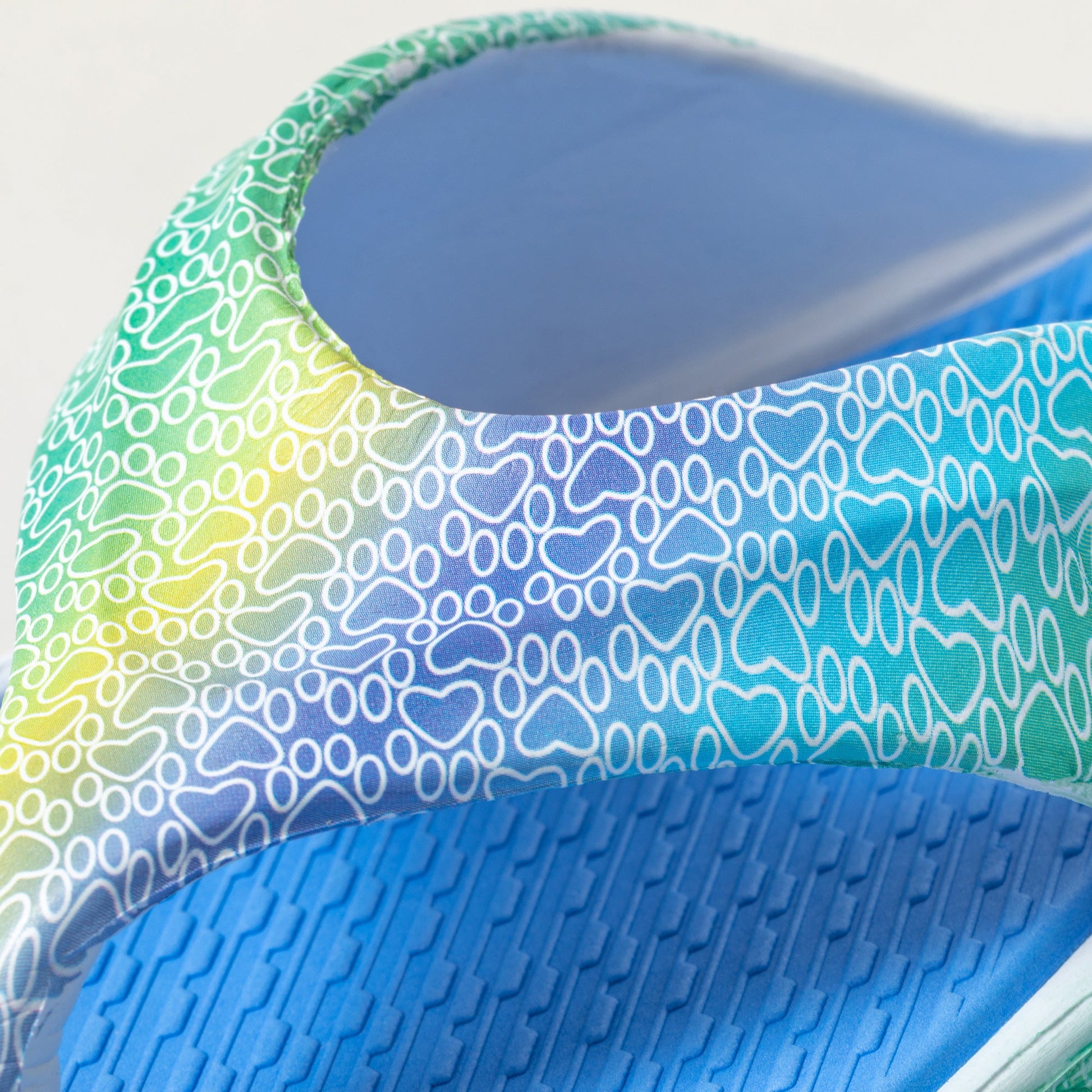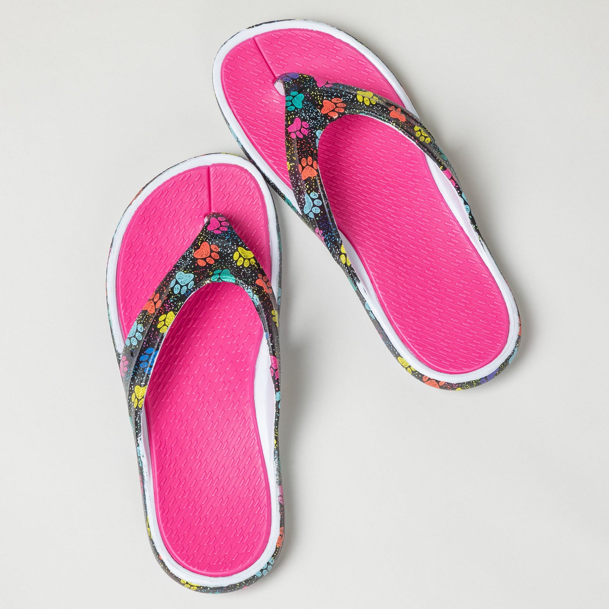 A pawsitively comfy addition to your warm weather footwear collection. These lightweight flip flops offer two different, and stylish paw print patterns and all-day comfort.