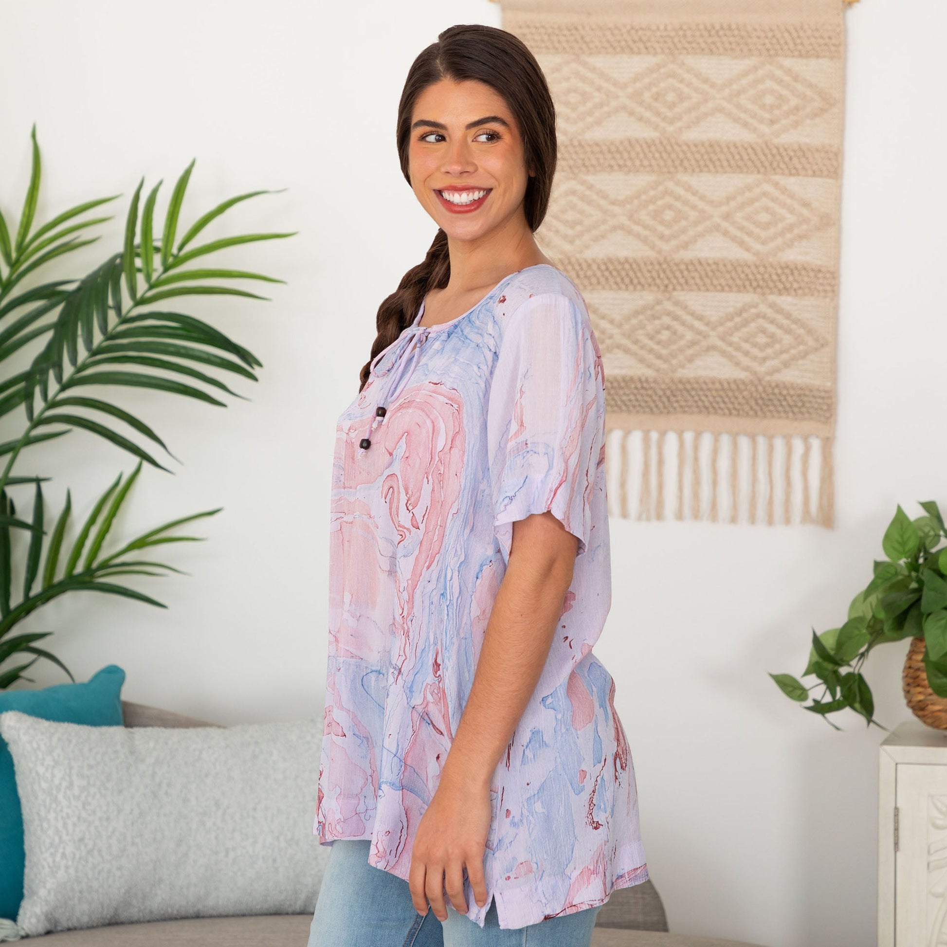With soft, breezy fabric and wooden bead accents on the front ties, this flowy short sleeve tunic blends femininity and comfort! Made with a marbled design throughout in pinks and purples, and cut in breezy yet flattering fit.