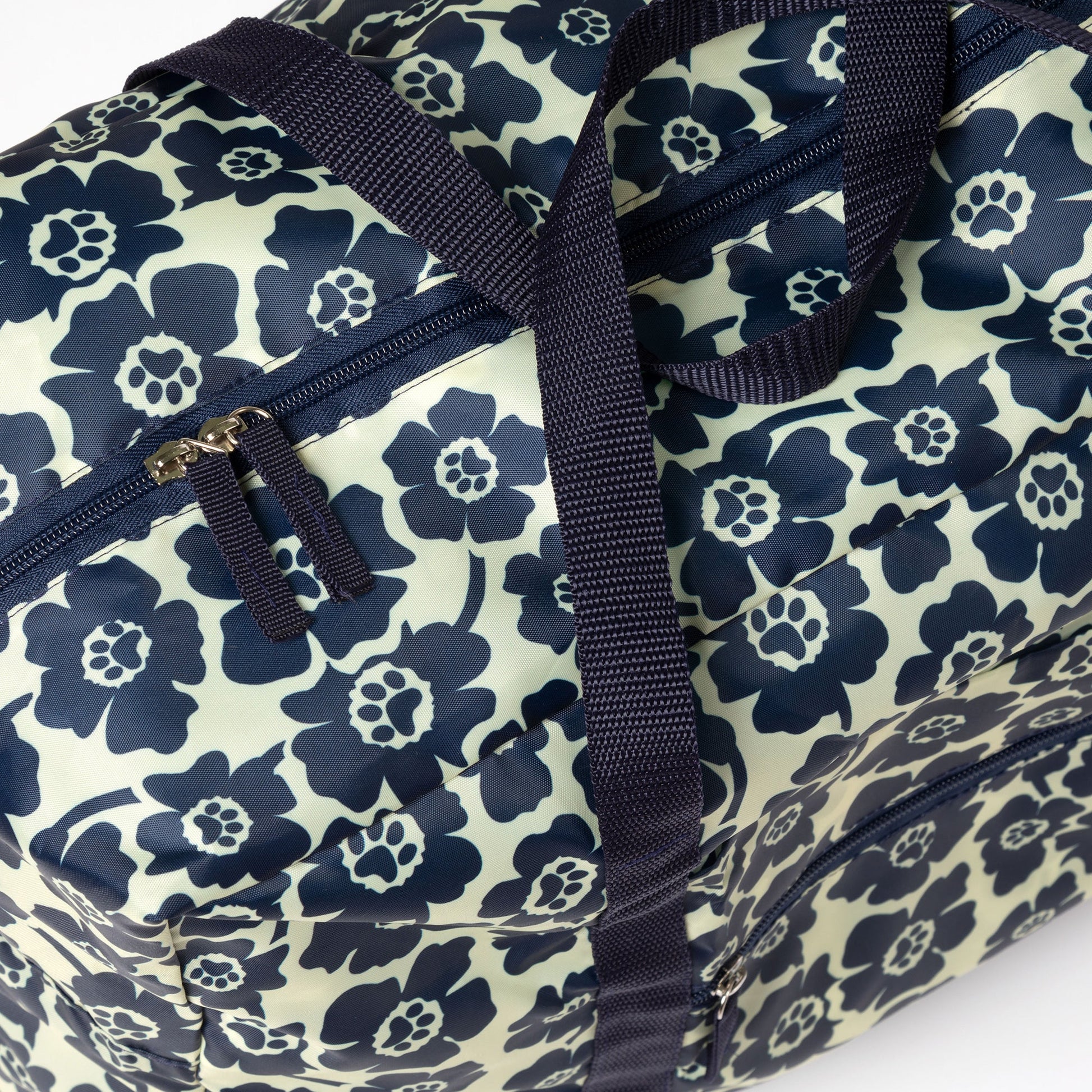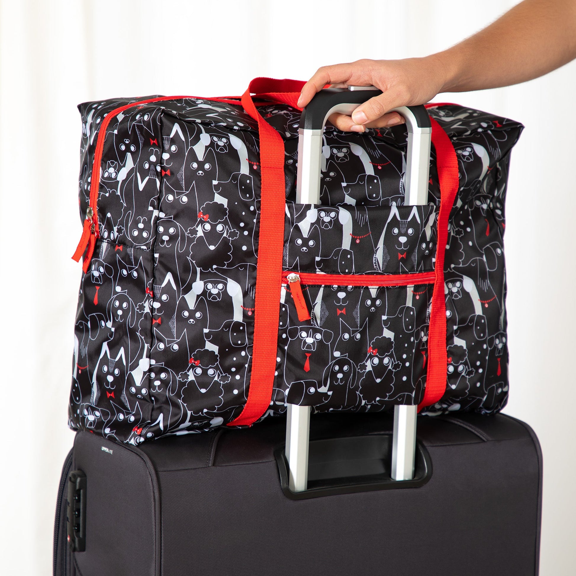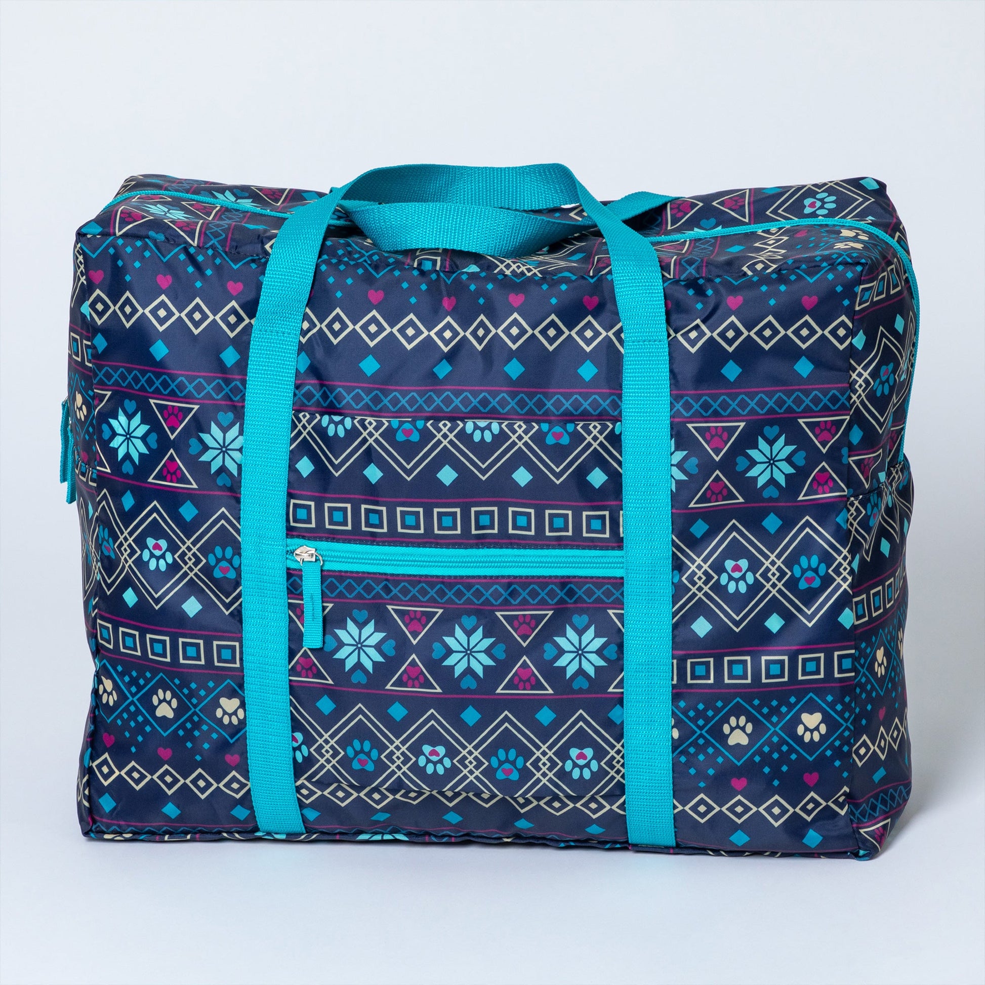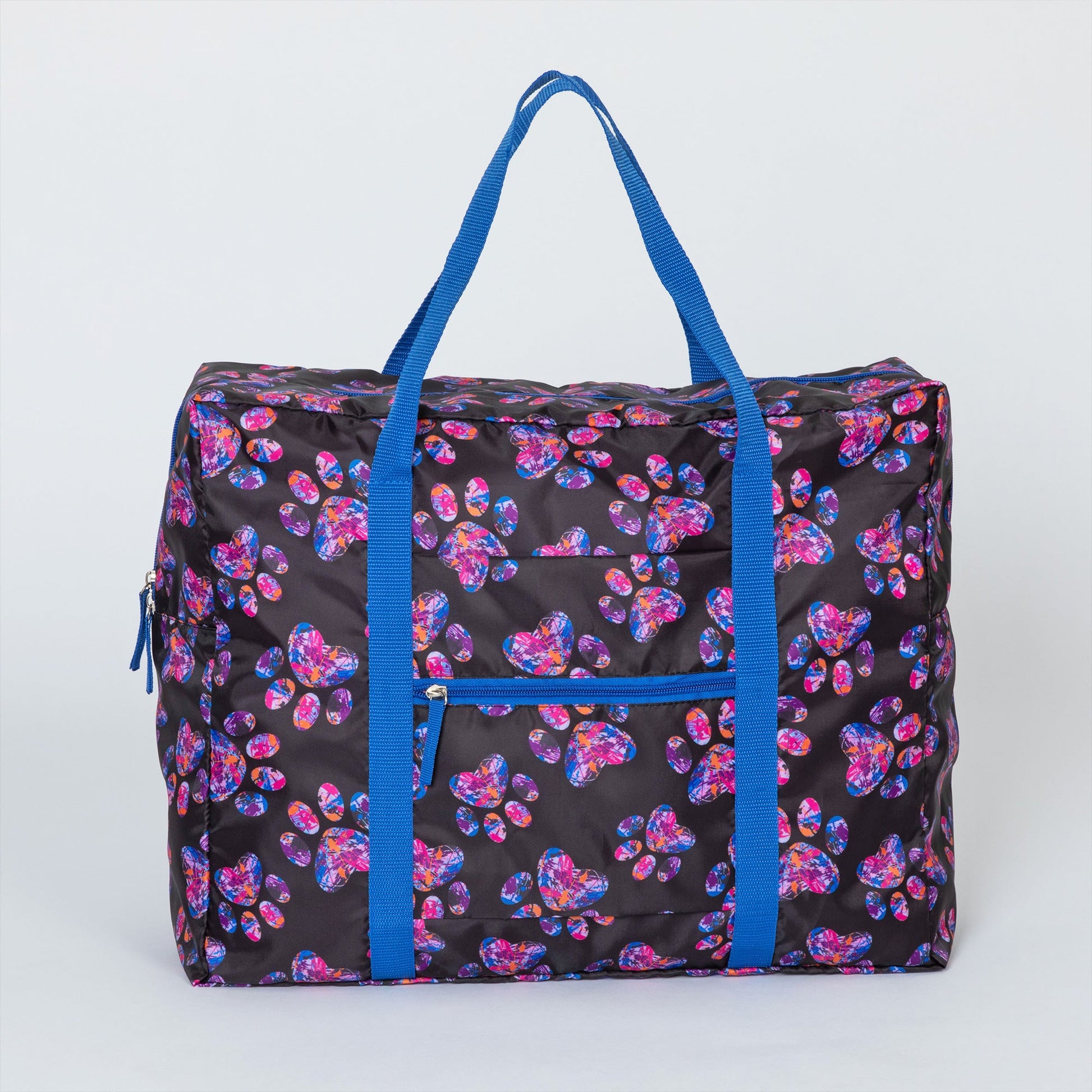 A frequent traveler's must-have duffel! Made with a super lightweight, packable, durable polyester patterned with colorful prints and a front zipper pocket for organized storage. Plus, the trolley sleeve on the bag makes it easy to loop onto your suitcase handle while you're on the move!