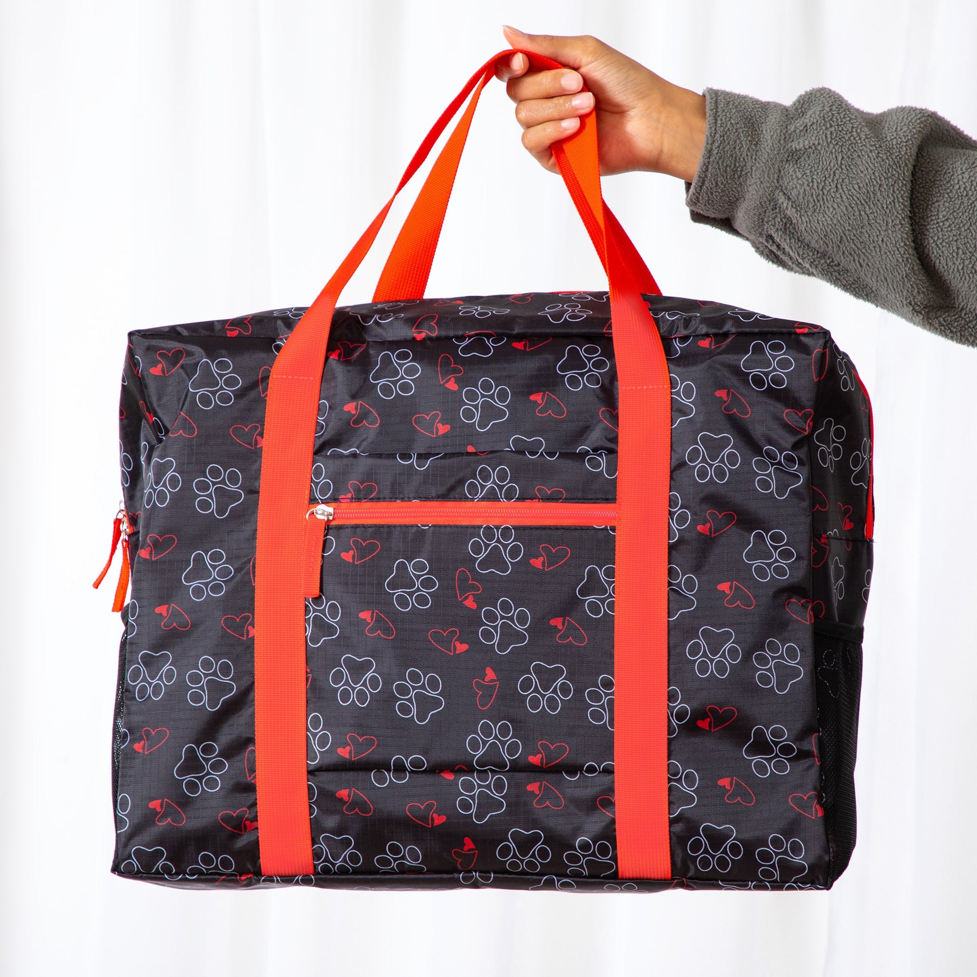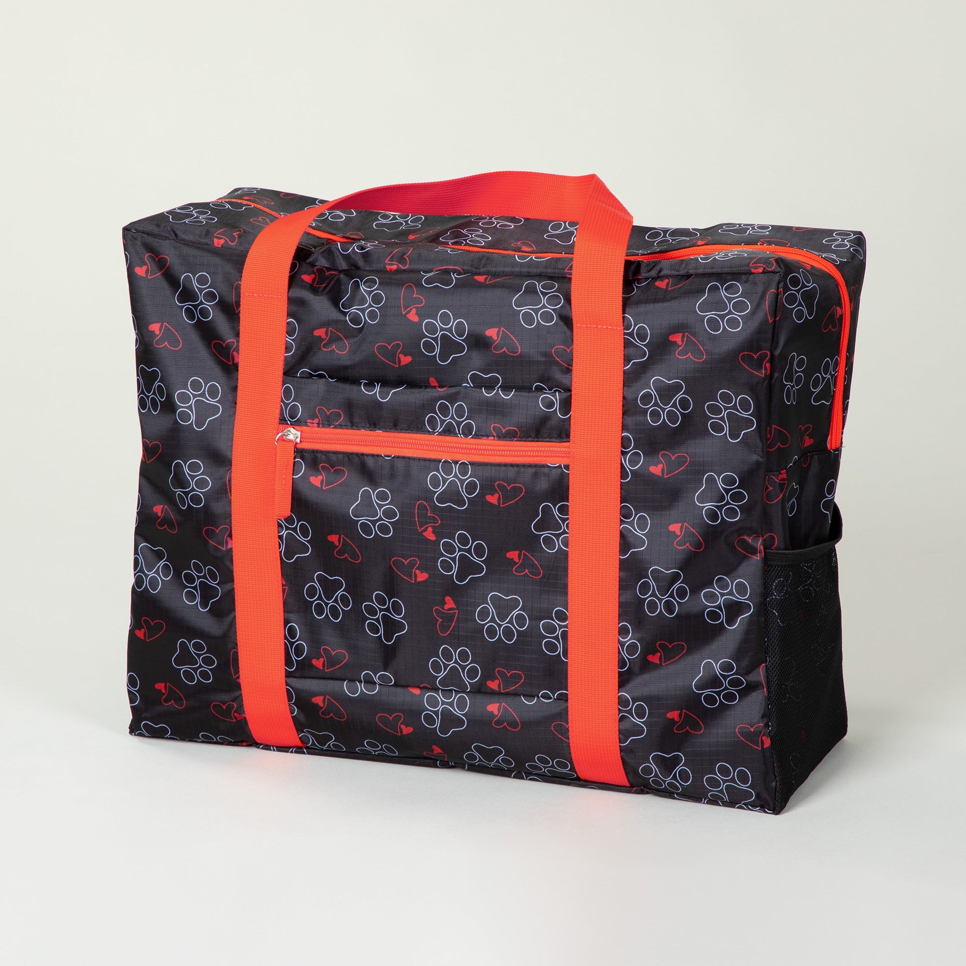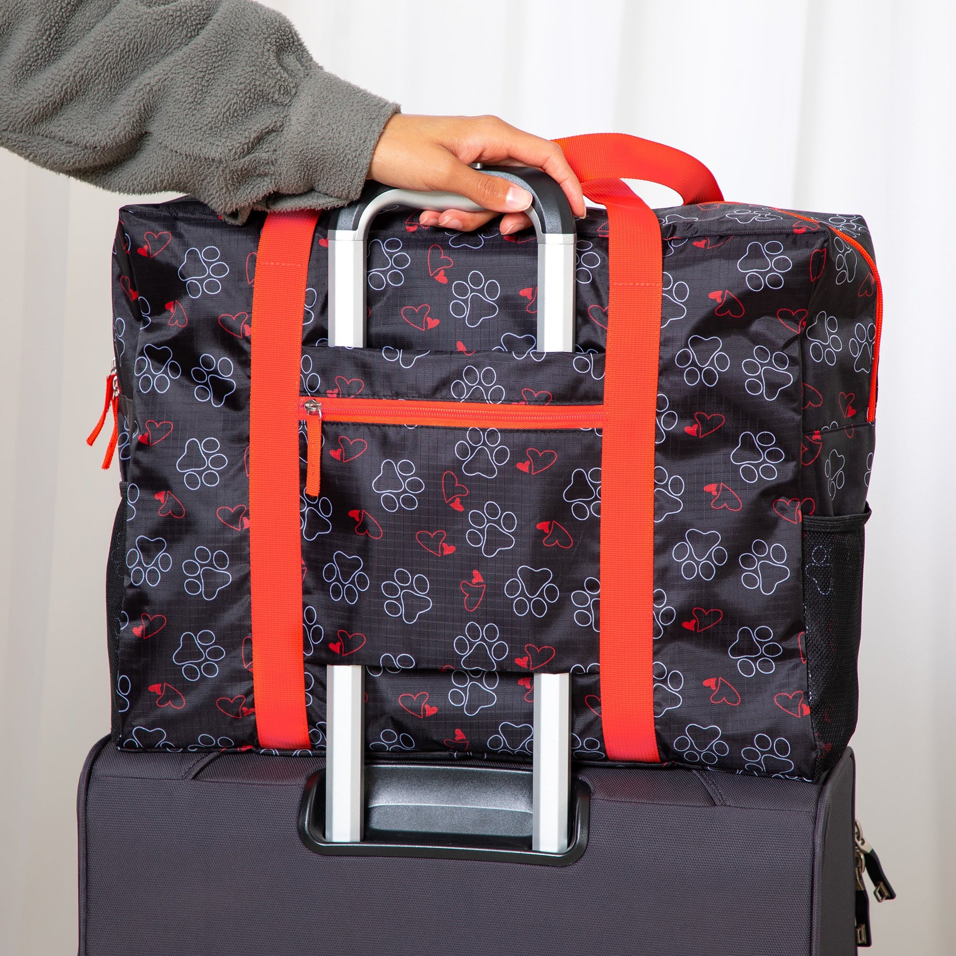 With paws and more paws, this bag is perfect for any animal lover! Made with a spacious interior and an easy to zip top, this super lightweight polyester duffel also features a convenient front pocket, and a slide through feature to attach it to your rolling suitcase.