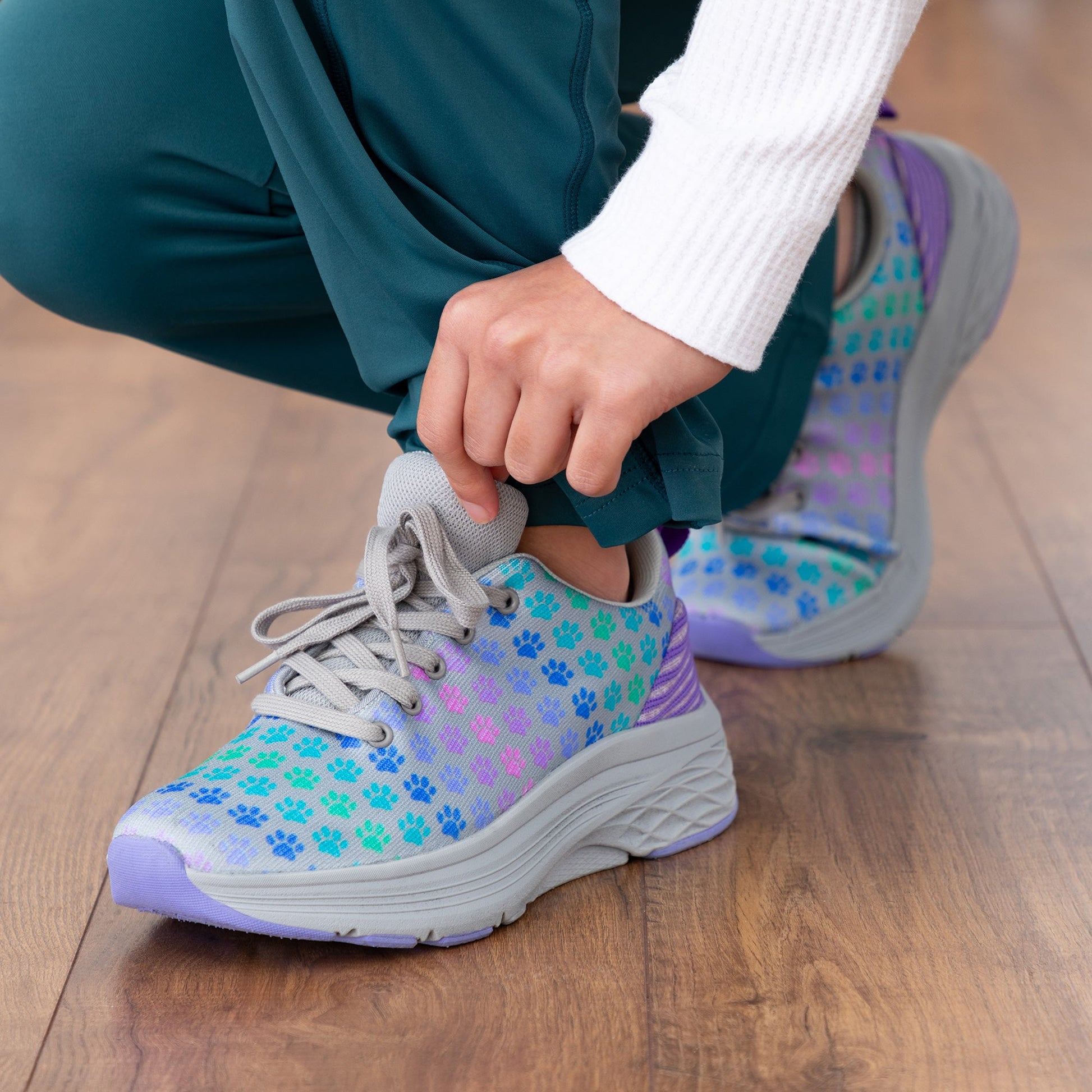 Rainbow rows of paw prints wrap around this versatile gray pair of walking shoes! Featuring a lightweight yet thick EVA rubber sole that provides a cushioned feel with every step, offering better balance and support. Complete with secure laces for the perfect fit, each colorful pair provides comfort for all-day wear.