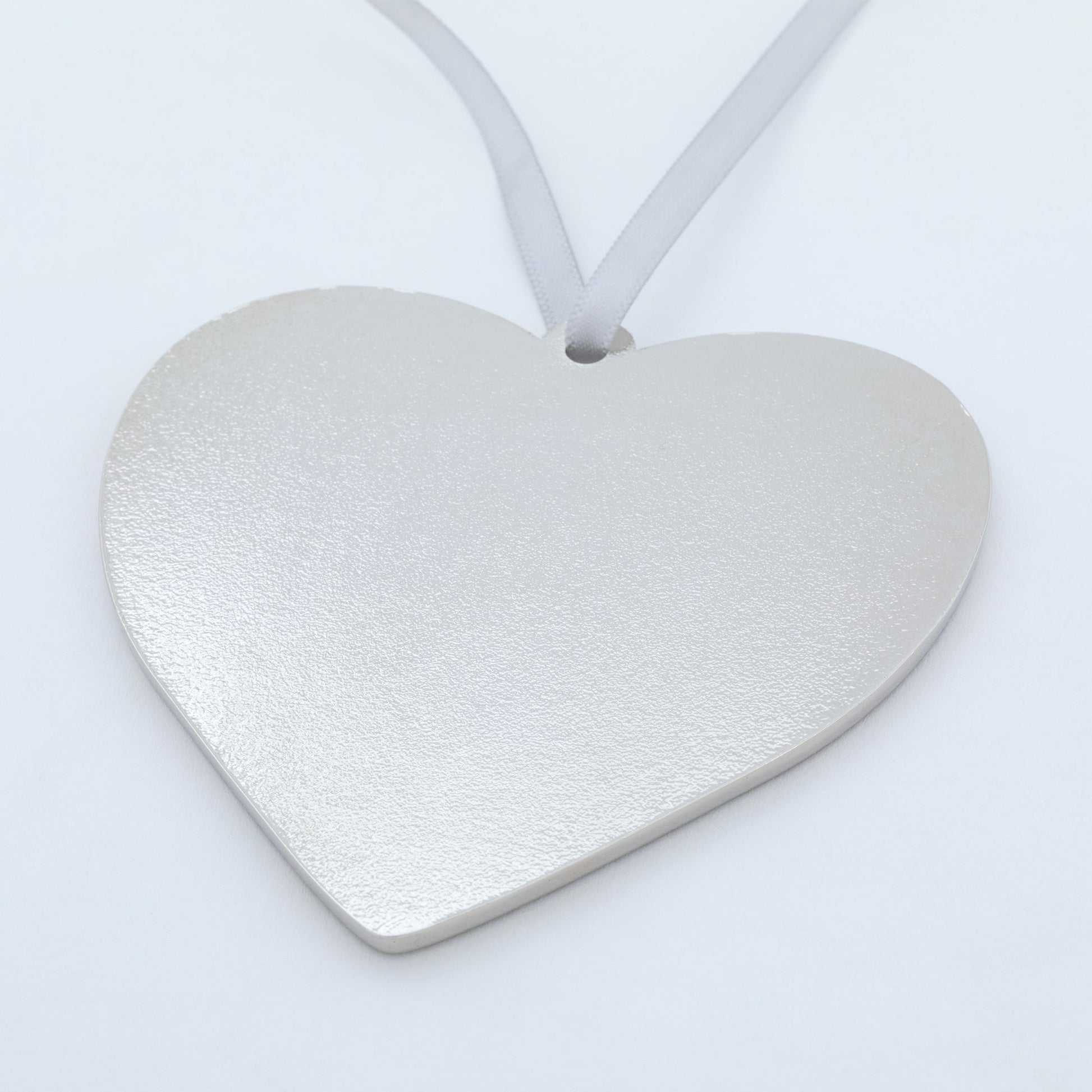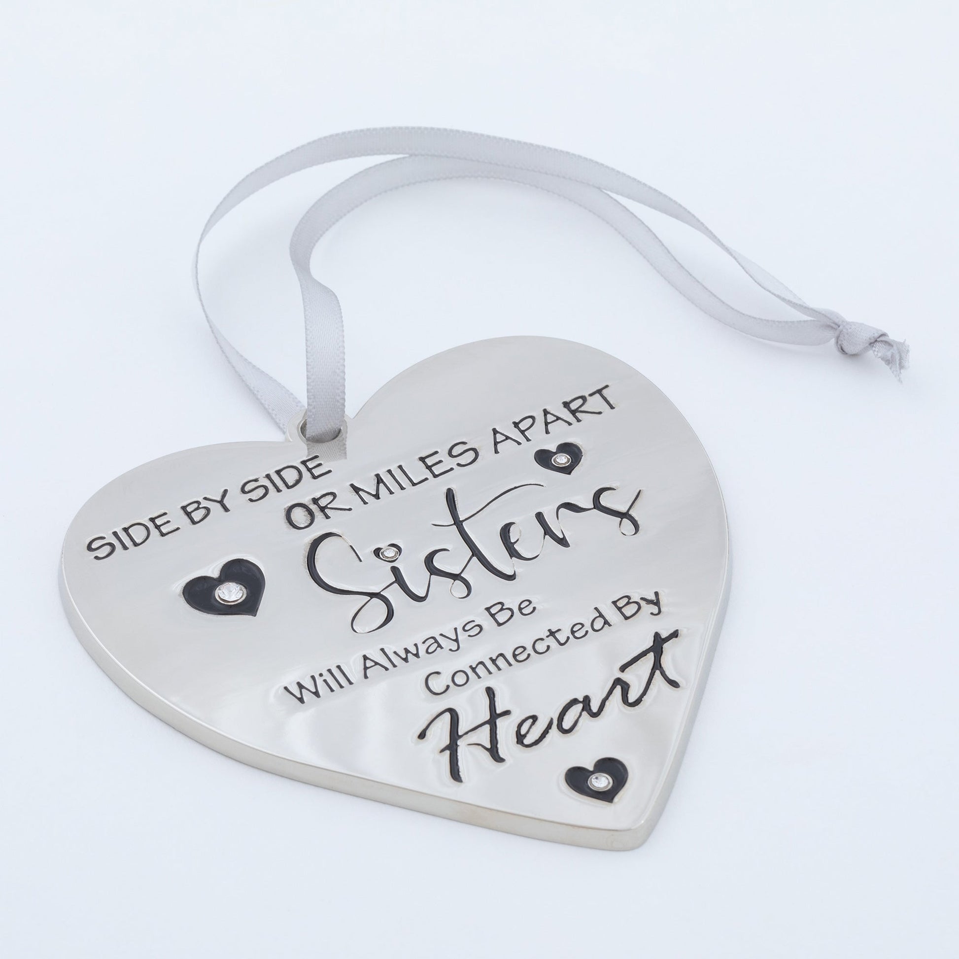 Brushed silver metal with hearts and sparkling rhinestones accent this beautifully engraved ornament which reads: "Side by side or miles apart sisters will always be connected by heart." The perfect bit of decor that reminds you of your sister or sisters near and far!